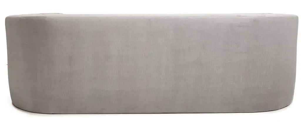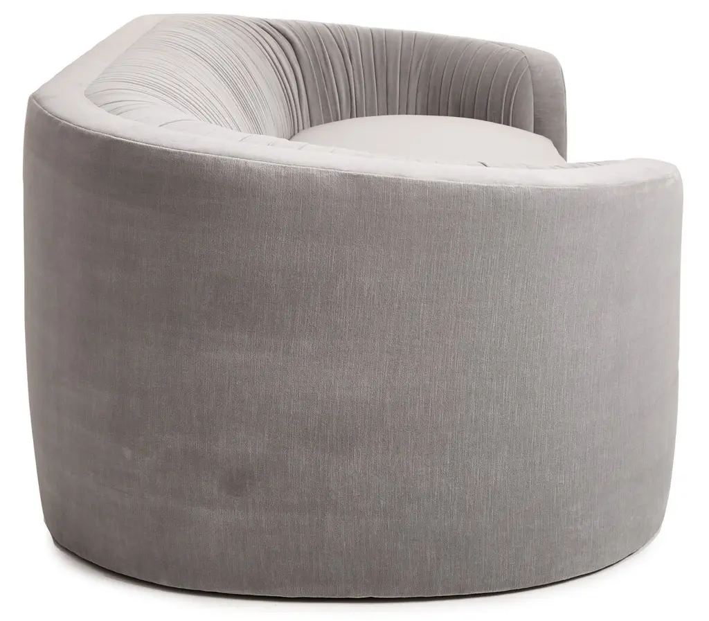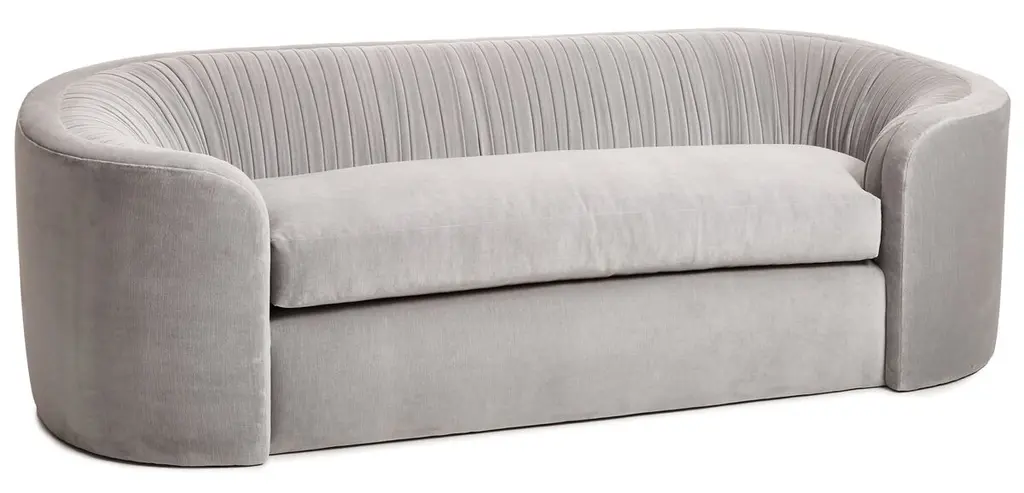 Designed by us and available only at One Kings Lane: Defined by a rounded silhouette with a tight back and wonderfully textural hand-ruching, this sofa lends a modern mood to any space. Its plush velvet upholstery is filled with feather and down and bolstered to a sturdy alder frame for long-lasting comfort and support. Made in the USA.