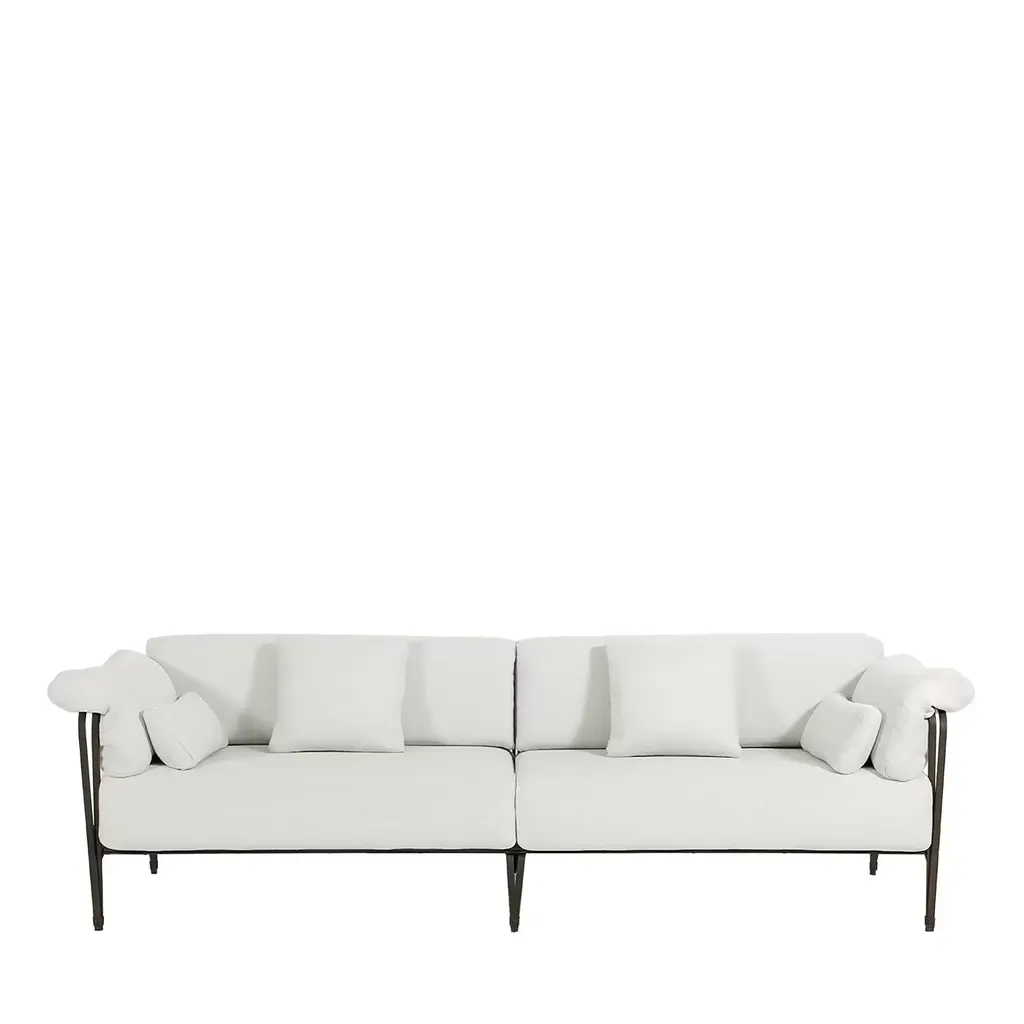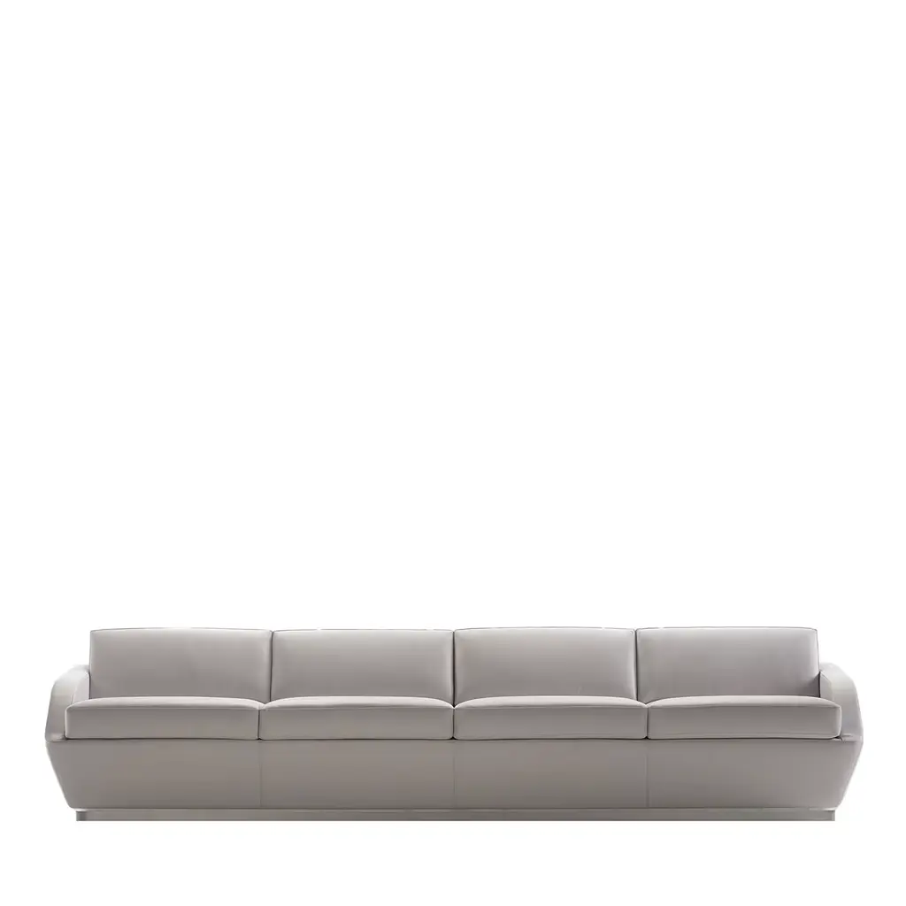 Exuding contemporary sophistication, this ice-white leather sofa designed by Giuseppe Bavuso seamlessly blends style and comfort. Its wooden frame, enveloped in polyurethane foam and goose down, ensures durability and plushness. The sleek aluminum base and feet, available in a range of polished or lacquered finishes, add a touch of modernity. With seat cushions crafted from high-density polyurethane foam and quilted with sterilized feathers, this sofa offers unparalleled comfort.