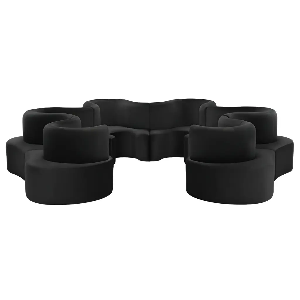 Sweeping, sculptural curves shape this modular seating system, designed to support shared experiences while maintaining personal comfort. The Cloverleaf Sofa is composed of interlocking units that provide seating on both the inner and outer sides, encouraging conversation from multiple angles. Each section is constructed with a durable wooden frame and high-resilience CMHR foam, then fully upholstered in a range of fabric options. With flexible configurations and optional plinth bases, the system can be adapted to suit various spaces, from open lounges to more defined seating areas.
