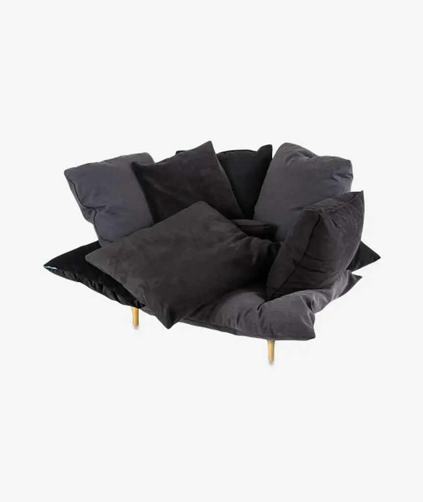 Oversize cushions become the sofa of excellence. A vision of outstanding comfort that becomes an aesthetic statement thanks to fabrics texture and shades of blue, white and black. A sofa and a chair to sink into.Comfy is an upholstery collection created in collaboration with Marcantonio. An ode to comfort, with a soft nest of cushions nestled in both the sofa and armchair versions. "I tried to create the ideal piece. I remember playing as a child by building a hiding place on the couch using the seat and backrest cushions. I think we all share the same wish of wanting to be enveloped in a soft nest where the cushions can be placed however we want" states the designer. The brass metal feet add value to the products, and are available in threecolorways, in a turquoise, white, and anthracite color range. The cushions that make up Comfy are made of different fabrics, whose motifs give rise to an interesting surface color contrast.