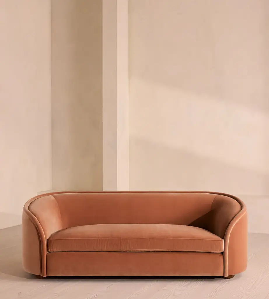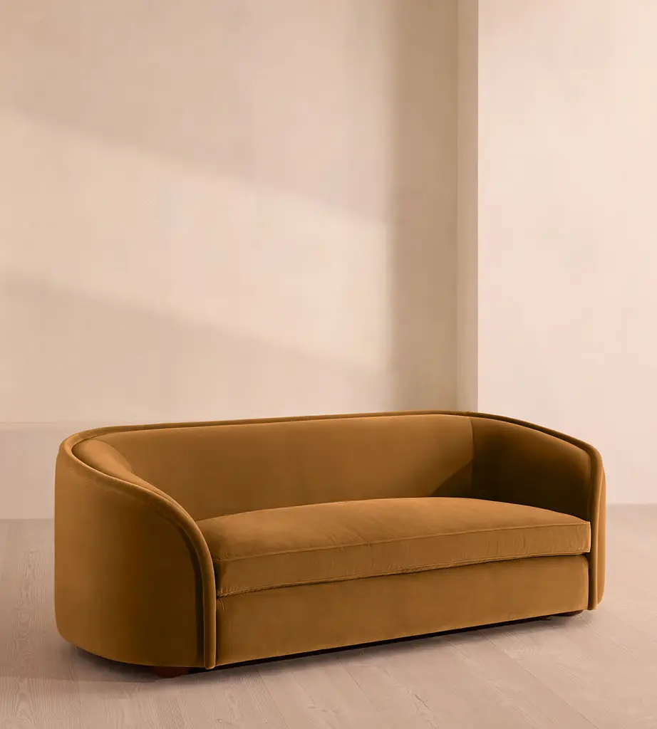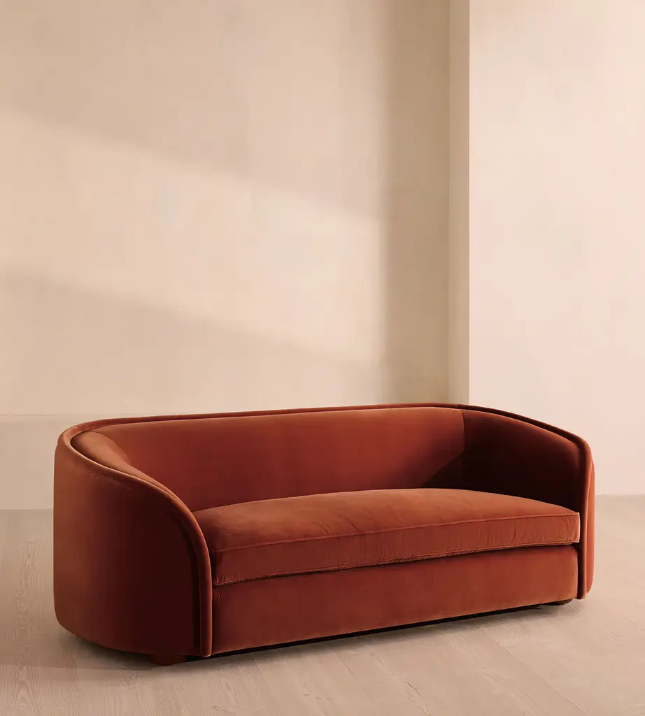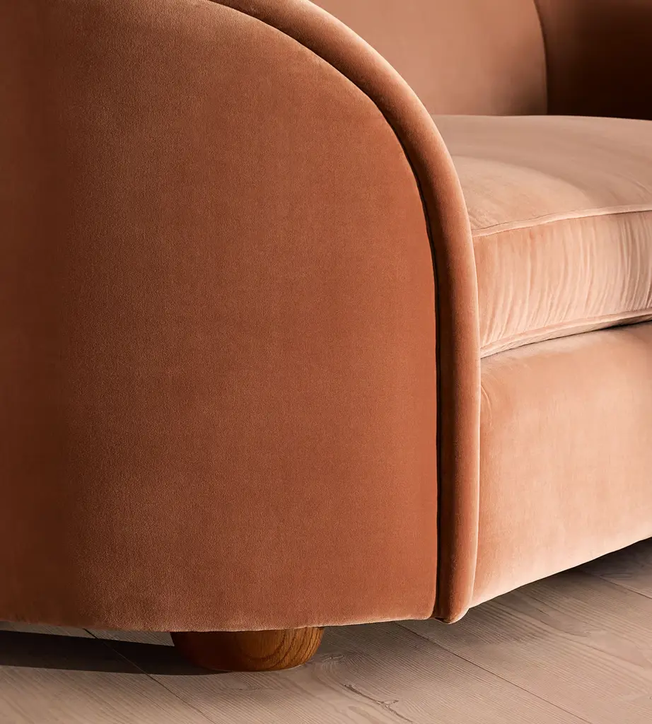 A curved backrest leads seamlessly into two arms to create a minimalist, cocooning shape. A seamless seat cushion alongside unified back and armrests give the Conall sofa a streamlined, minimalist silhouette, while the rounded sides keep it feeling cozy. It's fully upholstered in velvet, available in our full made-to-order palette, with bold, oversized piping following its curved lines.