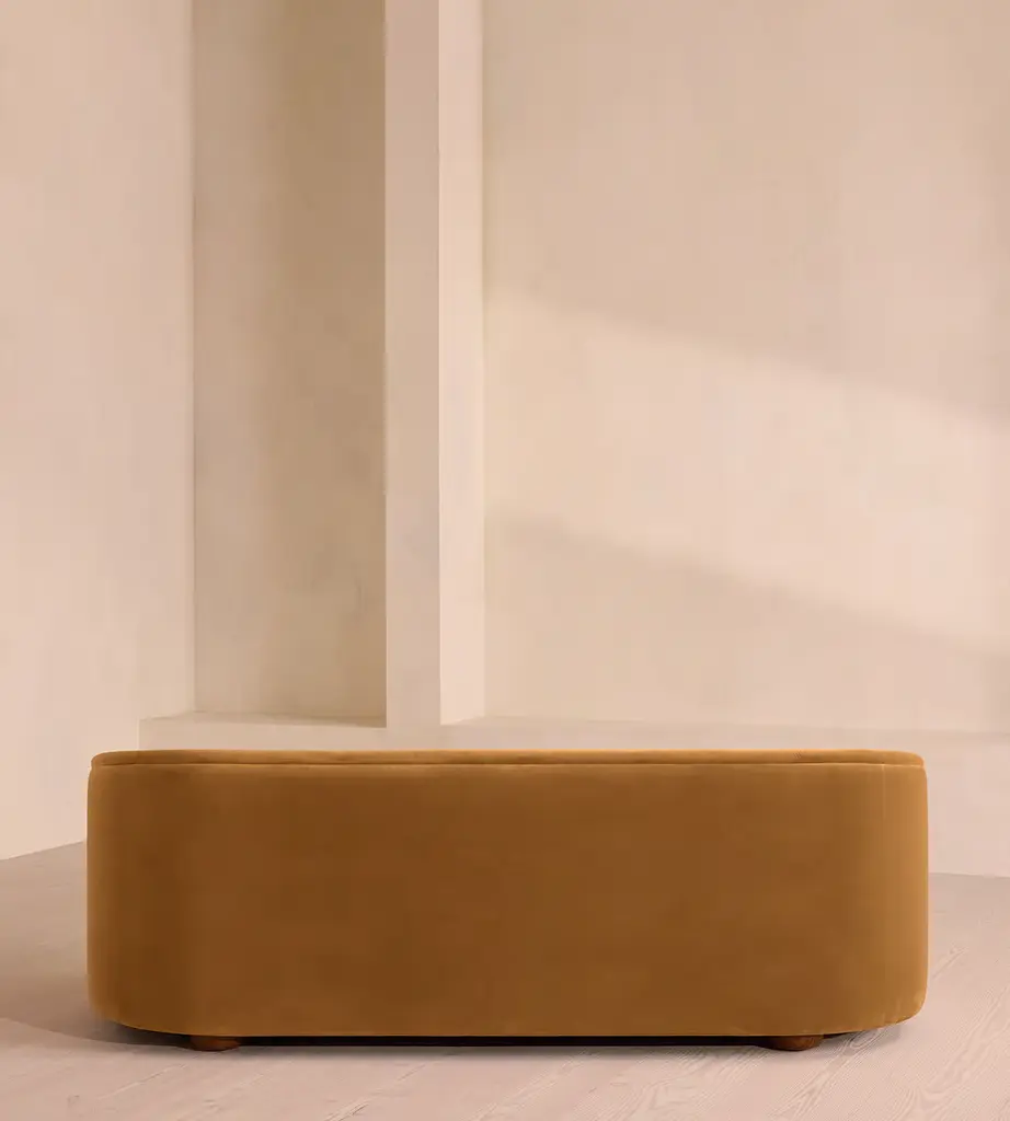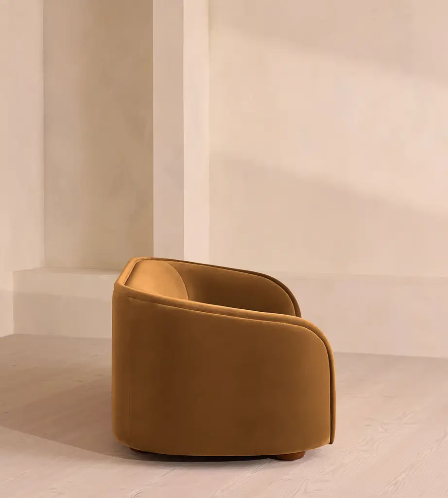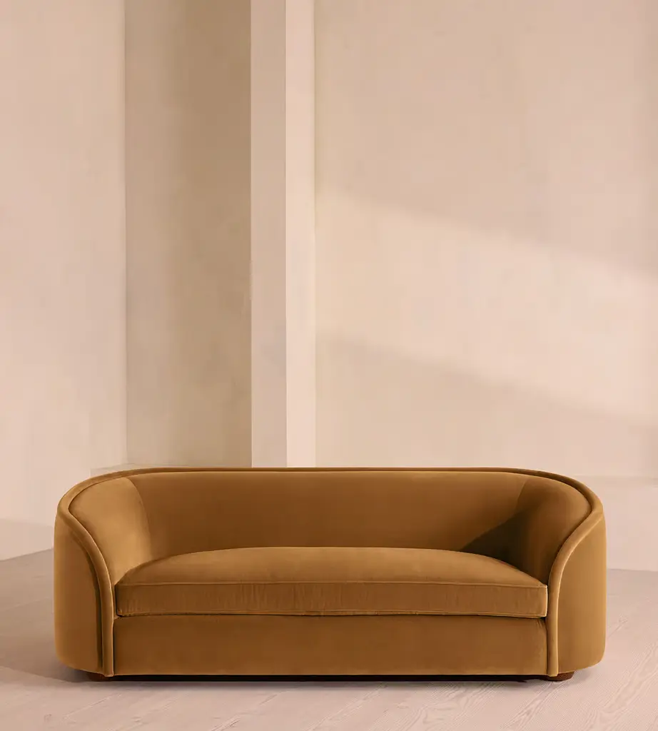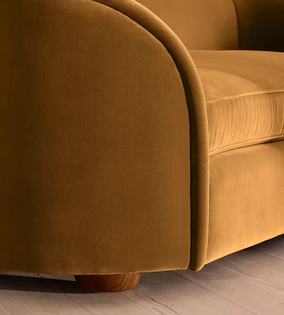 A curved backrest leads seamlessly into two arms to create a minimalist, cocooning shape. A seamless seat cushion alongside unified back and armrests give the Conall sofa a streamlined, minimalist silhouette, while the rounded sides keep it feeling cozy. It's fully upholstered in velvet, available in our full made-to-order palette, with bold, oversized piping following its curved lines.