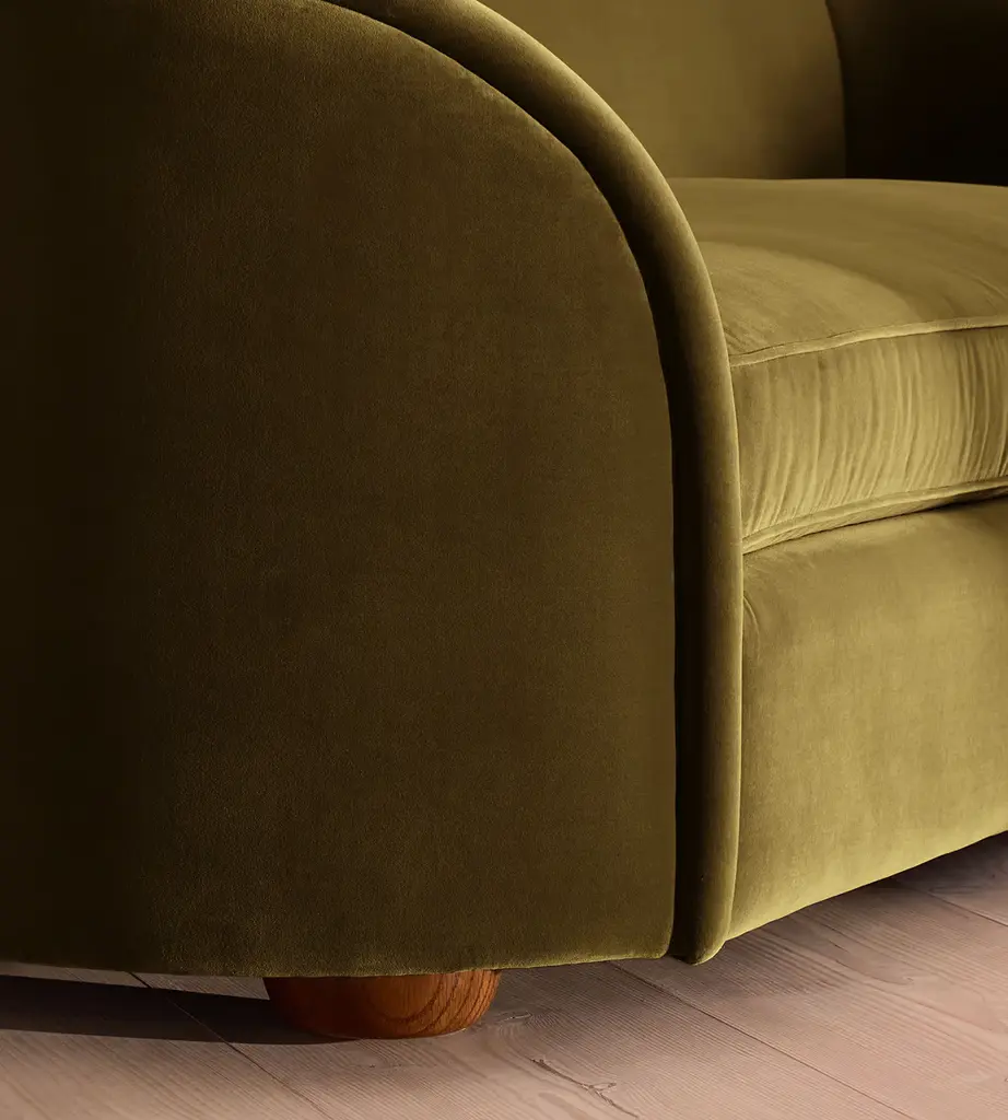 A curved backrest leads seamlessly into two arms to create a minimalist, cocooning shape. A seamless seat cushion alongside unified back and armrests give the Conall sofa a streamlined, minimalist silhouette, while the rounded sides keep it feeling cozy. It's fully upholstered in velvet, available in our full made-to-order palette, with bold, oversized piping following its curved lines.
