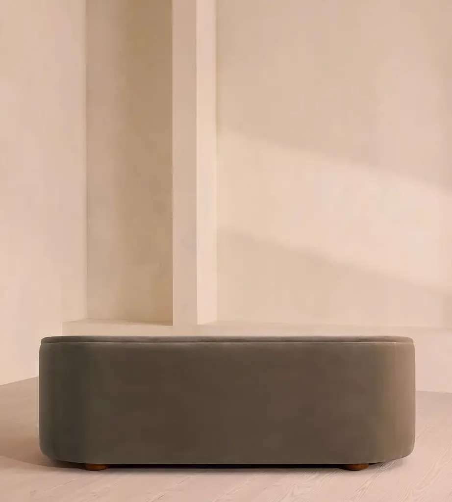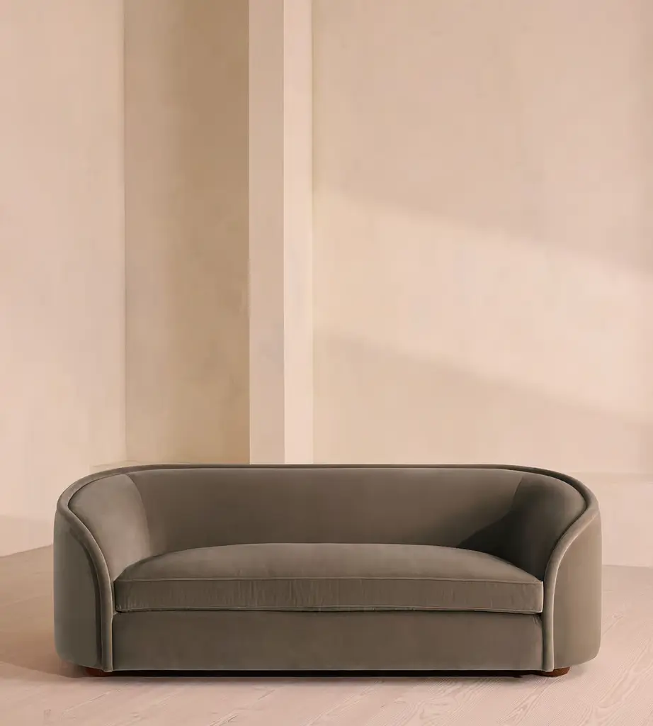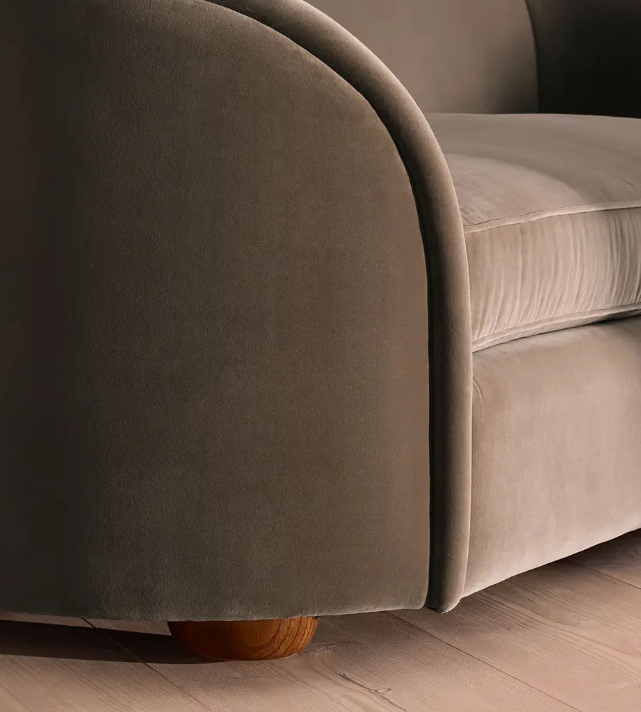 A curved backrest leads seamlessly into two arms to create a minimalist, cocooning shape. A seamless seat cushion alongside unified back and armrests give the Conall sofa a streamlined, minimalist silhouette, while the rounded sides keep it feeling cozy. It's fully upholstered in velvet, available in our full made-to-order palette, with bold, oversized piping following its curved lines.