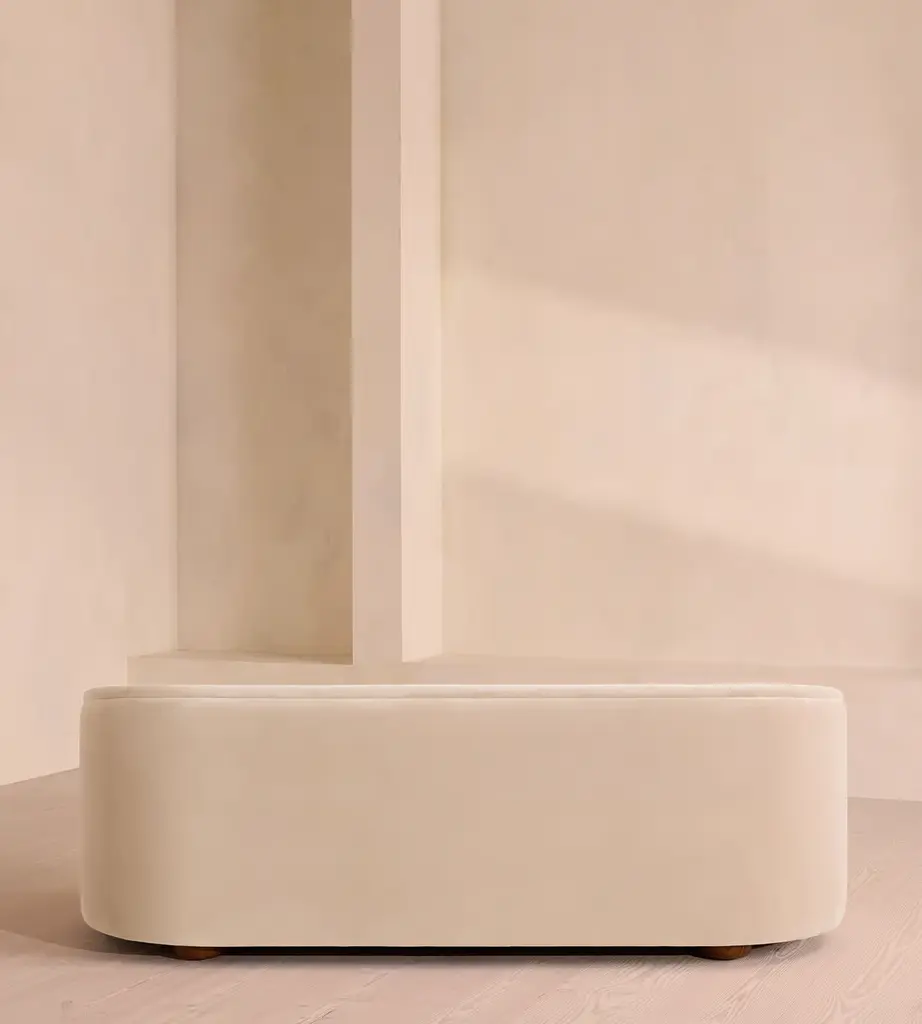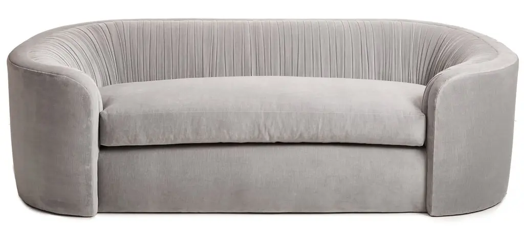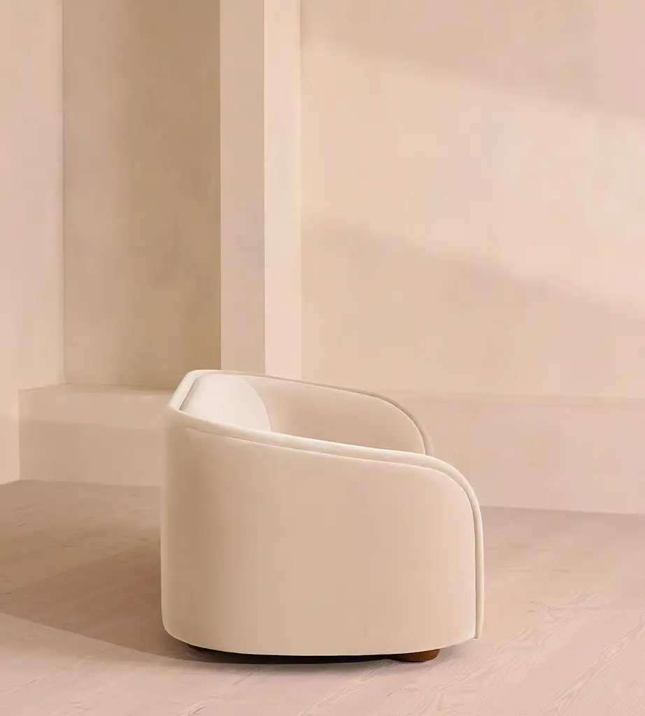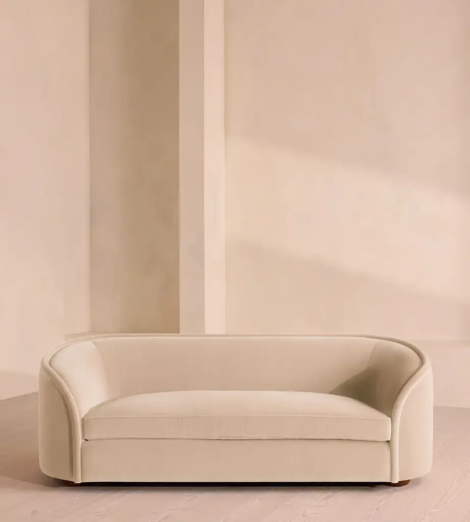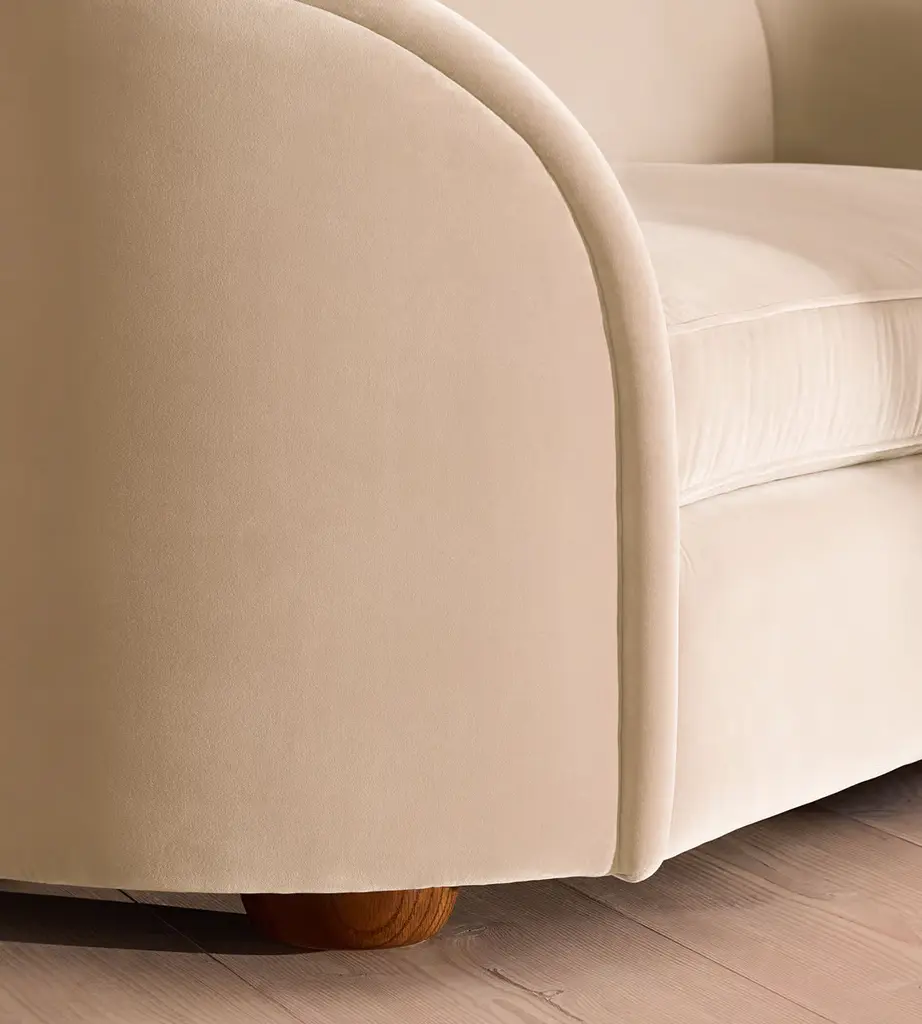 A curved backrest leads seamlessly into two arms to create a minimalist, cocooning shape. A seamless seat cushion alongside unified back and armrests give the Conall sofa a streamlined, minimalist silhouette, while the rounded sides keep it feeling cozy. It's fully upholstered in velvet, available in our full made-to-order palette, with bold, oversized piping following its curved lines.