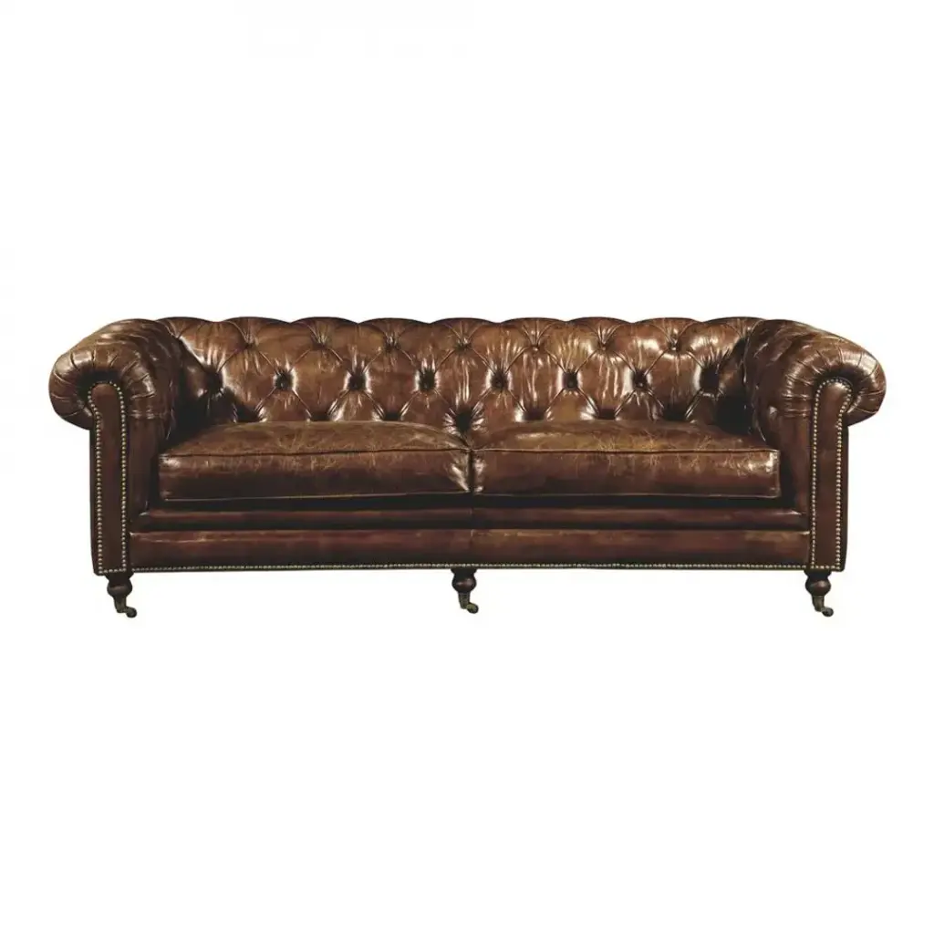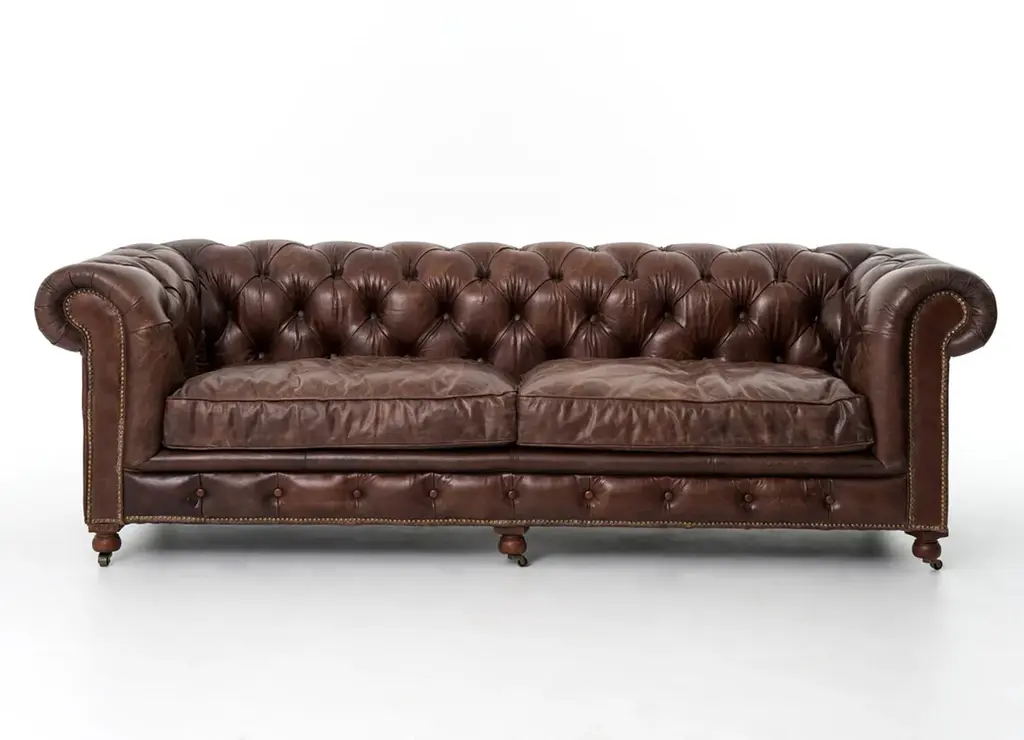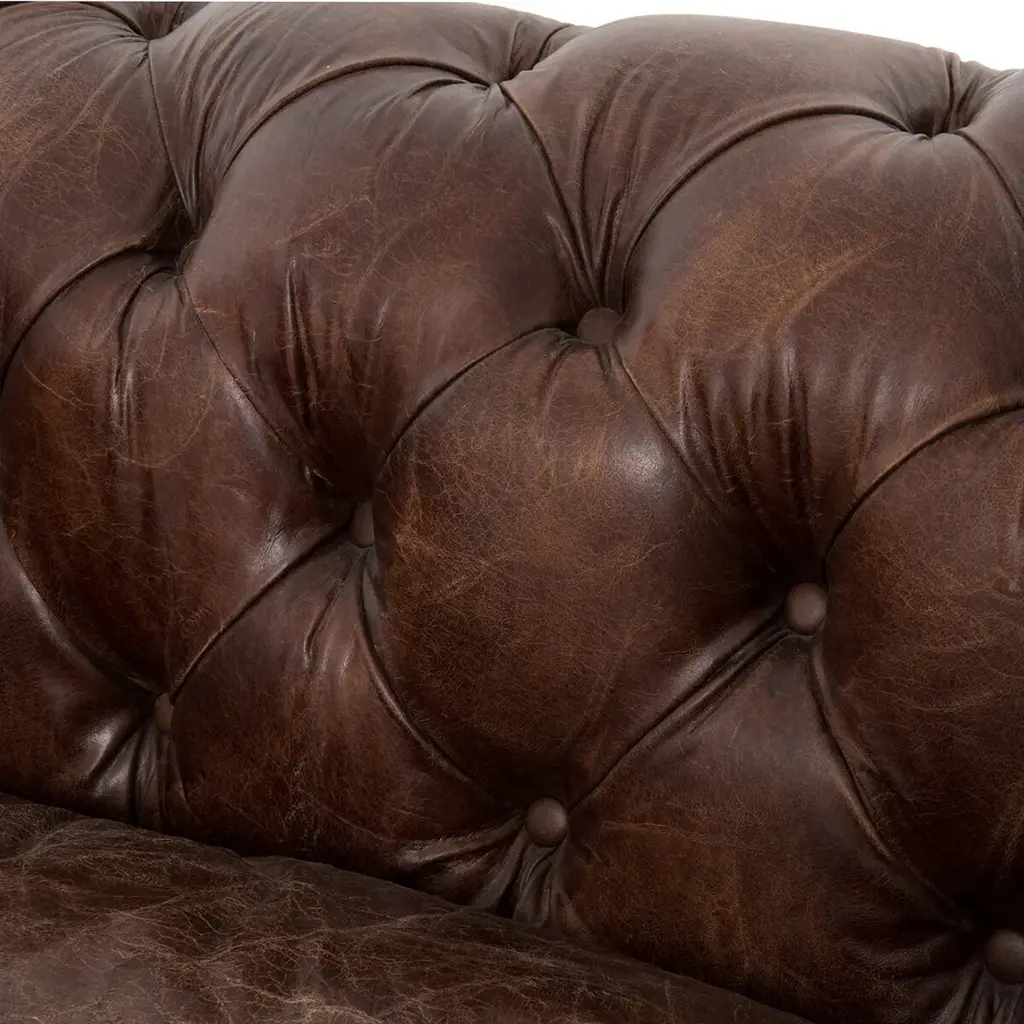 This dramatic Conrad sofa has a grand, men's club feel. Saddle-toned, top-grain leather is lovingly aged; an effect that will intensify beautifully in time. Ships In 10-14 Business Days Brass nailhead trim Top grain leather This image is for illustrative purposes only. The colors shown are accurate within the constraints of lighting, photography, and the color accuracy of your screen.