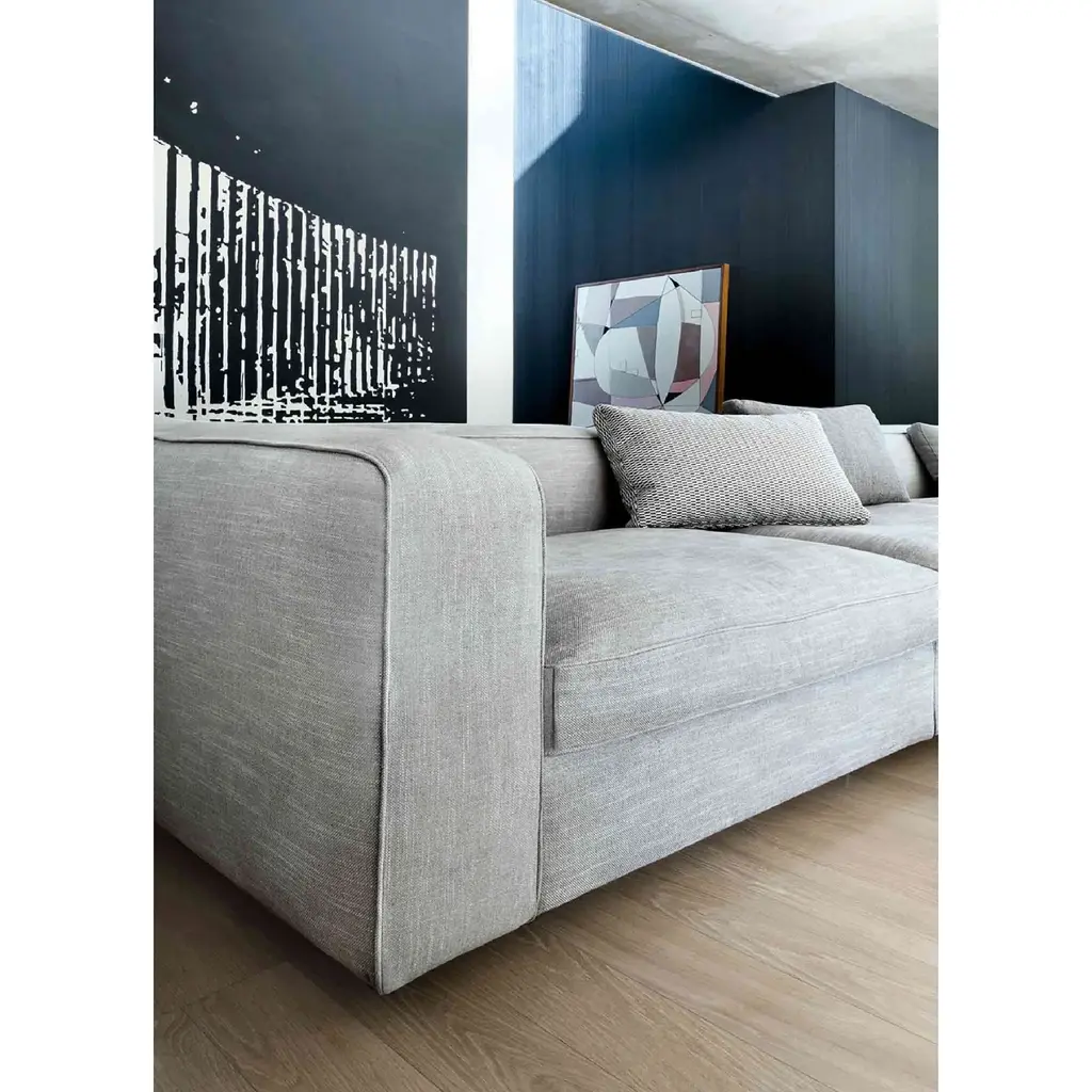 The Contemporary 3-Seater Sofa by Lema Snap is a modular upholstered system offering the chance to create highly personalized solutions with an informal look. With a wide range of modules available -in two depths-, users can create a great variety of linear and corner sofa arrangements, together with chaise lounges, poufs, seat pads, ends and centerpieces, and even asymmetrical. Snap's key features are its simple lines, austere shaping, and geometric joints, not to mention its highly elegant feel and contemporary proportions. Together, this makes Snap the perfect place for a spot of comfort, thanks also the cushion-inspired design of the backrest, with its extra down padding. The structure can be lifted slightly off the floor or rested on two chrome-plated or burnished metal “L"-shaped feet that match the armrests for length. The shiny flash of metal is a sophisticated detail that elevates the overall design thanks to the contrast with the shadow created between the base and the floor.