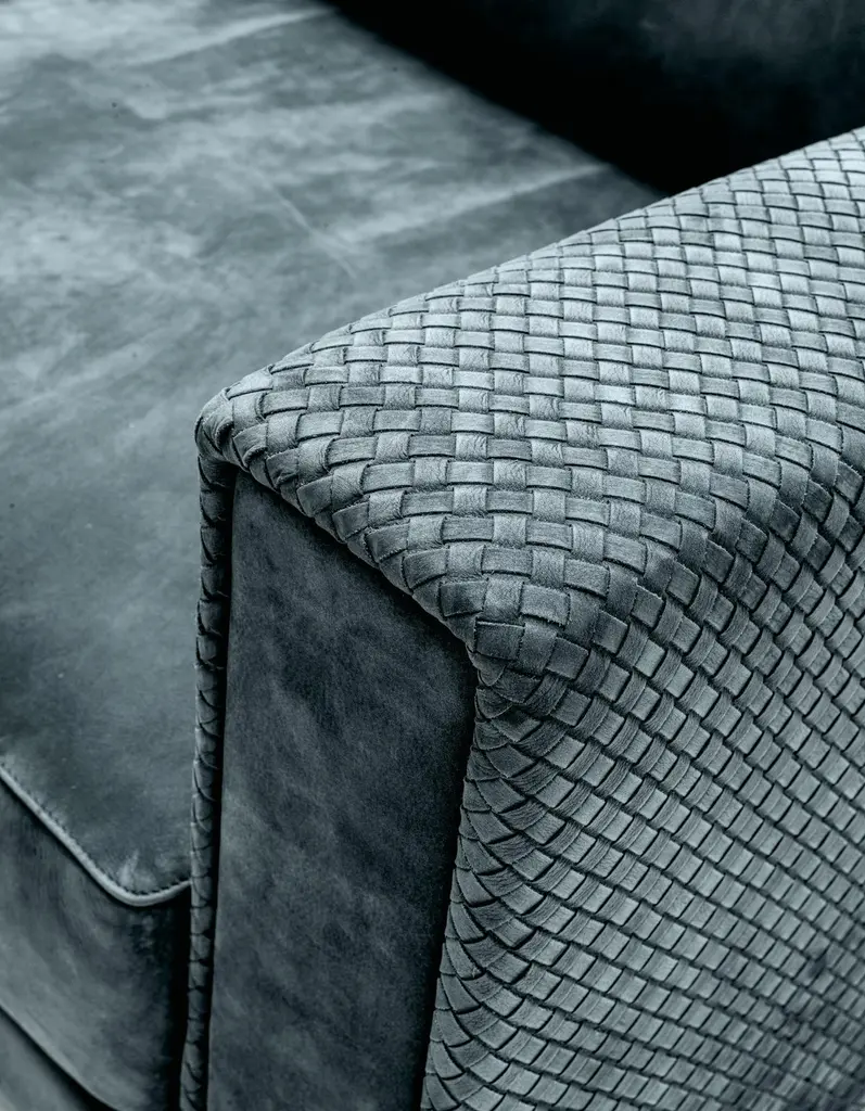 Internal structure:Metal frame, with solid wood insertsCushions padding:Sitting cushions:Natural, sterilized goose feathers, memory foam and strong polyurethanefoams with different density to ensure the maximum comfortBack cushions:Soft padding with natural , sterilized goose feathers ; core support inpolyurethane foamUpholstery:High quality leathers or fabrics from ulivi salotti exclusive range , available indifferent categories.The hand made braiding as photo is available only with leathers grassé” ,“top”, “kashmir” or “river”Base:H. 8 cm, metal, available in different finish. This item can be customized upon request.