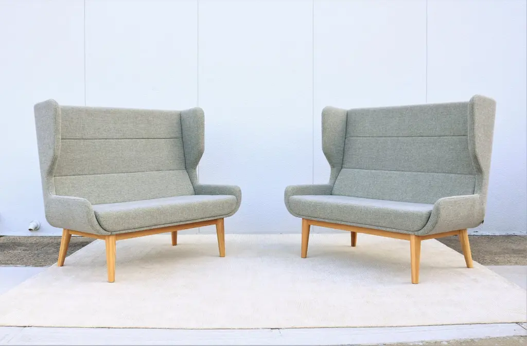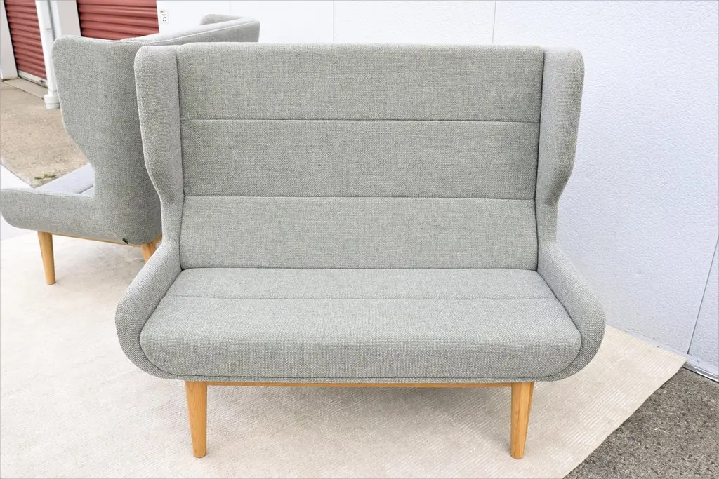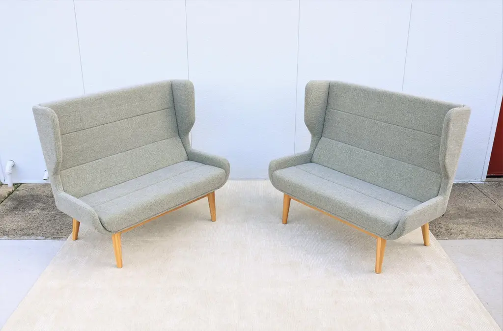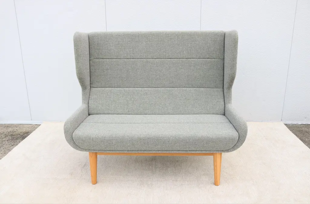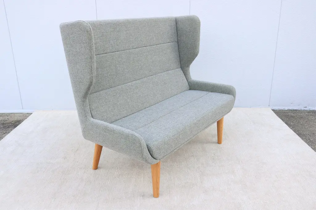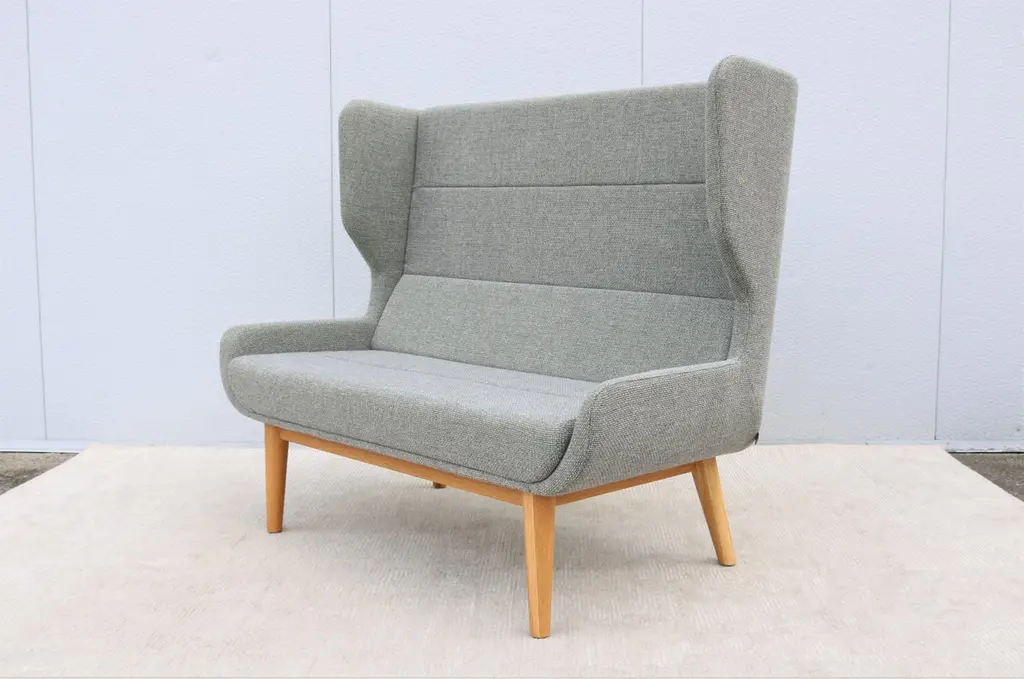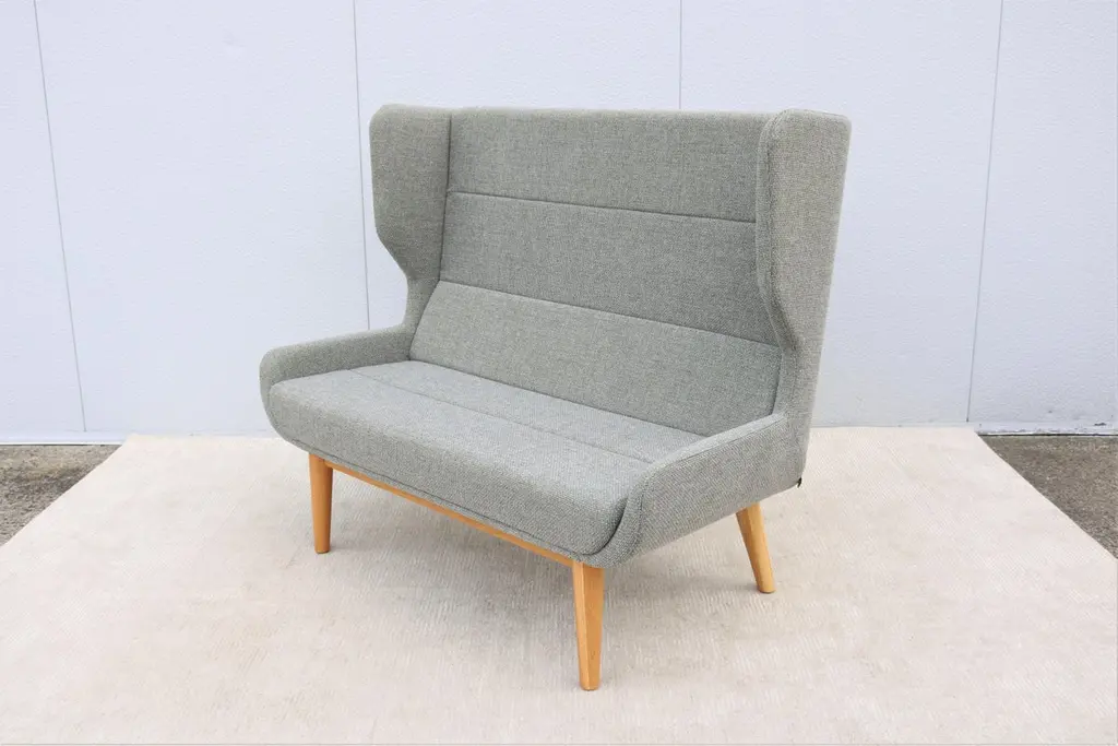 This fabulous high-back Hush two seat sofa takes inspiration from the classic wing-back chairs style.Designed to be comfortable and supportive but with an upright positive seating position. A sleek and elegant design will complement any contemporary, minimal or mid-century modern settings. Appropriate for residential and commercial use.Please note I have 3 sofas available, selling them individually (the price listed is for one sofa)Specifications:Upholstered in wool blend fabric, color: nickel gray with bright green.Body is constructed with molded plywood and high quality CMHR foams.Turned solid oak legs with steel subframe, sealed with spray matt lacquer.Hard floor glidesStyle: Contemporary ModernDesigned by Naughtone 2010Year manufactured: 2019Manufactured by: Naughtone for Herman MillerModel: Hush 2 seat sofa # HSH2SFBWDMade in: USA.Dimensions: Height 45.5" x Width 53" x Depth 32" x Arm height 21" x Seat height 17" x Seat width 48" x Seat depth 19" x Height from seat to top 27.5" x Weight 78 lbs.