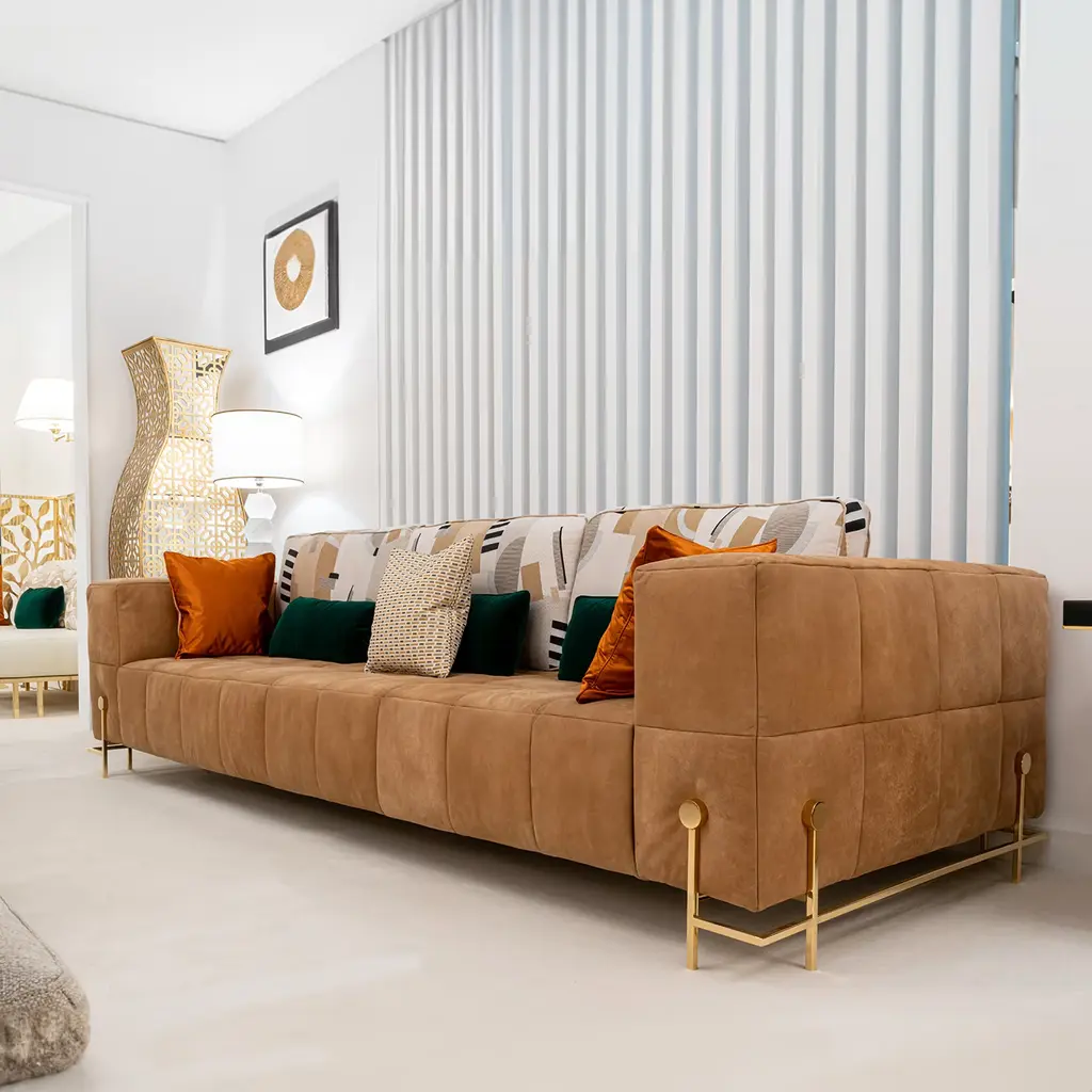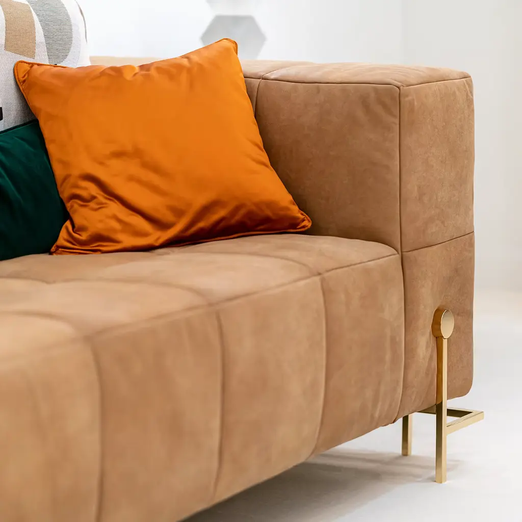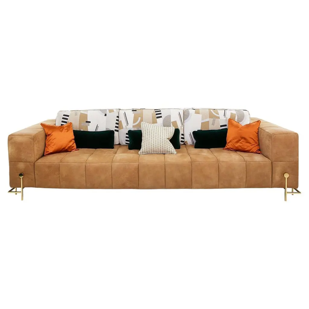 A comfortable and sophisticated solution for a refined and contemporary interior environment, this splendid sofa features a capacious and welcoming shape, softly padded and upholstered with first-rate Nabuk leather. Crafted of steel, the structure is plated with 18K gold. It includes decorative cushions. Please consult the Concierge for further information.