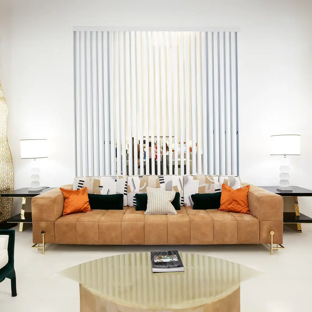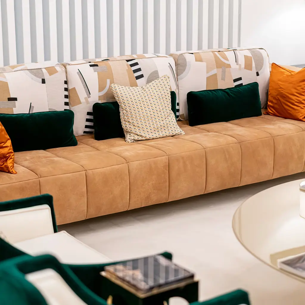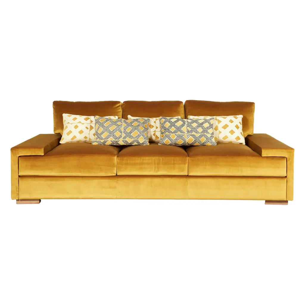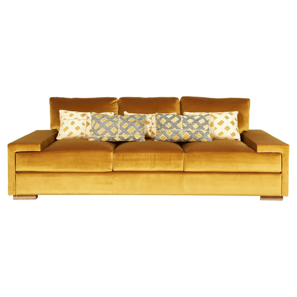 A comfortable and sophisticated solution for a refined and contemporary interior environment, this splendid sofa features a capacious and welcoming shape, softly padded and upholstered with first-rate Nabuk leather. Crafted of steel, the structure is plated with 18K gold. It includes decorative cushions. Please consult the Concierge for further information.