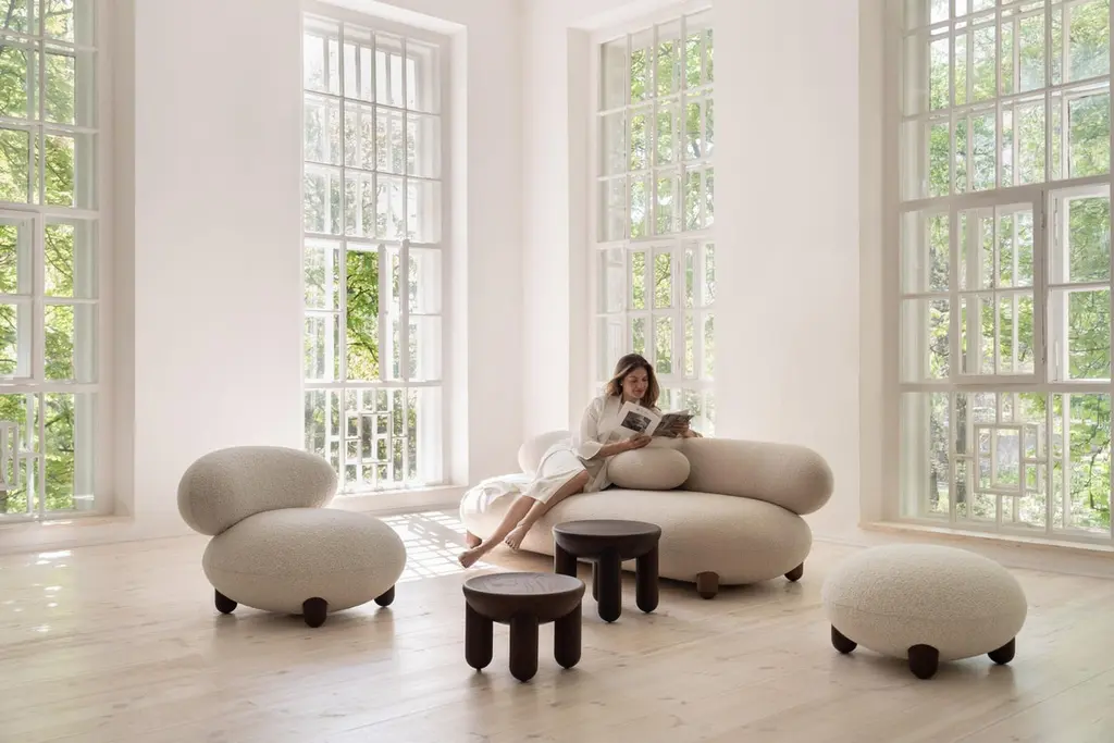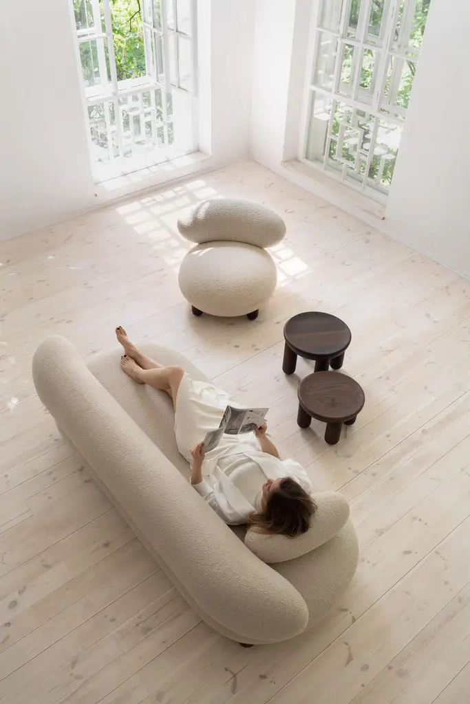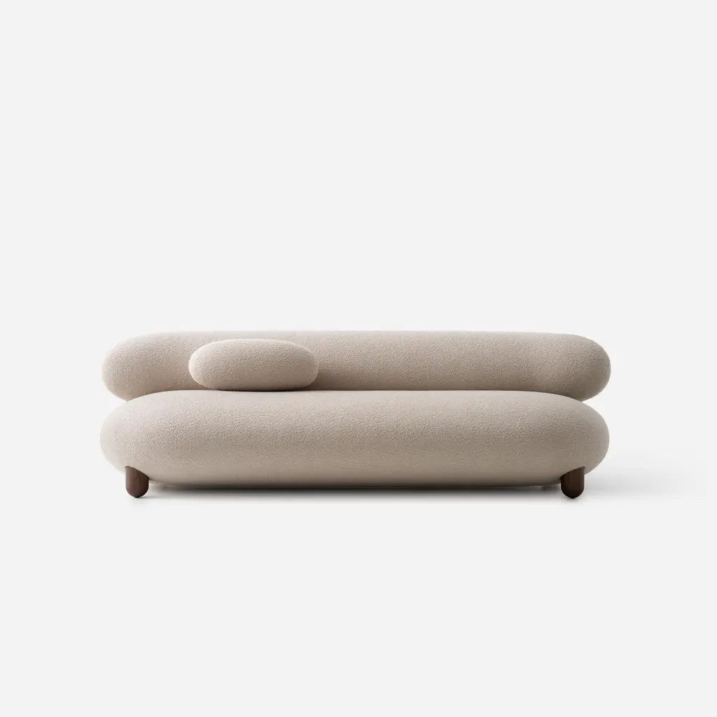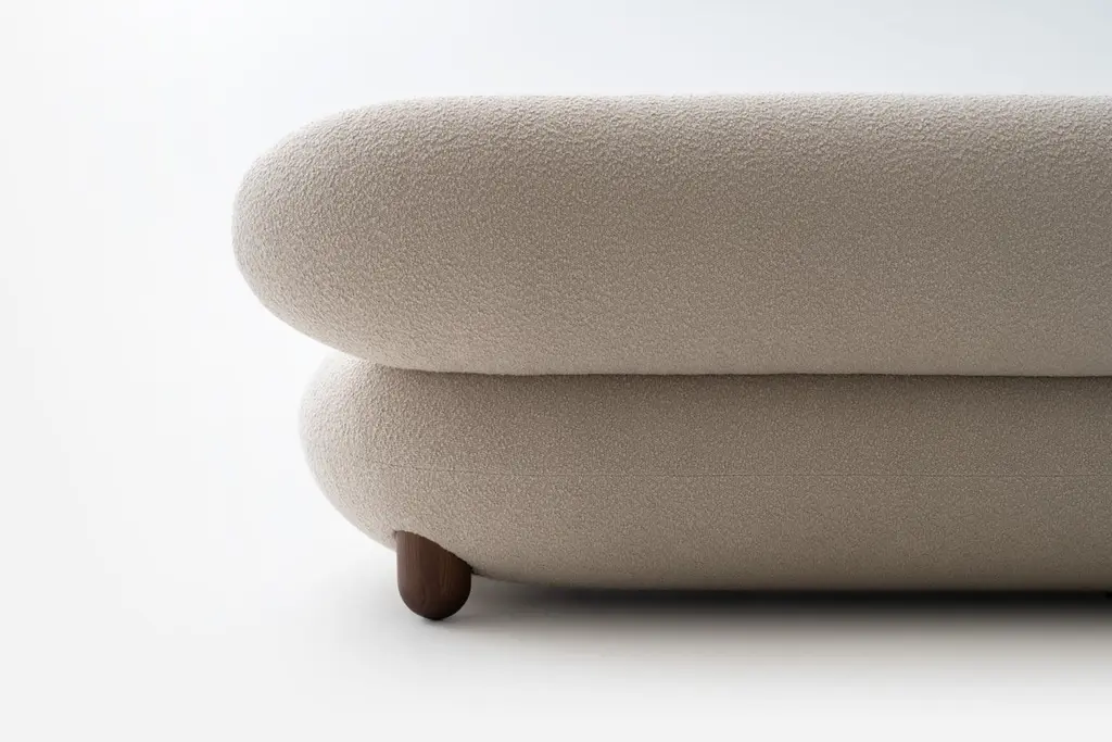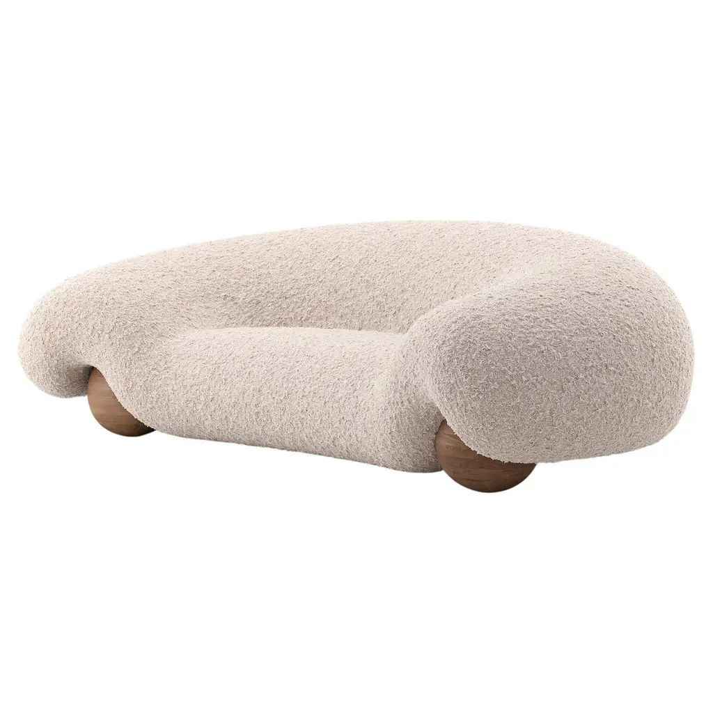 Contemporary Sofa 'Flock' by Noom, Baloo BoucleDesigner: Kateryna SokolovaDimensions: - H 72 cm x W 240 cm x D 105 cm, Seat height: 44 cm- H 28.35" x W 94.49" x D 41.34", Seat height: 17.32"Model shown on main picture:- Fabric: Baloo Boucle 2074- Legs: Brown stained ashwood- Model: Three-seater- Size: 240 cmDimensions available:- Two-seater: H 72 cm x W 210 cm x D 105 cm - Three-seater: H 72 cm x W 240 cm x D 105 cm - Four-seater: H 72 cm x W 270 cm x D 105 cm Legs wooden finishes available:- Natural ashwood- Lacqured ashwood- Honey stained ashwood- Light brown stained ashwood- Brown stained ashwood- Gray-brown stained ashwood- Black stained ashwood- Thermo Ash- Any RAL colorSmall cushion includedMaterials: Wood, plywood, metal, moulded foam, foam, textileFabrics: Available in a wide range of colors and fabrics by request----The Flock Sofa is a bold addition to the sculptural Flock collection, defined by organic forms and expressive design. With its timeless wraparound silhouette and deep lounge seating, it is ideal for reclining, gathering, or simply unwinding.Available in two-, three-, or four-seater configurations, the sofa is highly customisable in a curated selection of premium fabrics and textures.The solid ash legs are available in natural hues or finished in any RAL colour, allowing for seamless integration into a variety of interior palettes. One cylindrical cushion is included in matching or contrasting upholstery. NOOM is a leading design brand from Ukraine. Working at the intersection of art and craftsmanship, driven by a curiosity for testing new materials, finishes, and techniques, NOOM produces eye-catching furniture, lighting, mirrors and décor for private and commercial interiors, including cutting-edge collectable design pieces.
