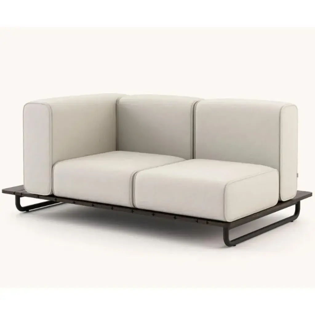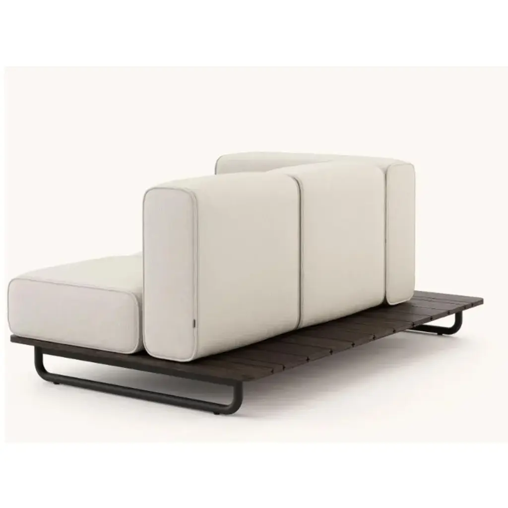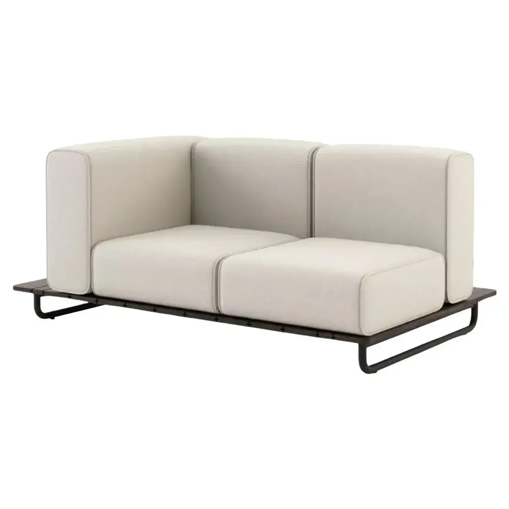 Copacabana sofa with 1 arm right by Domkapa Materials: black texturized steel, bamboo wood, fabric (Rhine Ice). Dimensions: W 165 x D 105 x H 75 cm. Also available in different materials. Copacabana sofa with or without armrest is an exclusive piece for those who love spending quality time together with friends outdoor. Domkapa holds a tremendous passion for detailed stitching, presenting several similarities to the haute-couture philosophy focused on the value of a “made by hand”.