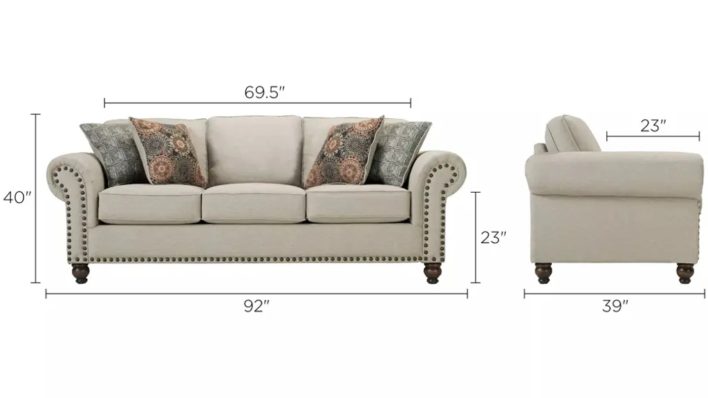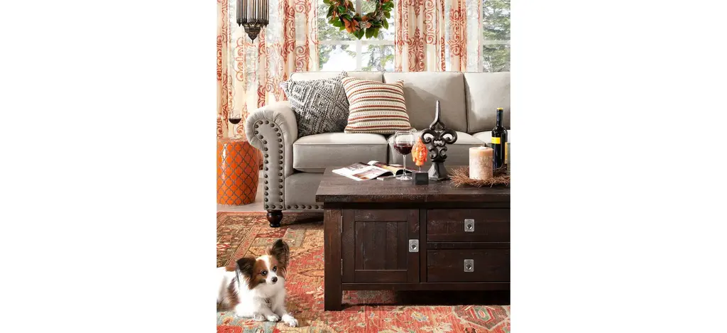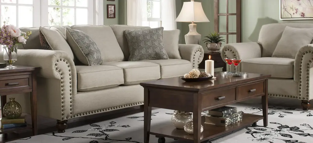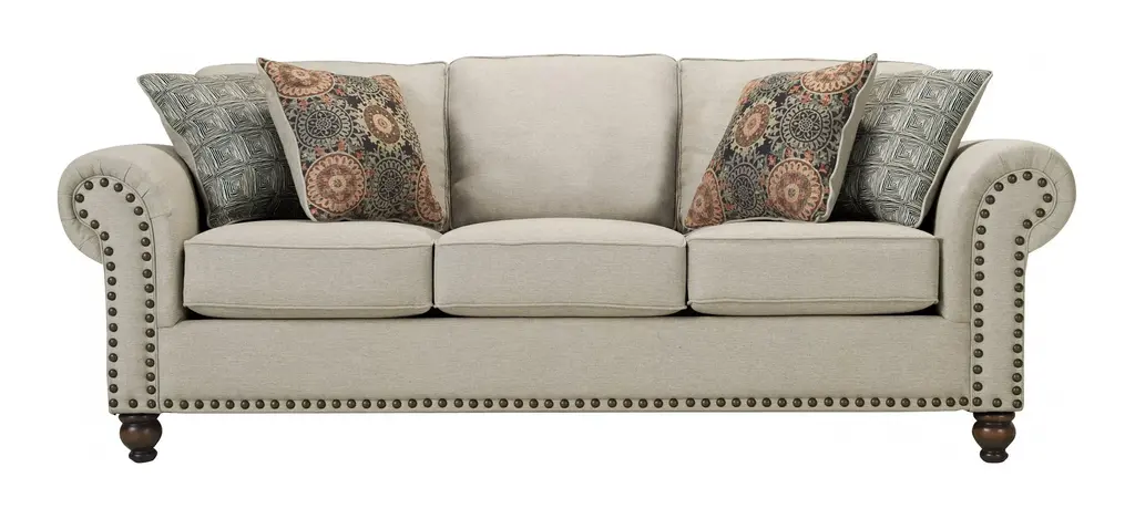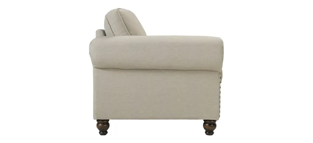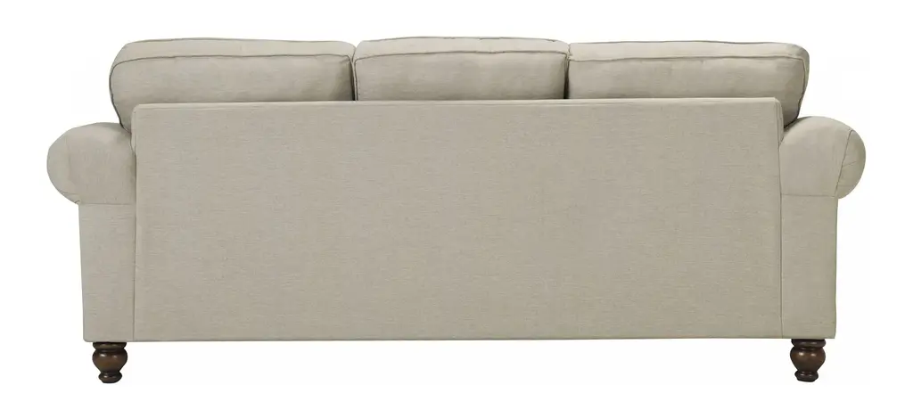 For a timeless living room with classic appeal, call on the Corliss sofa. This piece will make a grand statement with its generously scaled seating and oversized nailhead trim adorning the ever-stylish rolled arms. The oatmeal-colored fabric is so versatile, and it's complemented beautifully by bold prints on the accent pillows. Plus, its turned feet are finished in an attractive walnut tone that goes with everything.