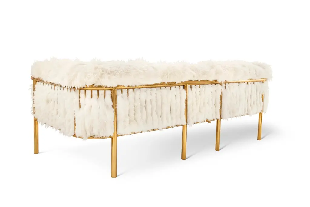 Coronum 3 Seat Gold Sheepskin Sofa by Artefatto Design Studio is a luxurious seat with soft white sheepskin upholstery held in gold metal.Artefatto Design Studio have indulgently worked on this alluring collection, crossing the boundaries between art, design and luxury fashion, in order to create a unique and personal vision for the collection. The founding designers of this London based studio have subtly blended together their design sense from the Greek and Latin heritage, spinning charming interiors, furniture and lighting design delivered over thought-provoking forms with a distinguished organic virtue and an inspired minimalism.Care: Please note: Each piece exalts the handmade, the painstakingly crafted, the authentic. A piece may have slight variations and tiny imperfections but these are the marks of an artisan, a testament to the individuality of each work of art. It is our belief that these variations infuse our objects d'art which desire and we assert our right to make the necessary qualitative changes. Prices do not include VAT. VAT may be applied depending on the ship-to location.