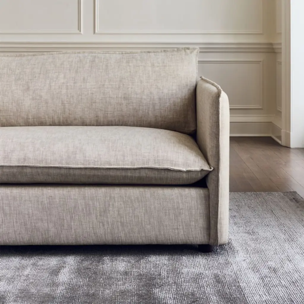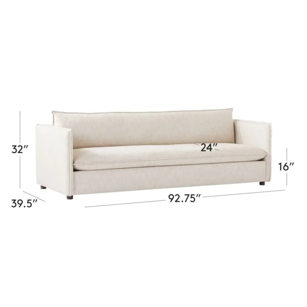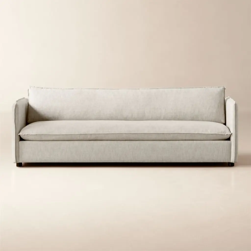 Built on a thin frame, Italian-inspired sofa brings a sense of lightness despite its oversized proportions. Transitioning easily between formal and informal settings, the sofa's slim silhouette and seamless armrests offer a modern aesthetic, while flange-trimmed linen upholstery in a tonal neutral nods to more traditional influences. CB2 exclusive.