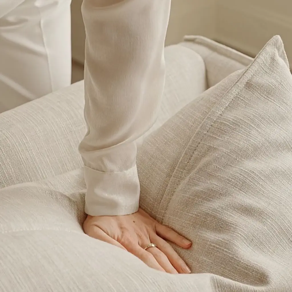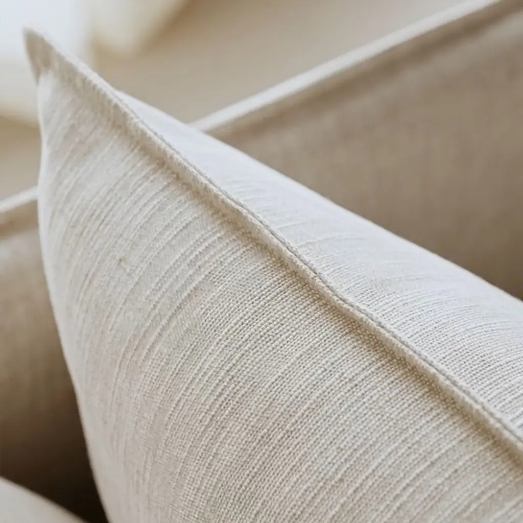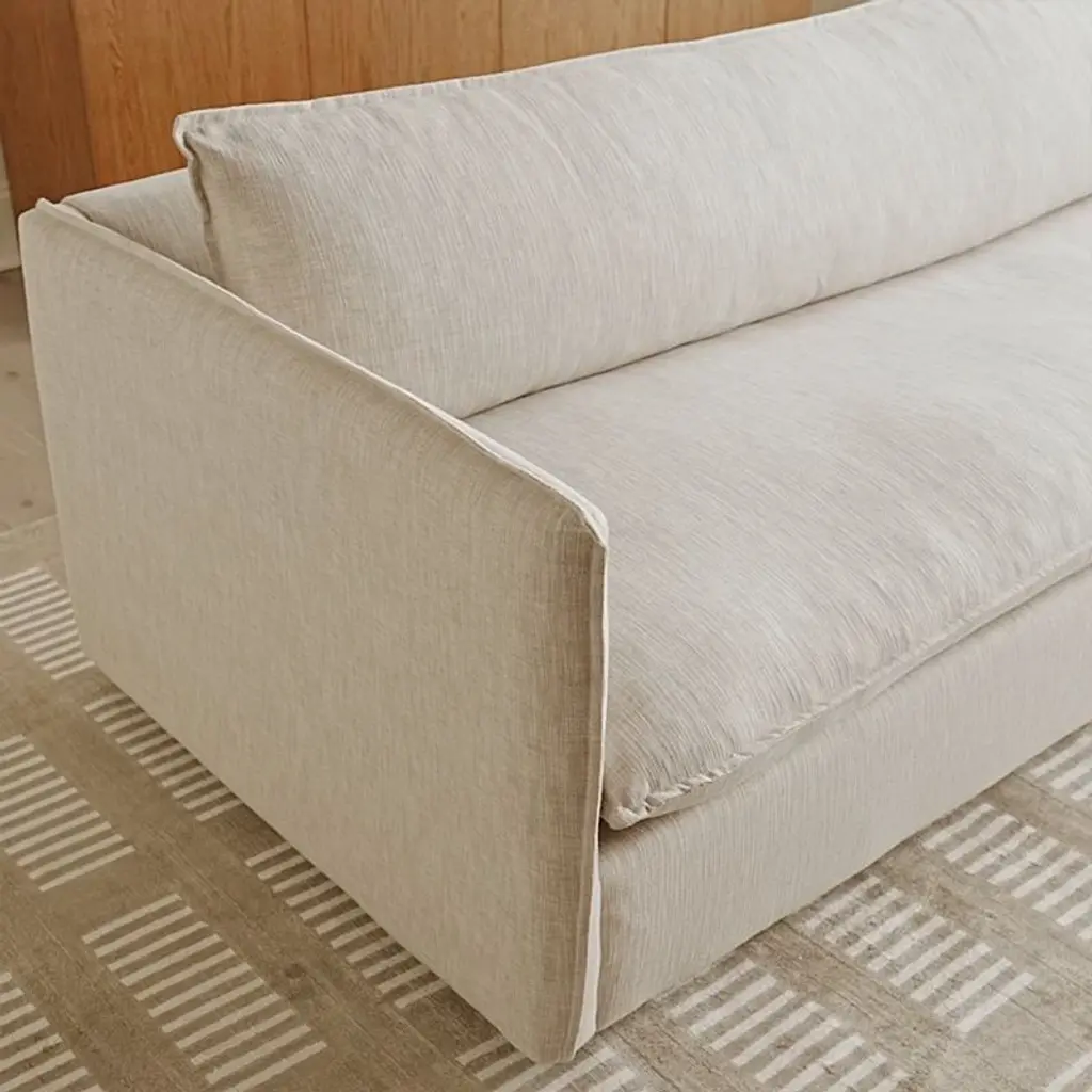 Built on a thin frame, Italian-inspired sofa brings a sense of lightness despite its oversized proportions. Transitioning easily between formal and informal settings, the sofa's slim silhouette and seamless armrests offer a modern aesthetic, while flange-trimmed linen upholstery in a tonal neutral nods to more traditional influences. CB2 exclusive.