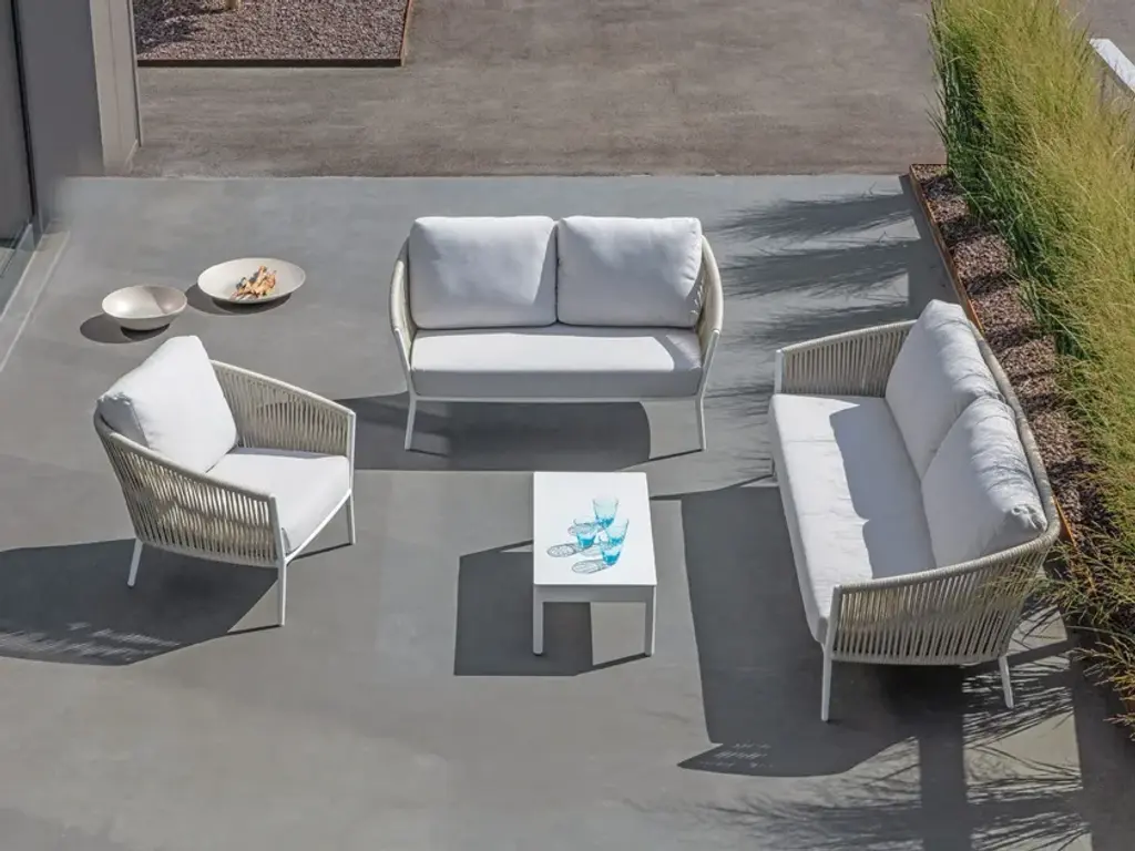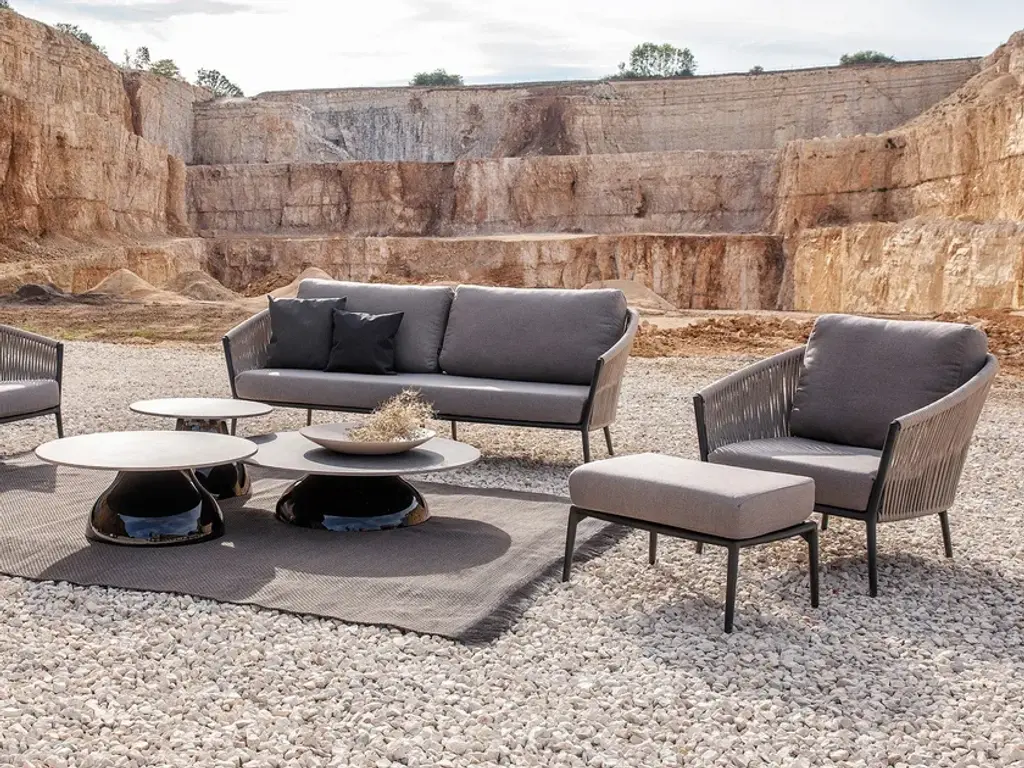 The Cosmo sofa is an elegant combination of a white or anthracite-coloured aluminium frame and high-quality rope. Together with the fluffy cushion, an attractive outdoor lounge is created in an elegant design with the best seating comfort. The rope is made of weatherproof, and uv-resistant fibers. The outdoor cushions consist of a sturdy cover with zipper and a filling with Quick Dry Foam. The Cosmo collection is a combination of an anthracite or white matt textured coating aluminium frame and high quality textile rope. Together with the fluffy cushions Fischer Möbel developed an attractive armchair in an elegant design with best comfort. For the individual style, cushions can be made out of more than 50 exclusive outdoor fabrics.