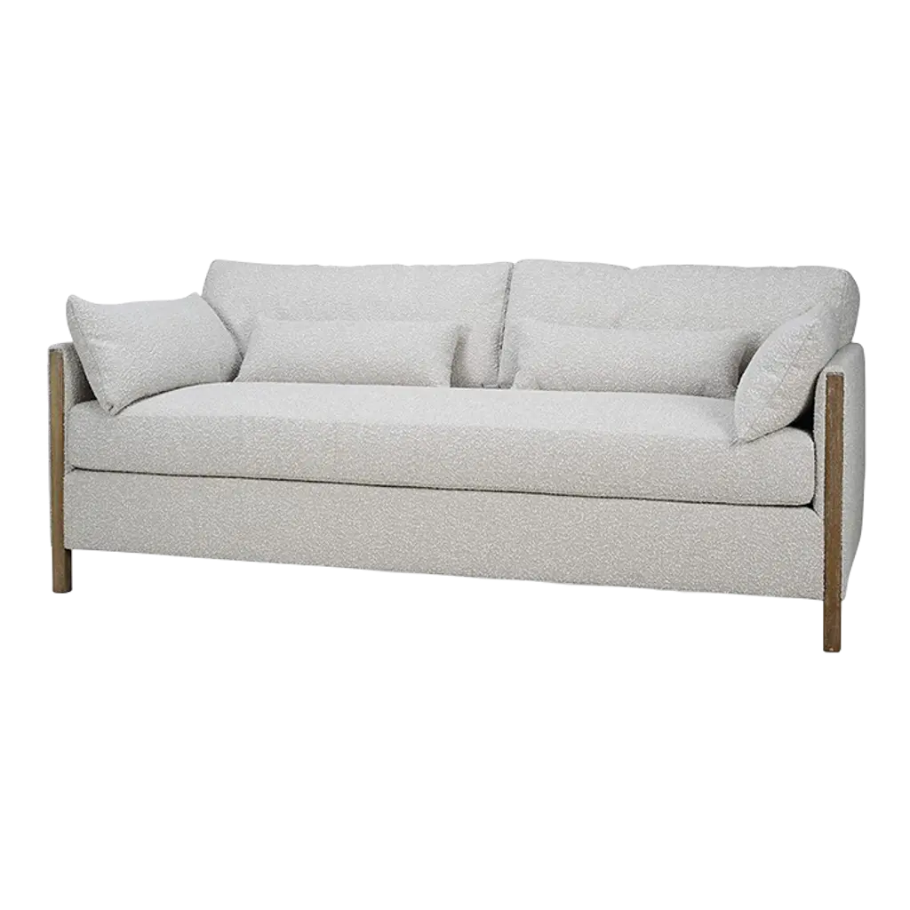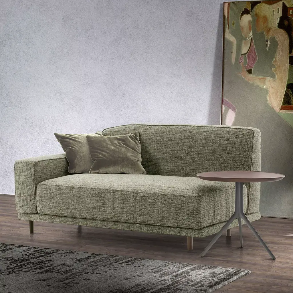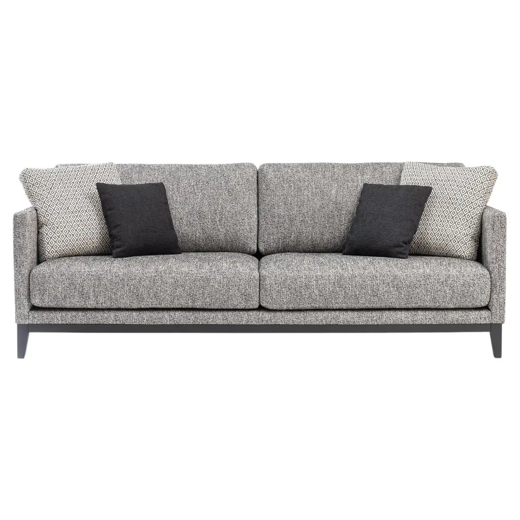 Designed by Marco Corti, this sofa boasts a wooden frame complemented by solid walnut canaletto details, adding a touch of sophistication to its sleek design. The cushions, armrests, and backrests are upholstered can be customized with leather, faux leather, or fabric from the studio's exclusive collection. The armrests are customizable with a range of finishes: Canaletto or wengé walnut, black stain, mocha, tobacco, or matte lacquer. Two decorative cushions (45x45cm) are included with pruchase.