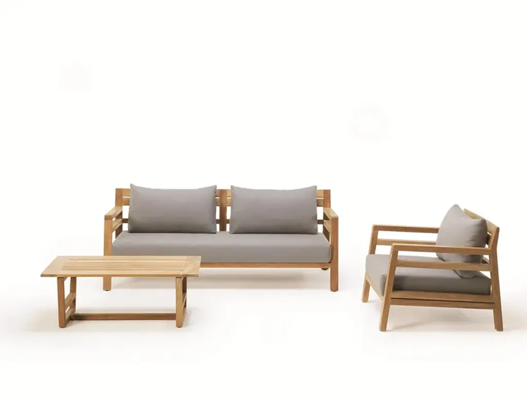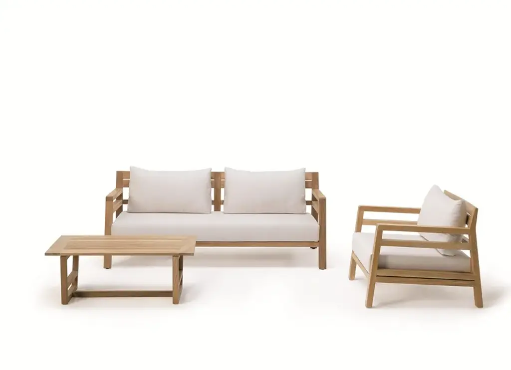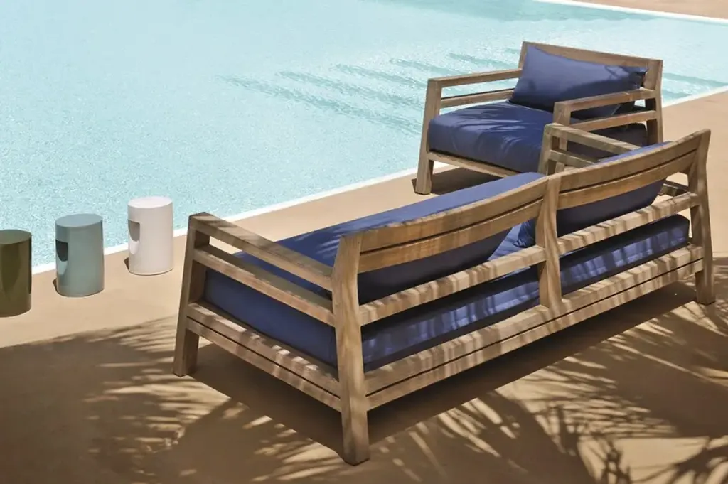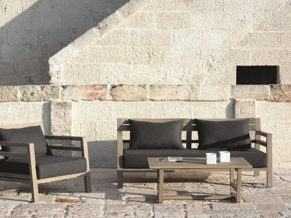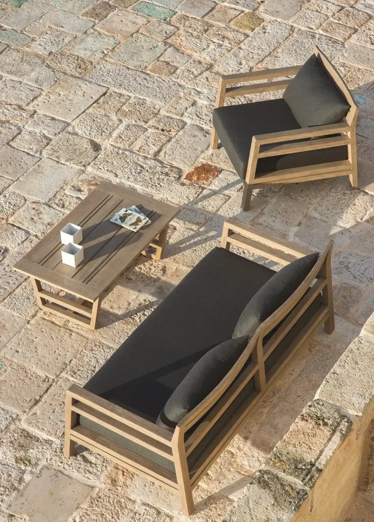 COSTES | Sofa - 3 seater sofa in teak with natural or pickled finish or in painted mahogany.Costes explores the multiple expressive possibilities of wood: from varnished mahogany to teak, available in natural or pickled finish with its fascinating “worn” look. A wide choice of elements, always with harmonious and essential lines: from sofas to tables, to the chairs and the sun lounger.
