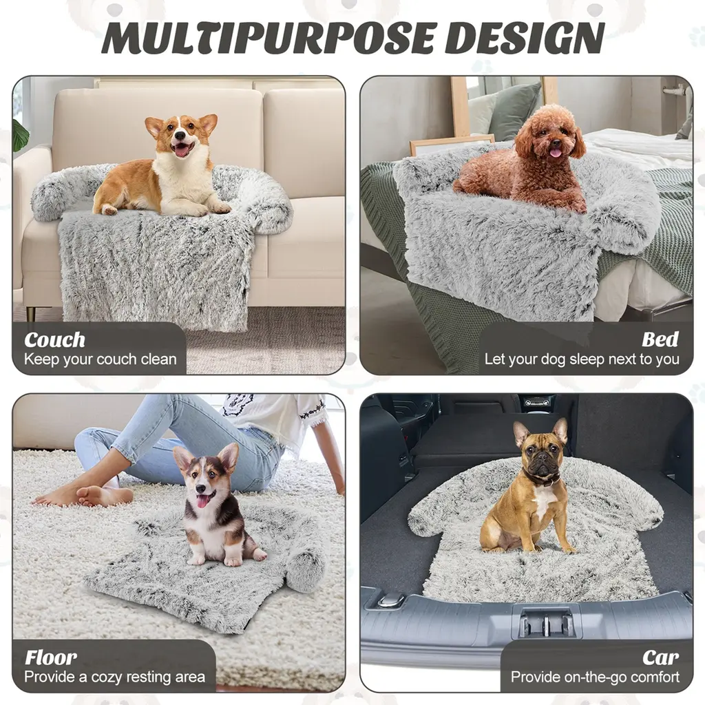 Provide Your Furry Friend with Luxurious Comfort! Our plush dog couch bed is available in 3 sizes for you to choose from: S (measures 40" x 35" (L x W), fits pets up to 33 lbs), M (measures 44" x 40" (L x W), fits pets up to 66 lbs), and L (measures 47" x 45" (L x W), fits pets up to 110 lbs). Designed to protect your furniture while offering versatile functionality, this bed is a cozy retreat for your furry companion in various settings, such as beds, sofas, cars, floors, and more. Besides, it is covered by cozy long plush fabric and filled with soft cotton, offering superior comfort and support. And the padded pillow adds an extra level of relaxation. Moreover, cleaning is a breeze with the removable and washable outer cover. With its non-slip and waterproof bottom, along with a non-slip carrying handle, this bed stays securely in place and can also be tucked into sofa gap to prevent sliding. Provide your beloved pet with the ultimate lounging experience with our plush dog couch bed.FeatureDesigned to protect your furniture from pet hair, scratches, and dirt Can be used on the bed, sofa, floor, or in the car, ensuring your furniture stays clean The long plush fabric provides a soft and luxurious surface for your pet to relax on The padded pillow with soft cotton filling provides additional neck and head support Thanks to the convenient zipper and a removable bolster, the cover is easy to clean The reliable waterproof furniture cover adapts to more environments The anti-skid bottom provides stability and prevents the bed from sliding The carrying handle brings convenience for moving the dog bed anywhere you want The handle can also be tucked into the gaps of your sofa, ensuring it stays in placeSpecificationColor: Gray Overall Dimensions : 40" x 35" x 6.5"/44" x 40" x 7"/47" x 45" x 7" (L x W x H) Inner Size :28" x 26"/32" x 32"/38" x 33" (L x W) Recommend Weight : 33/66/110 lbs Net Weight :3.5/4.5 lbs Package Includes: 1 x Plush Dog Couch Bed