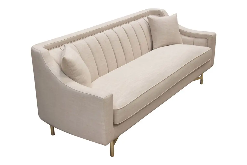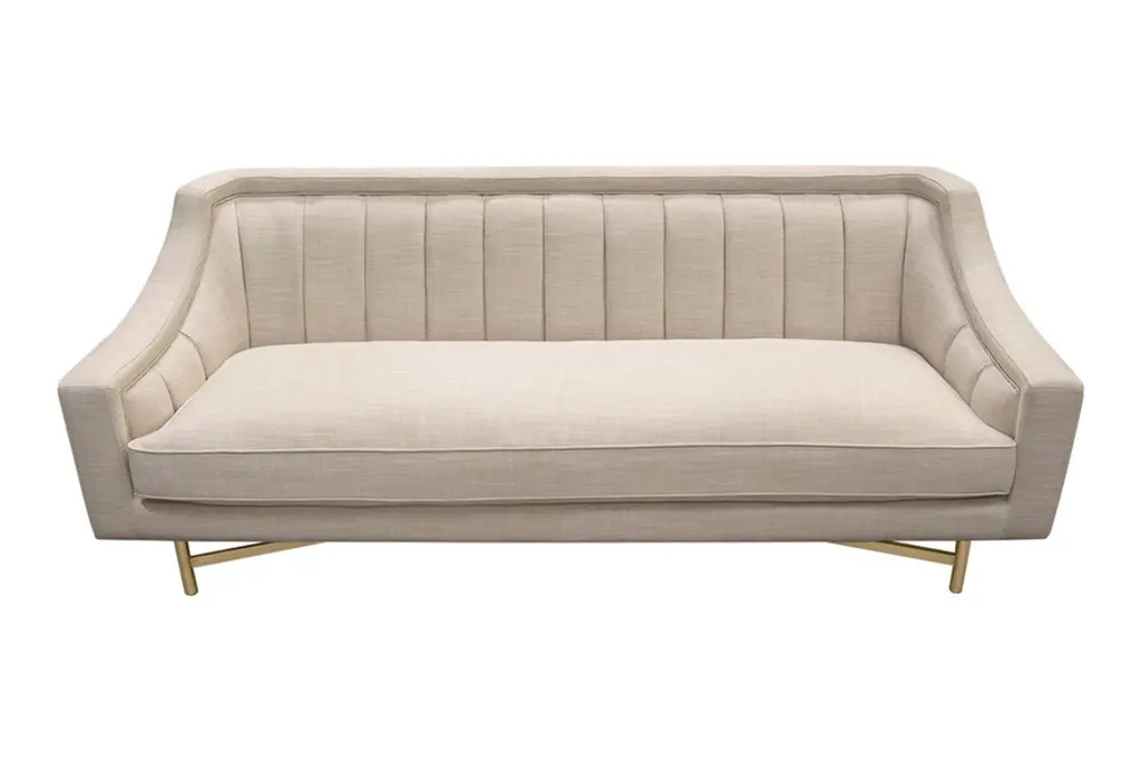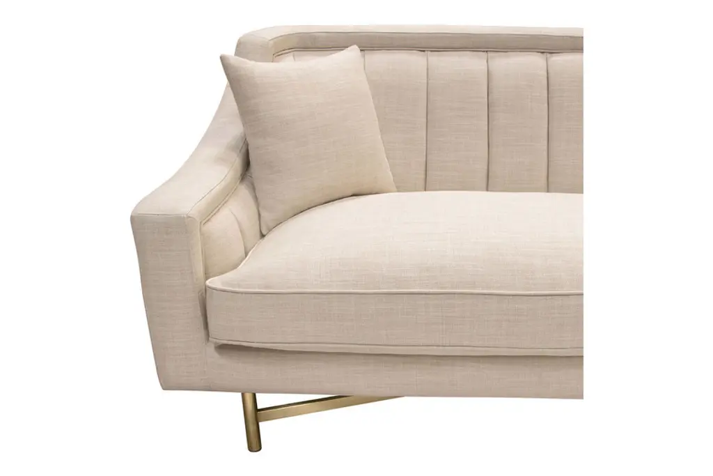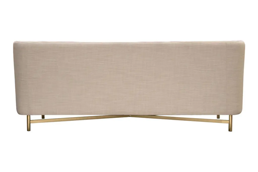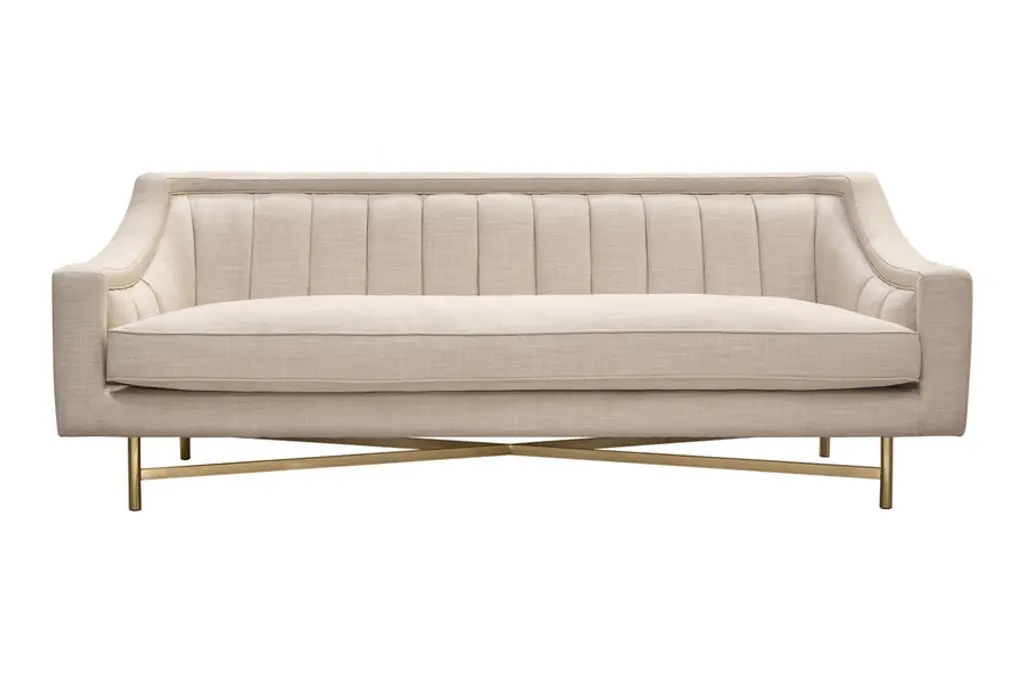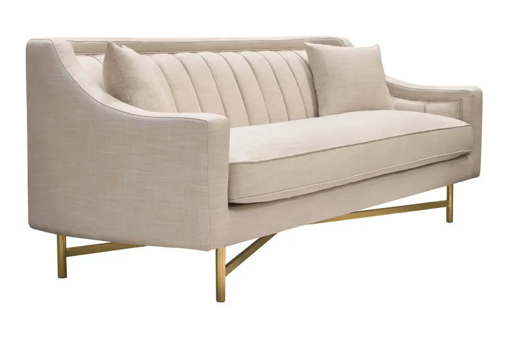 Chic and sophisticated, you are going to love the Crafton Sofa. Allthough entirely lounge worthy, maybe a spot of tea tickles your fancy? This soft and cozy sofa features an award-winning design matching class, comfort and elegance from every angle. Plush padded cushions with stunning channel tufting accented along its upholstery is only the beginning. It has a beautiful sleek backrest softly sloping into arching arms. Its polished gold reinforced criss-cross stainless steel legs provide hints of glimmer with practical support. Its comfortable linen blend upholstery in a warm and neutral sand color makes it possible to fit this beauty in any interior design setting.