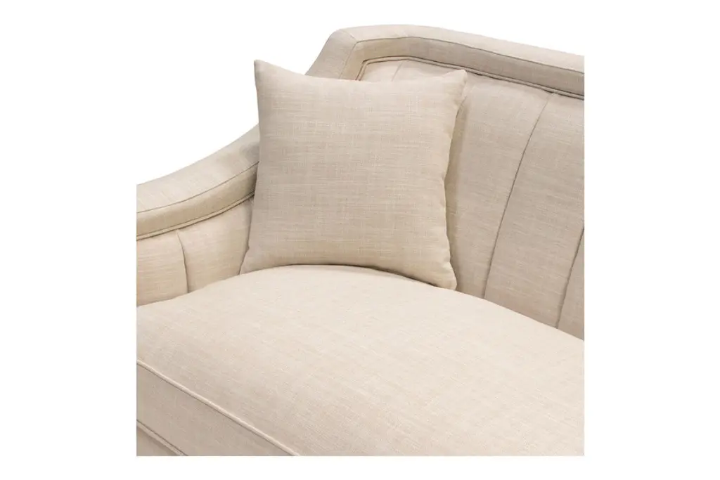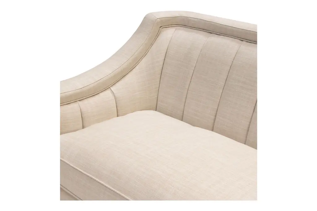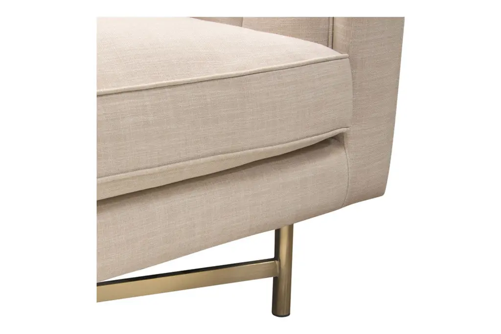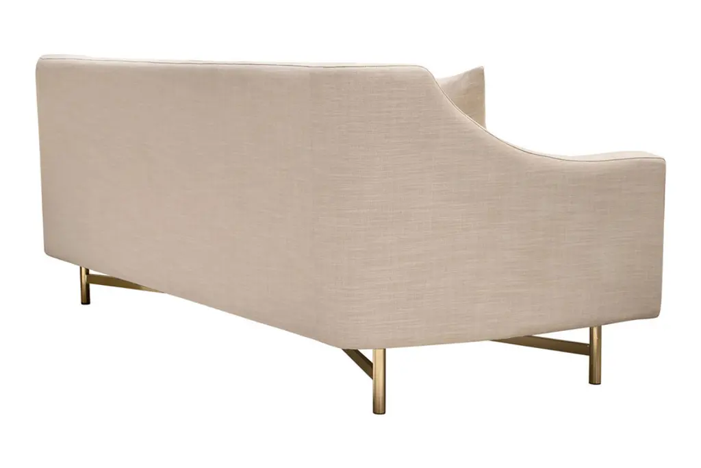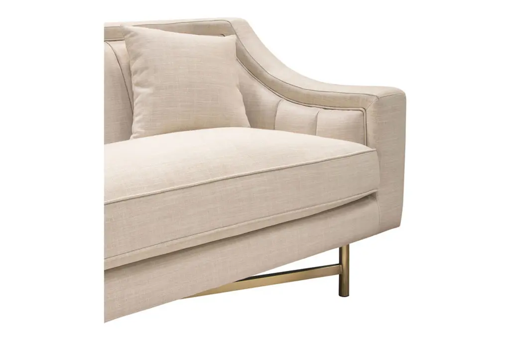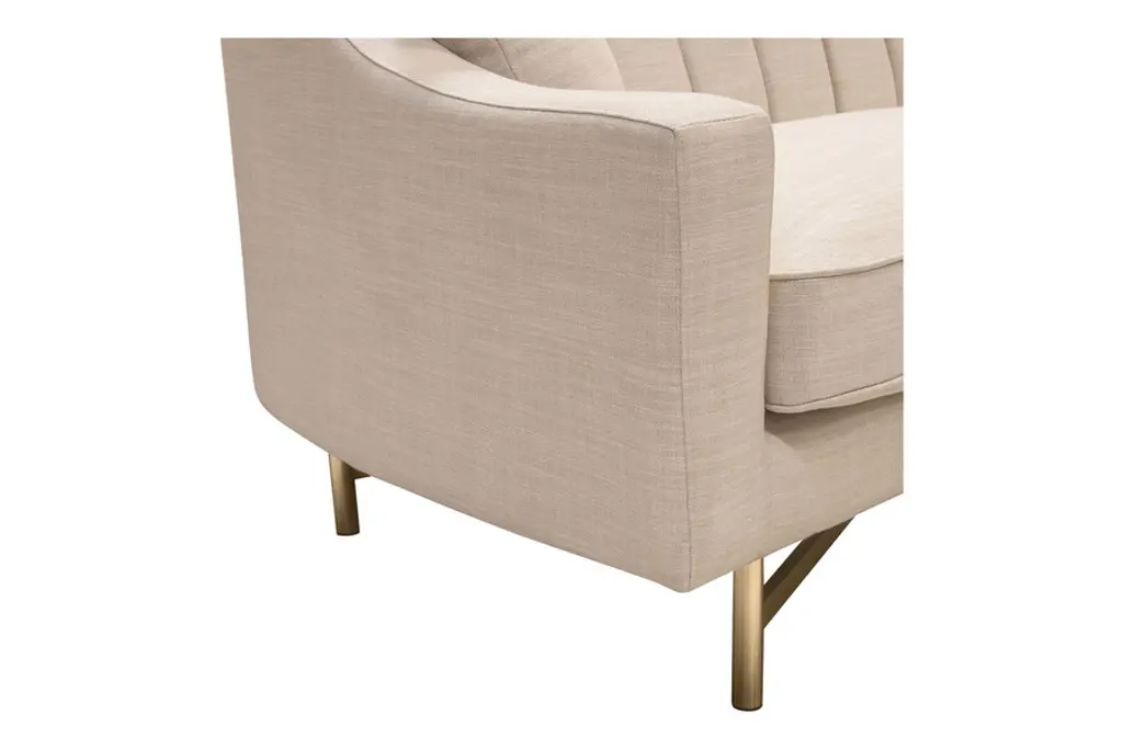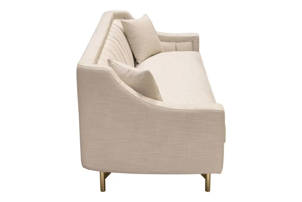 Chic and sophisticated, you are going to love the Crafton Sofa. Allthough entirely lounge worthy, maybe a spot of tea tickles your fancy? This soft and cozy sofa features an award-winning design matching class, comfort and elegance from every angle. Plush padded cushions with stunning channel tufting accented along its upholstery is only the beginning. It has a beautiful sleek backrest softly sloping into arching arms. Its polished gold reinforced criss-cross stainless steel legs provide hints of glimmer with practical support. Its comfortable linen blend upholstery in a warm and neutral sand color makes it possible to fit this beauty in any interior design setting.