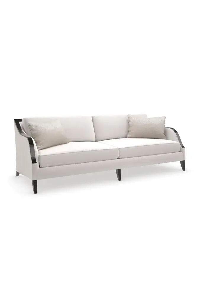 This sleek track arm sofa is elegantly defined by an exposed wood frame in a richly contrasting, Chocolate Truffle finish. Finely tailored in a cream basketweave and accented with kidney back pillows for added comfort. Toss pillows in an exaggerated herringbone pattern tie together this modern-meets-traditional, iconic aesthetic. Matching chair also available.
