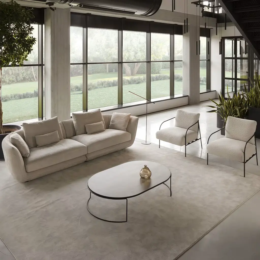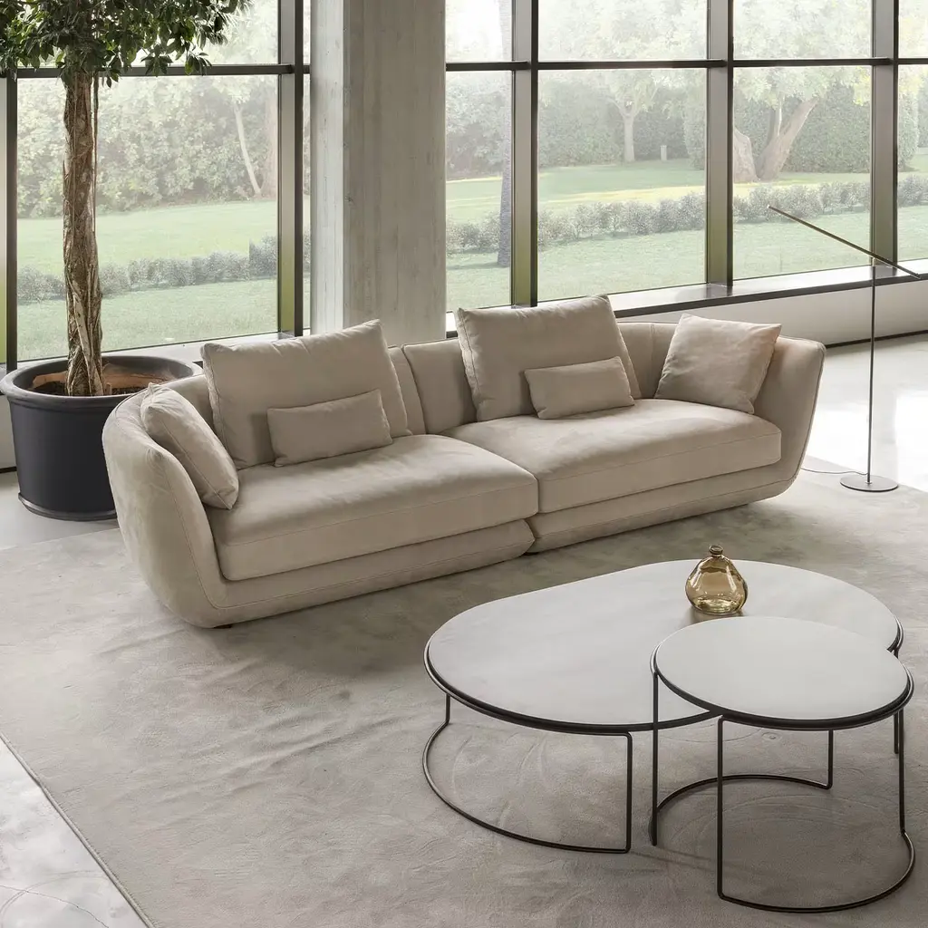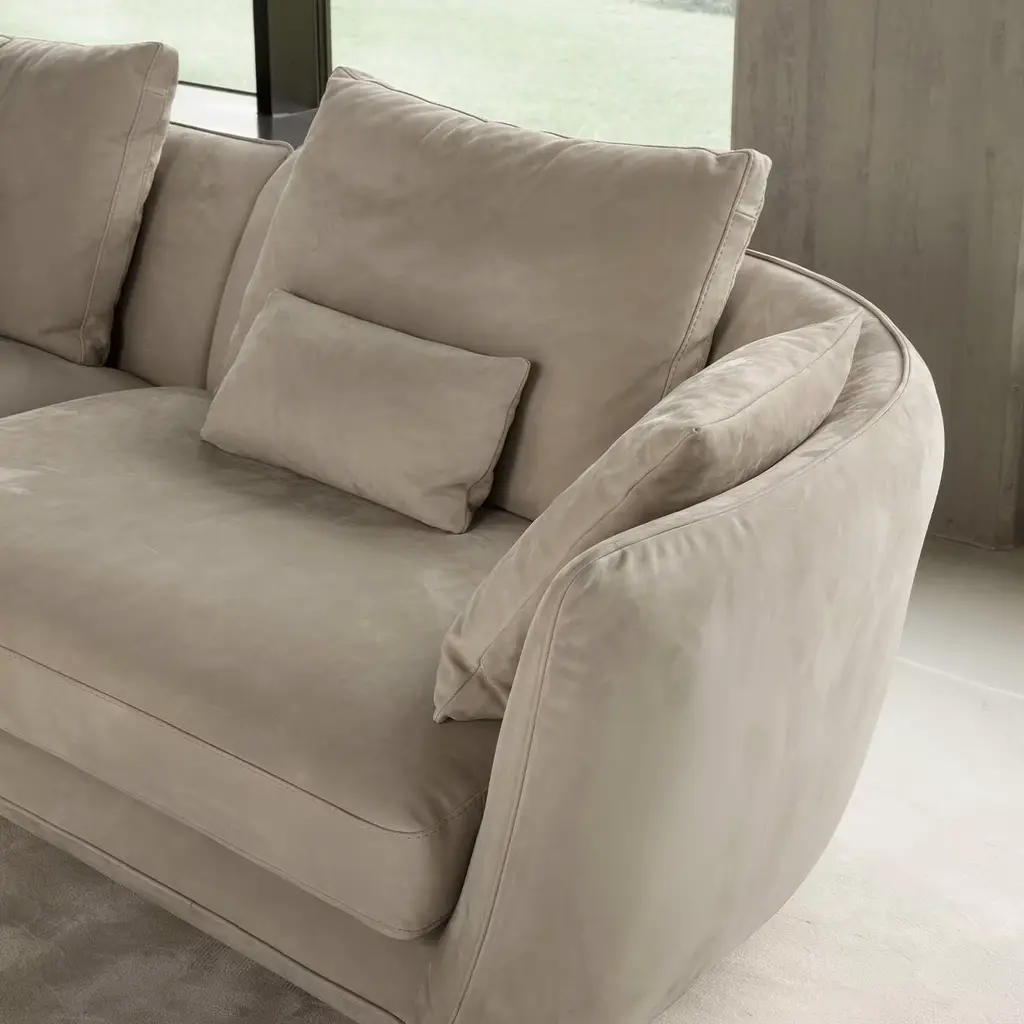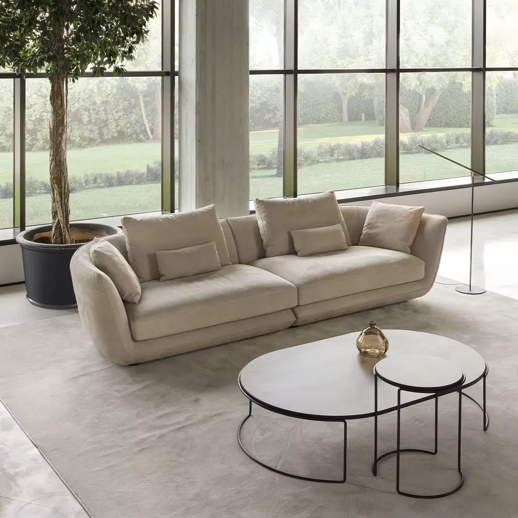 Distinguished by its refined craftsmanship, this sofa features a sturdy metal frame and comfy cushions, combining memory foam and goose down for ultimate comfort. Upholstered in luxurious nubuck leather, it is also available in various other leathers and fabrics upon request to the Concierge. Designed by Palomba Serafini, this piece exudes sophistication and elegance, making it a standout addition to any living space. Decorative cushions are not included with purchase.