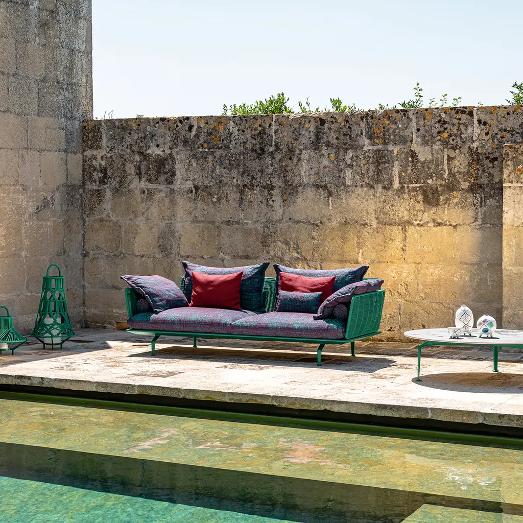 A showcase of sartorial mastery and industrial references, this sofa will bring a pop of color and impeccable comfort to any outdoor space. The airy aluminum frame finished in teal and the two-tone fabric upholstery showcasing a captivating outmap-style design define its silhouette making it attractive and functional. Decorative cushions are not included.