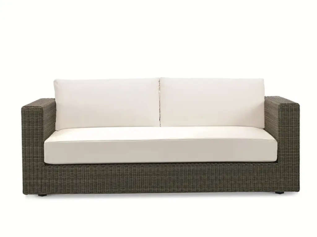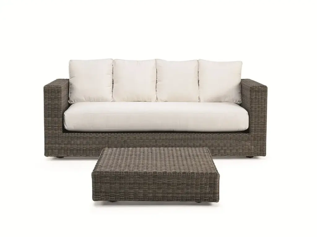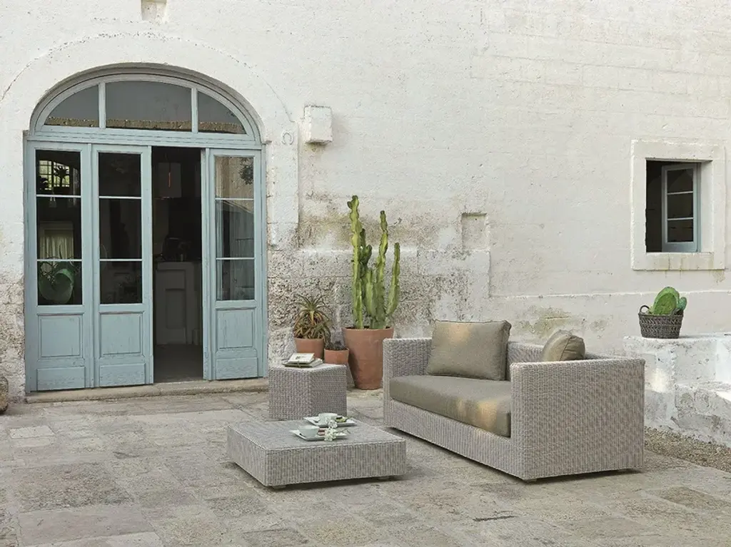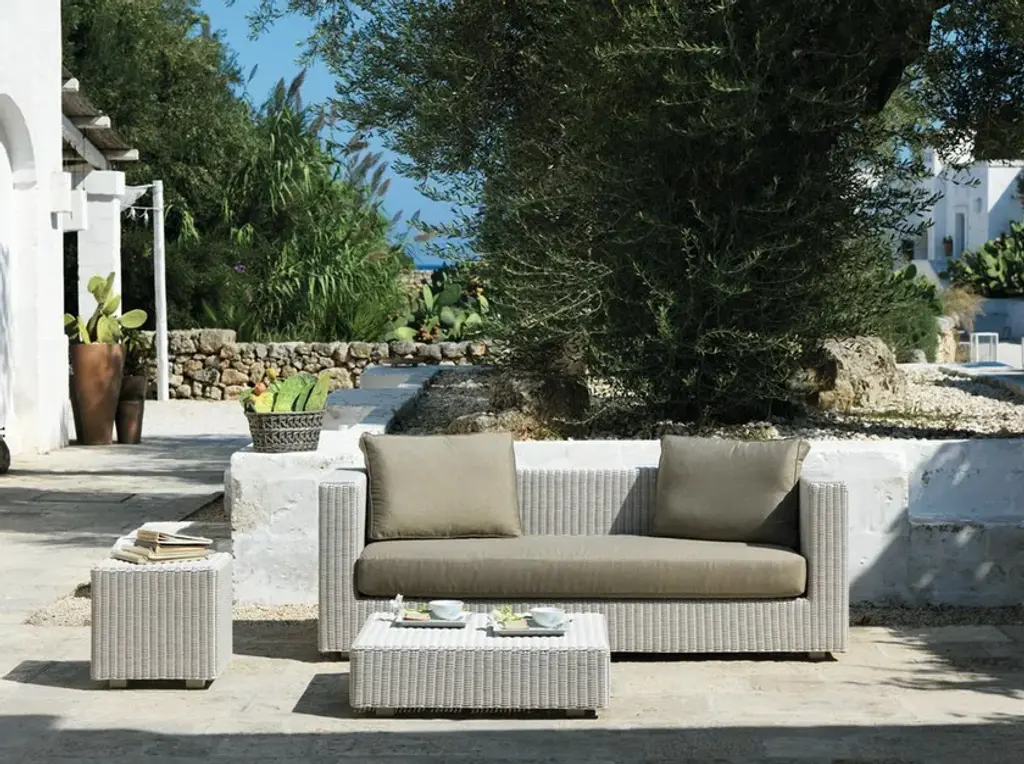 Cube is a three-seater sofa in EtWick fibre including seat cushion (choice of fabric colour) and the frame in bark colour or white.Collection in handwoven etwick fiber with rough finish composed of one-piece and modular sofa, pouf, sunbed, available in two natural colours, bark and white. The textural nature of the Etwick fibre, hand woven to create pure geometries of volumes, is the main feature of the Cube collection: a complete range for creating infinite compositions based on a concept of modularity.