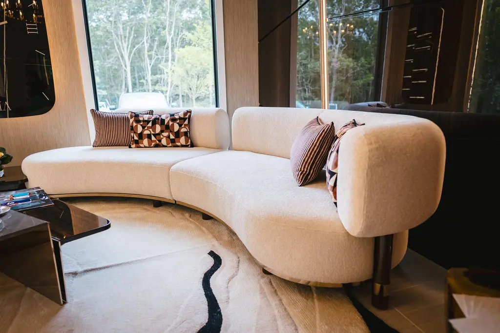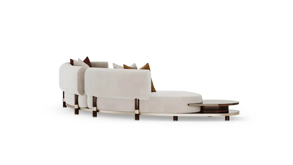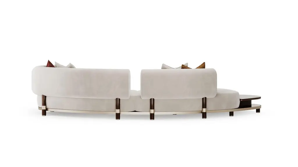 Blosse Sofa embodies fluid elegance with its generous, curved silhouette and soft cream upholstery. Designed to seat over four comfortably, it offers both spaciousness and refinement for sophisticated interiors. A seamlessly integrated walnut side table enhances functionality without compromising aesthetics, bringing natural warmth to the composition. The interplay of sculptural form and thoughtful utility makes Blosse a refined centerpiece for any modern living space. Ideal for social gatherings or serene lounging, its artisanal construction and graceful lines reflect a deep commitment to timeless design and comfort.
