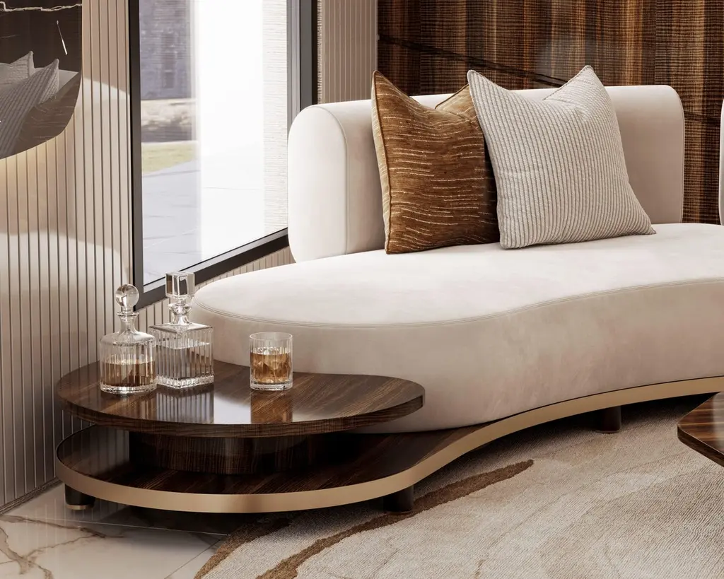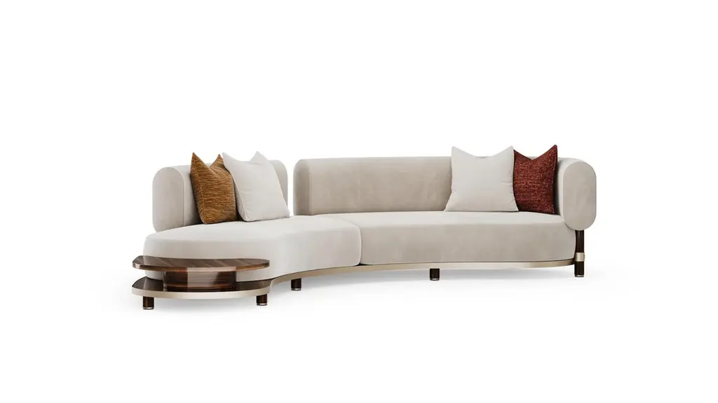 Curved Modern Blosse Sofa In Cream Upholstery With Integrated Walnut Side Table