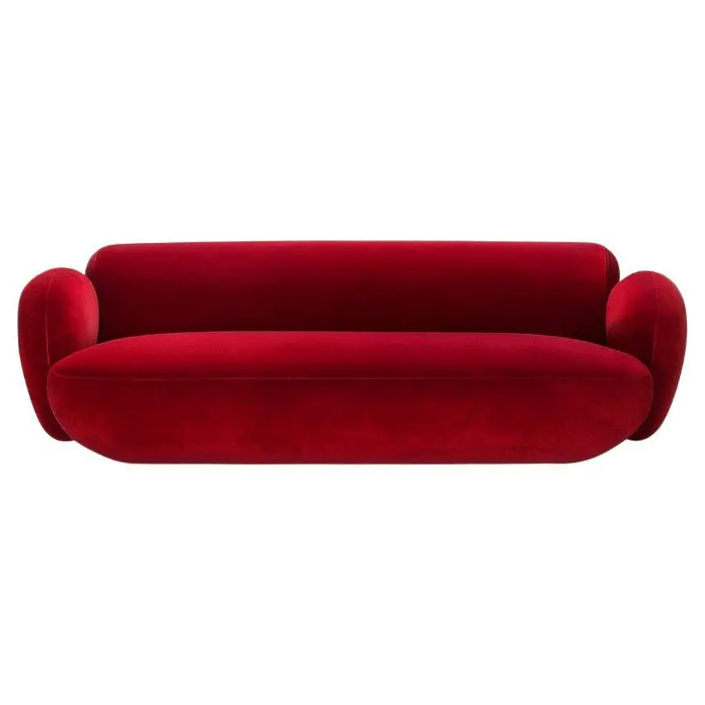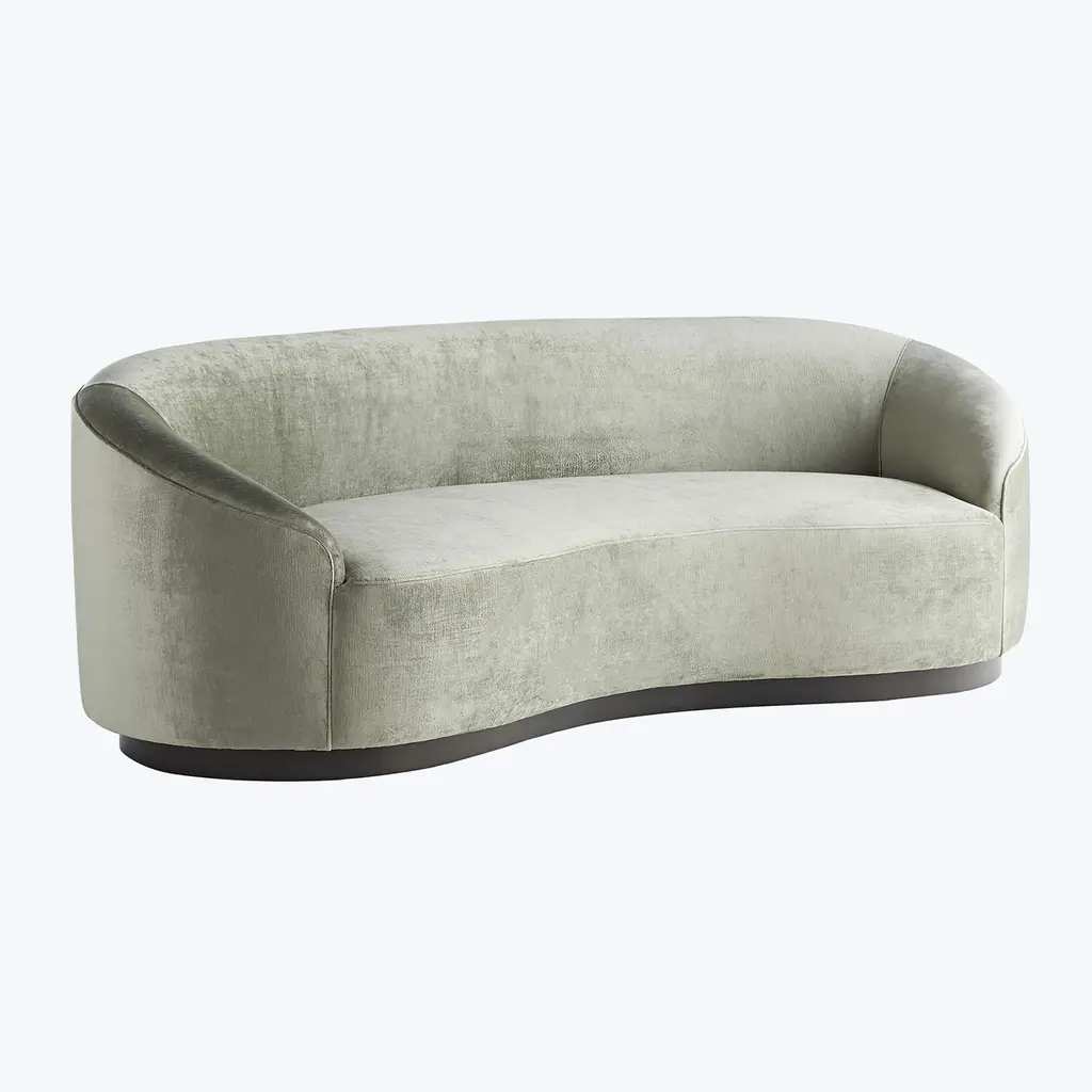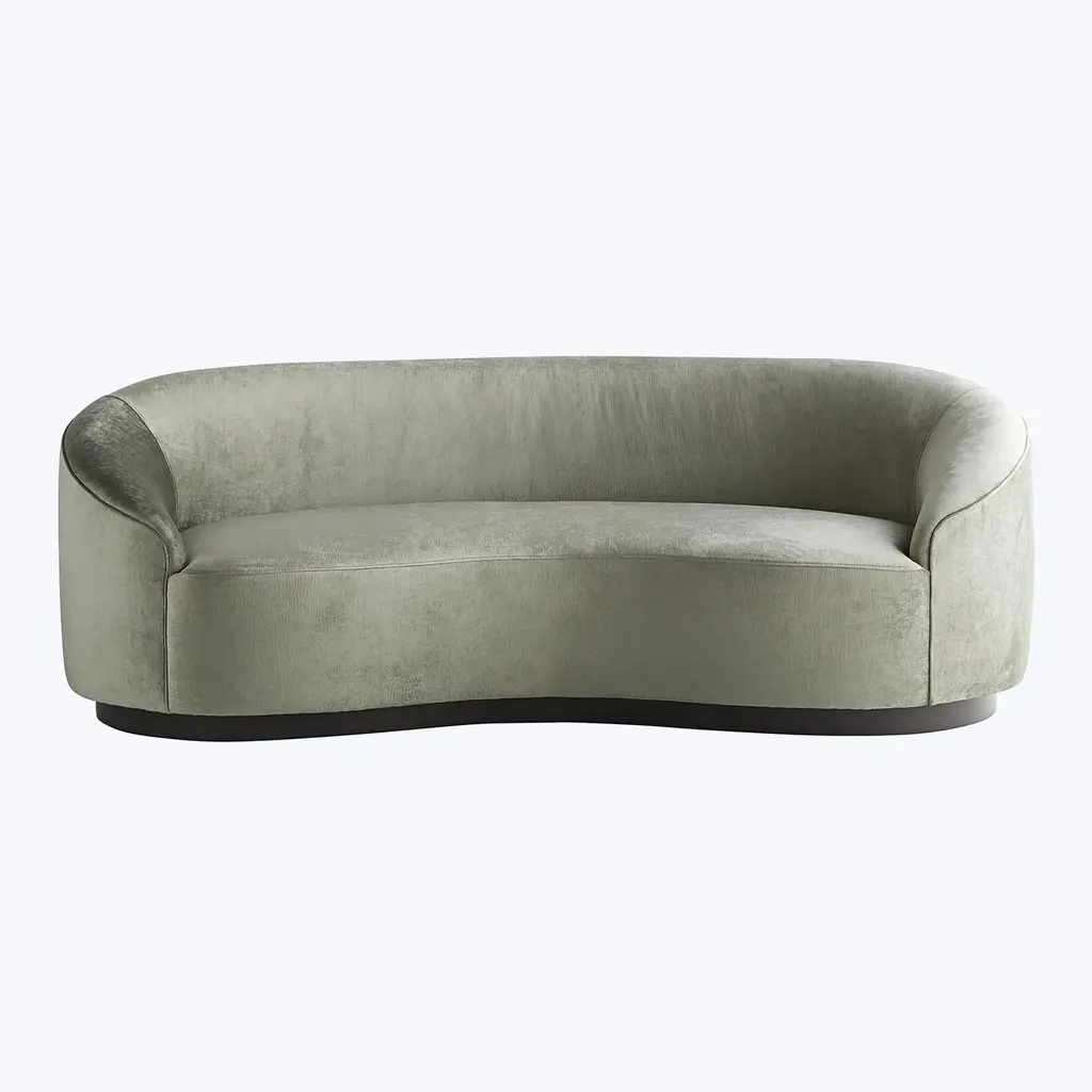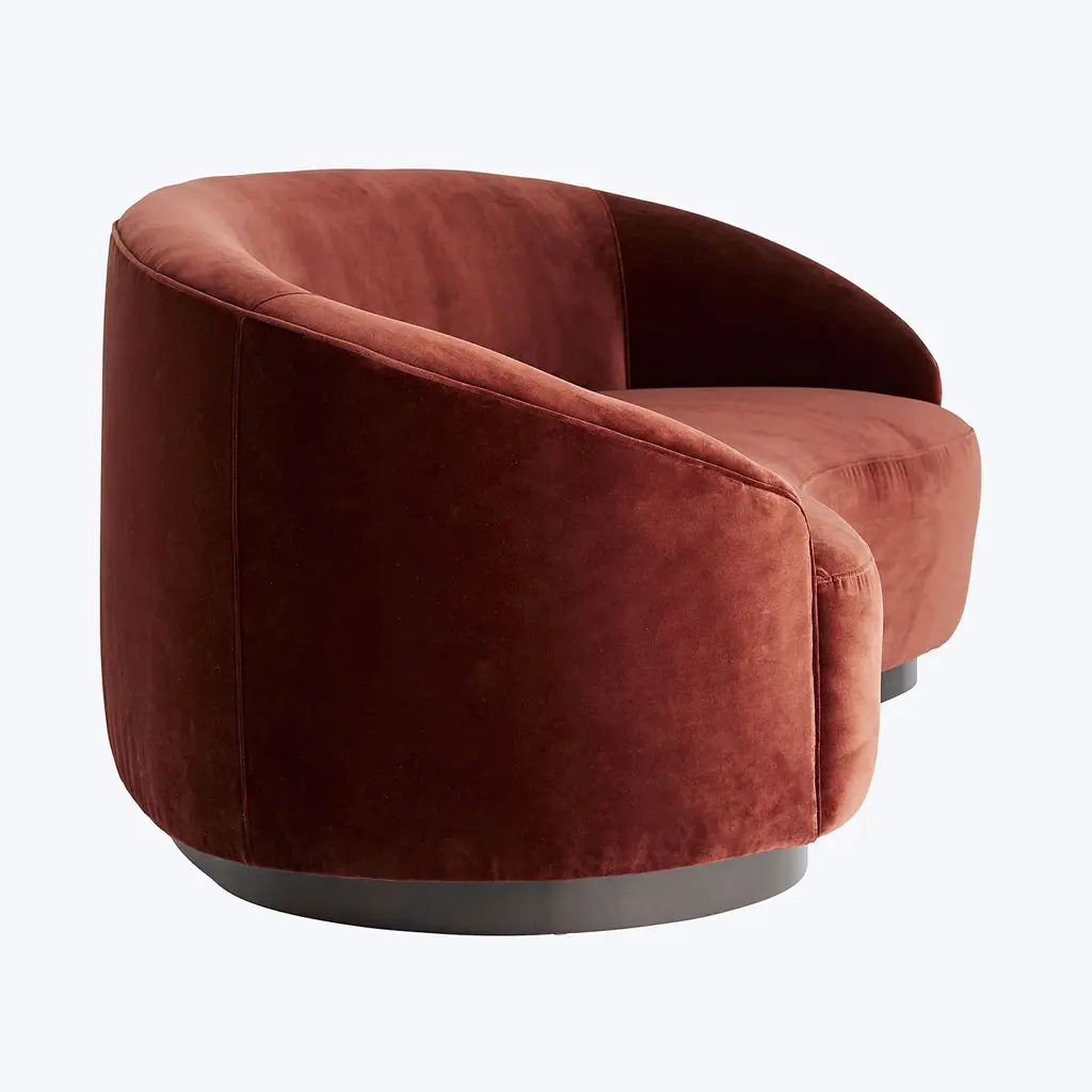 Sink into pleasant moments of relaxation with the Curved Sofa from abc carpet & home's Arteriors Collection. Boasting a simple curved design, this mid-century modern sofa creates a feeling of openness, bringing contemporary and romantic allure to any living space. The curved silhouette of this sofa effortlessly complements both modern and classic interiors. Its size makes it the perfect addition to cozy apartments or rooms with limited space. Its plush cushions and supportive backrest offer a cozy space for relaxation without overwhelming your space. Offered in a visually captivating paprika upholstery, this couch brings depth and character into your home. Whether entertaining guests in your living room or adding a cozy seating option to your office, the Arteriors Curved Sofa is sure to offer a cozy place to unwind in style. Pair this sofa with other pieces from the Arteriors Collection to create a cohesive ensemble in your living space. Alternatively, pair this sofa with various pieces from abc carpet & home's catalog to curate a unique interior that reflects your personal style preferences. Experience the perfect blend of style and comfort with our Arteriors Curved Sofa, and transform your living space into a cozy retreat that you'll love coming home to. With its simple curved design and captivating visual appeal, this sofa is sure to become a cherished part of your home.