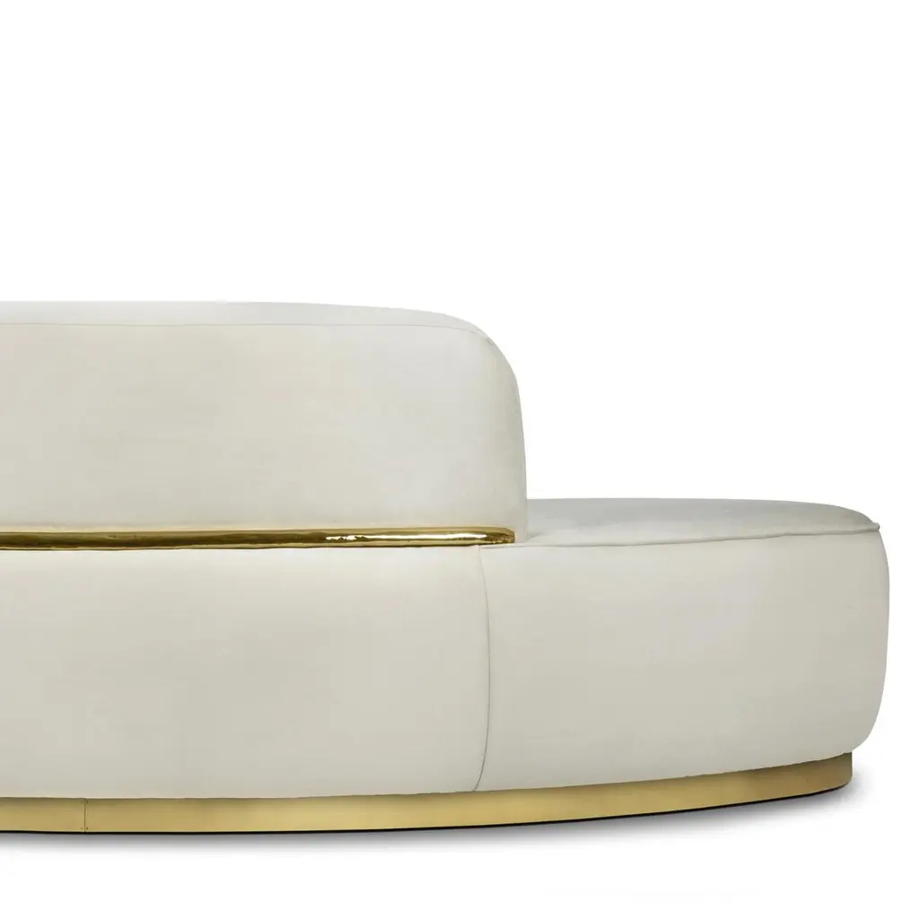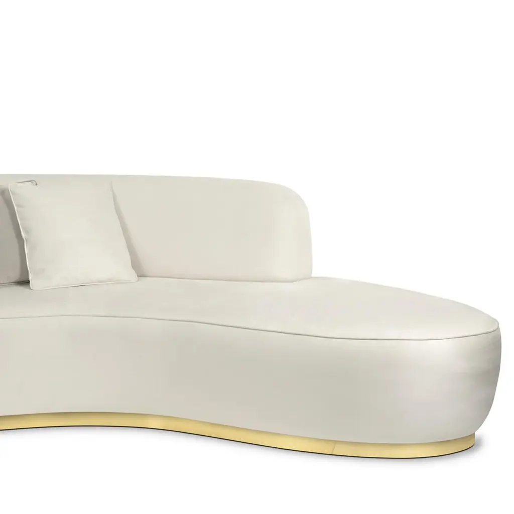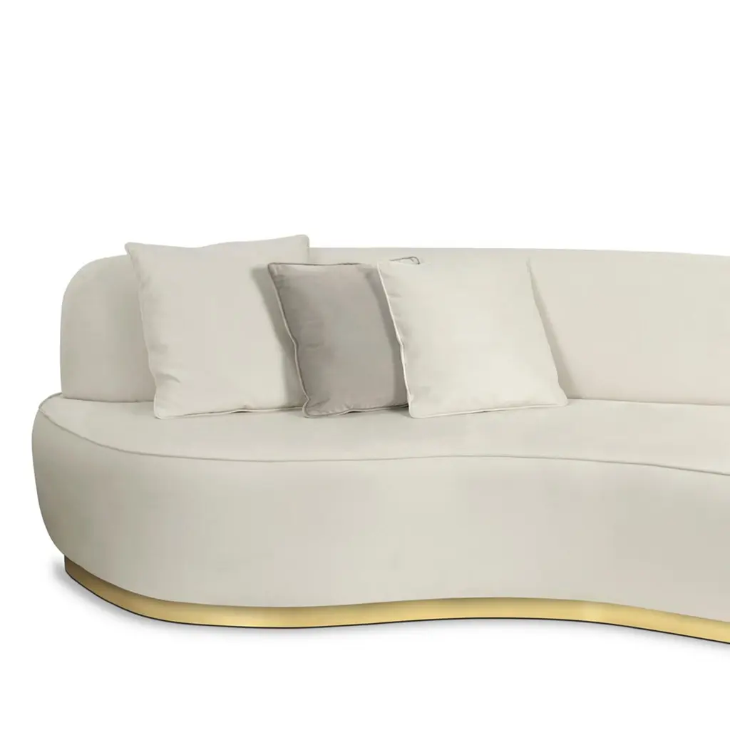 Sofa curved white with structure in solid wood withcasted base in polished brass. With Suede fabric inwhite. With cushions included.Also available in different fabrics with three cushions included.