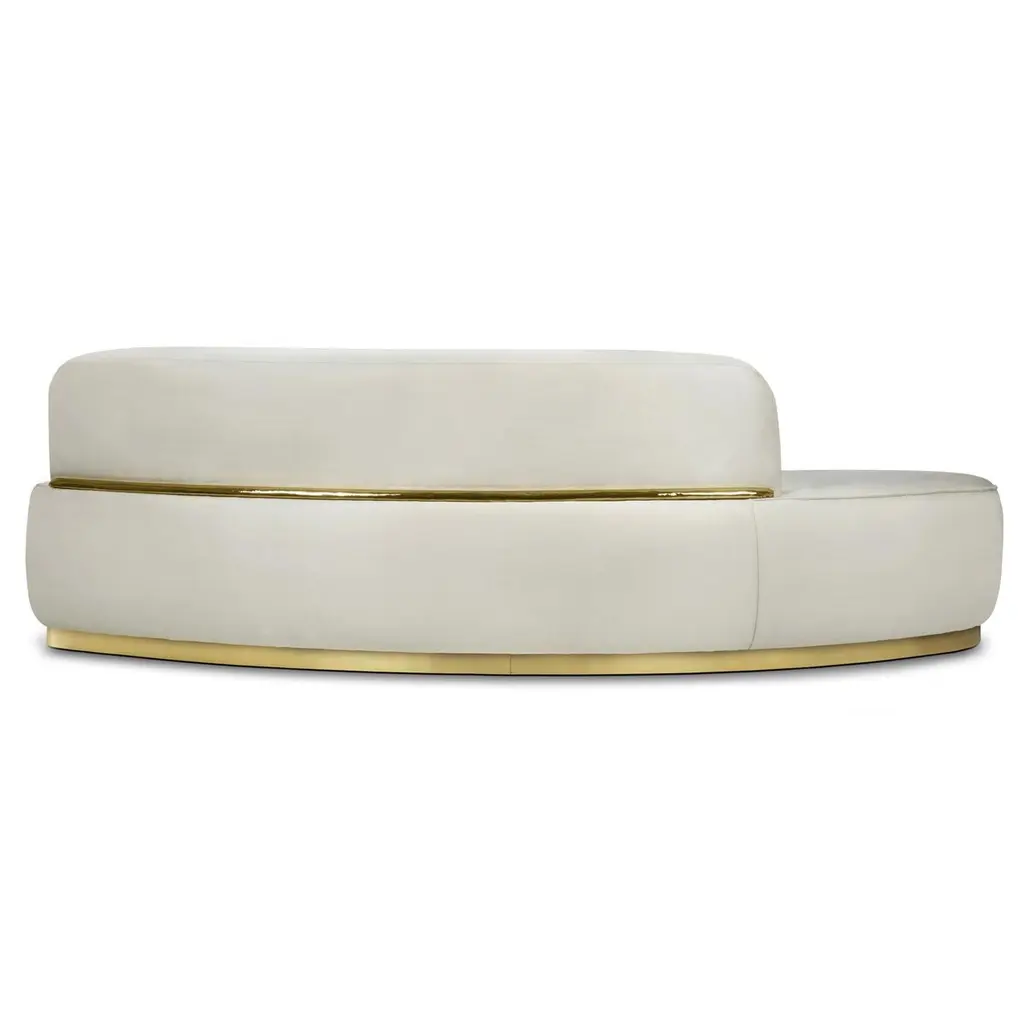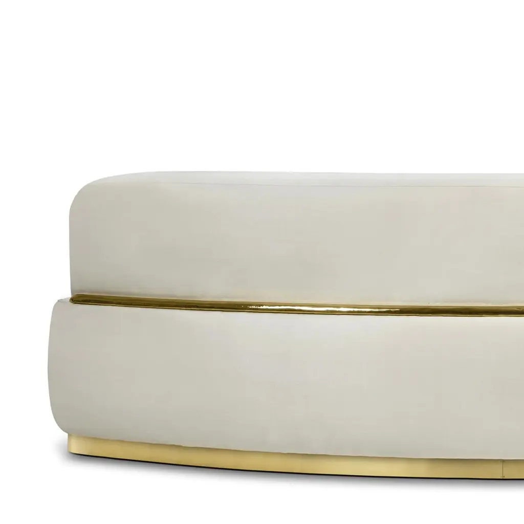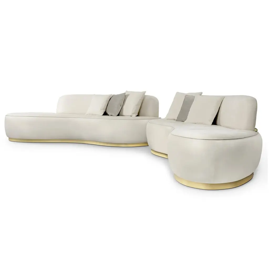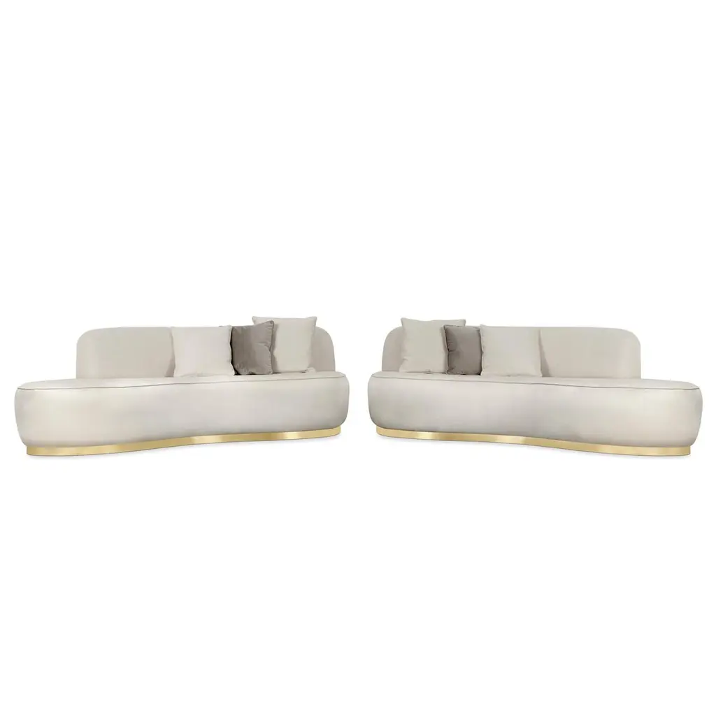 Sofa curved white with structure in solid wood withcasted base in polished brass. With Suede fabric inwhite. With cushions included.Also available in different fabrics with three cushions included.