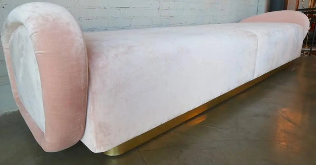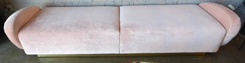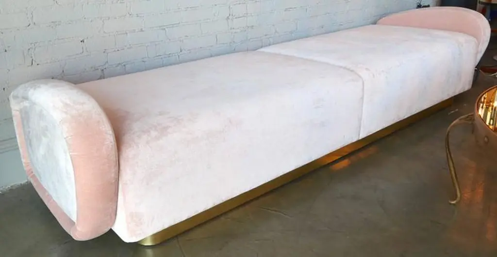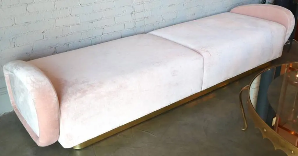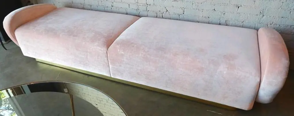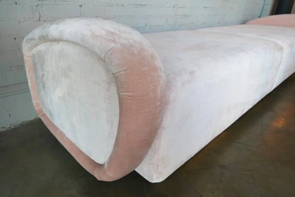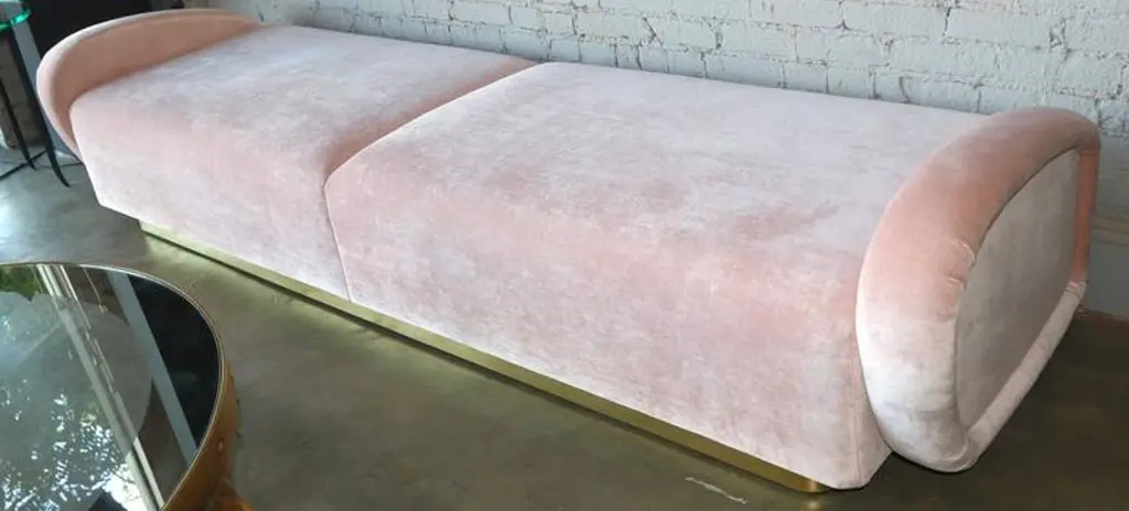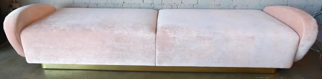 Custom 1960s Italian style sofa or bench with handmade brass base upholstered in light pink velvet. Made in Los Angeles by Adesso Imports. Can be done in different colors, fabrics and finishes.
