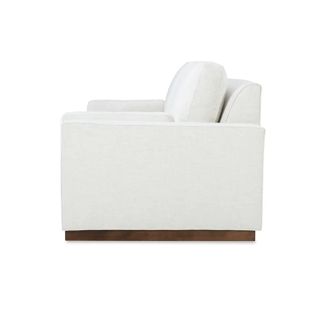 With two loose back cushions and a boxed cushion seat, with low profile arms, raised on a simple stepped-back wooden plinth base.Proudly made in the USA, each piece boasts traditional 8-way hand-tied construction and toxin-free, kiln-dried solid Maple frames sourced from US-grown trees.Tailor your sofa to match your unique style. We offer a plethora of customization options, from a variety of fabrics and leathers to different leg finishes. This is not just furniture; it's a statement piece that reflects your personality.Dimensions: Outside: 95" W x 41" D x 38" HInside: 81" W x 24" D x 18.5" HSeat: 18" HArms: 24.5" HSeat cushion - Comfort DownBack cushion - loose pillow, blendownTwo 6 x 23" bolster pillows included.Pricing below is for one of our common fabrics. Fabric shown may no longer be available.Please contact us for information and further details.Matching armchairs are also available.