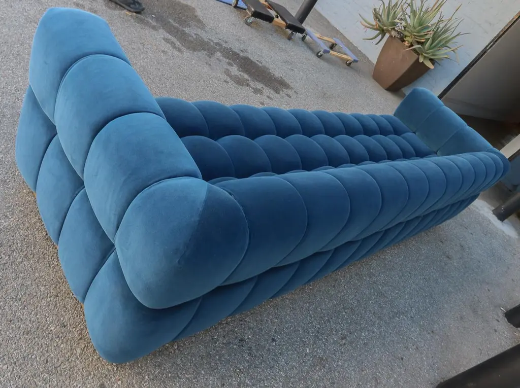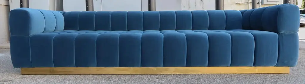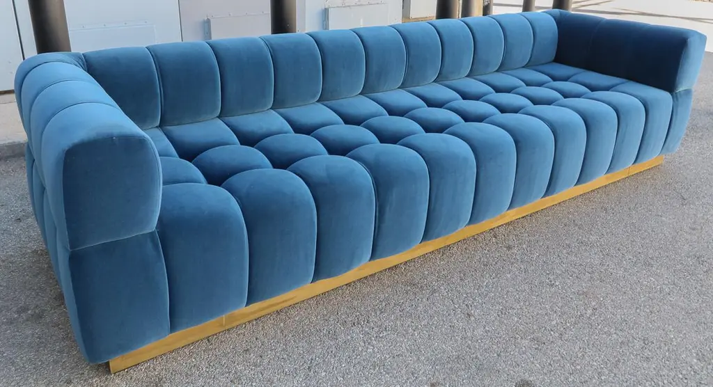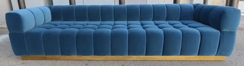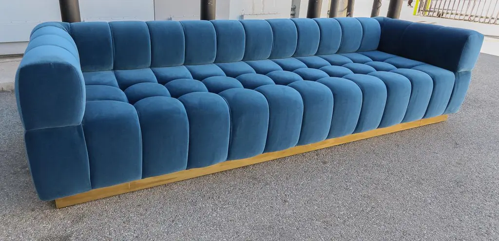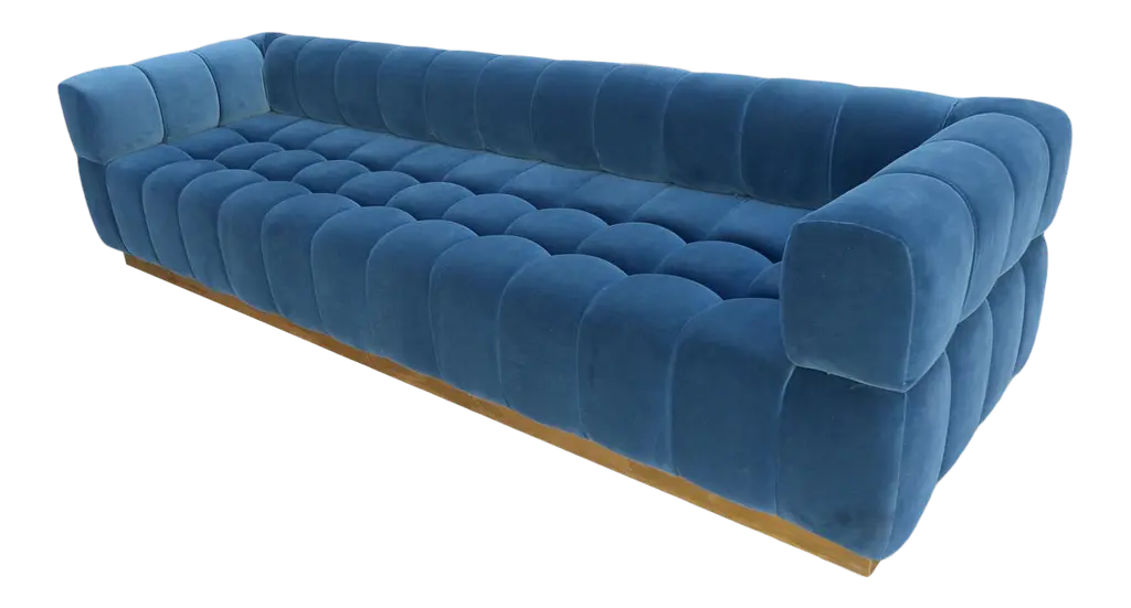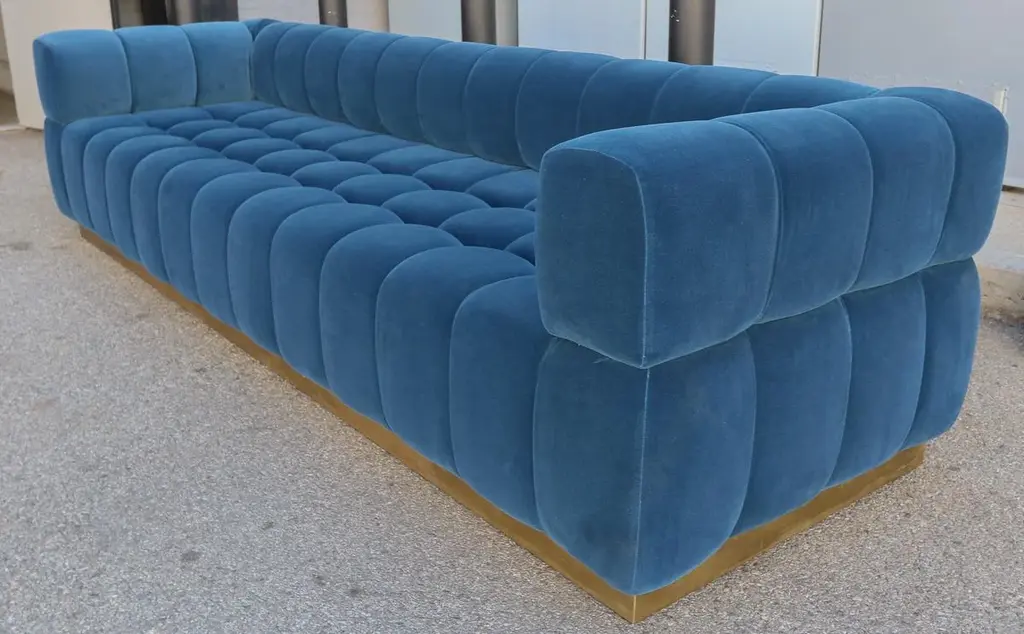 Custom “Oscar” Tufted Blue Velvet Sofa With Brass Base