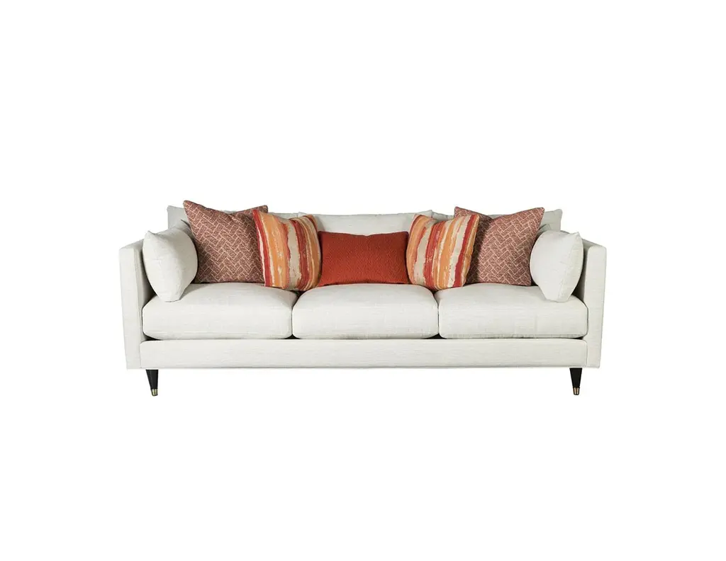 Contemporary style meets comfort in the Pia collection from Jonathan Louis. Plush upholstery is accented by brass-capped legs in a mocha finish. Please note that the sofa pictured is the Pia estate sofa.View the entire Pia collection here.Each piece is priced separately. Contact us to reserve stock or to inquire about custom upholstery. Custom orders have a production lead time of 18-20 weeks.