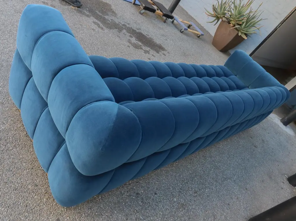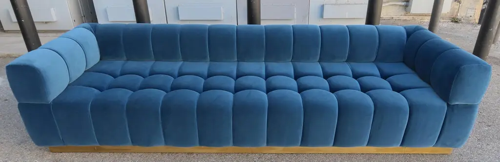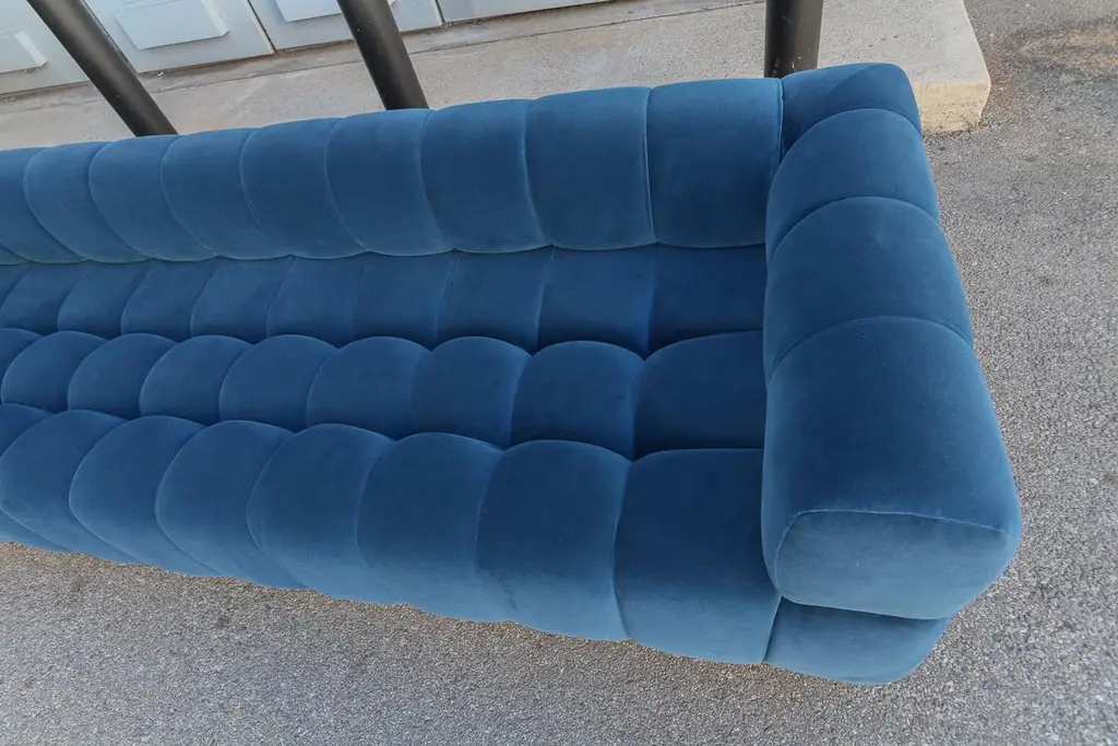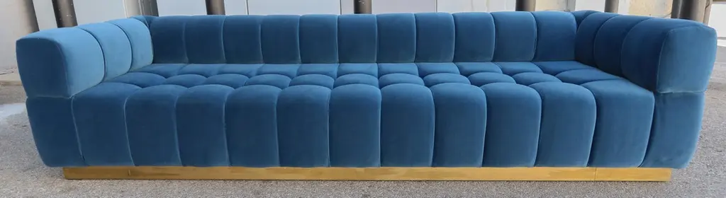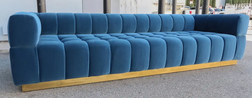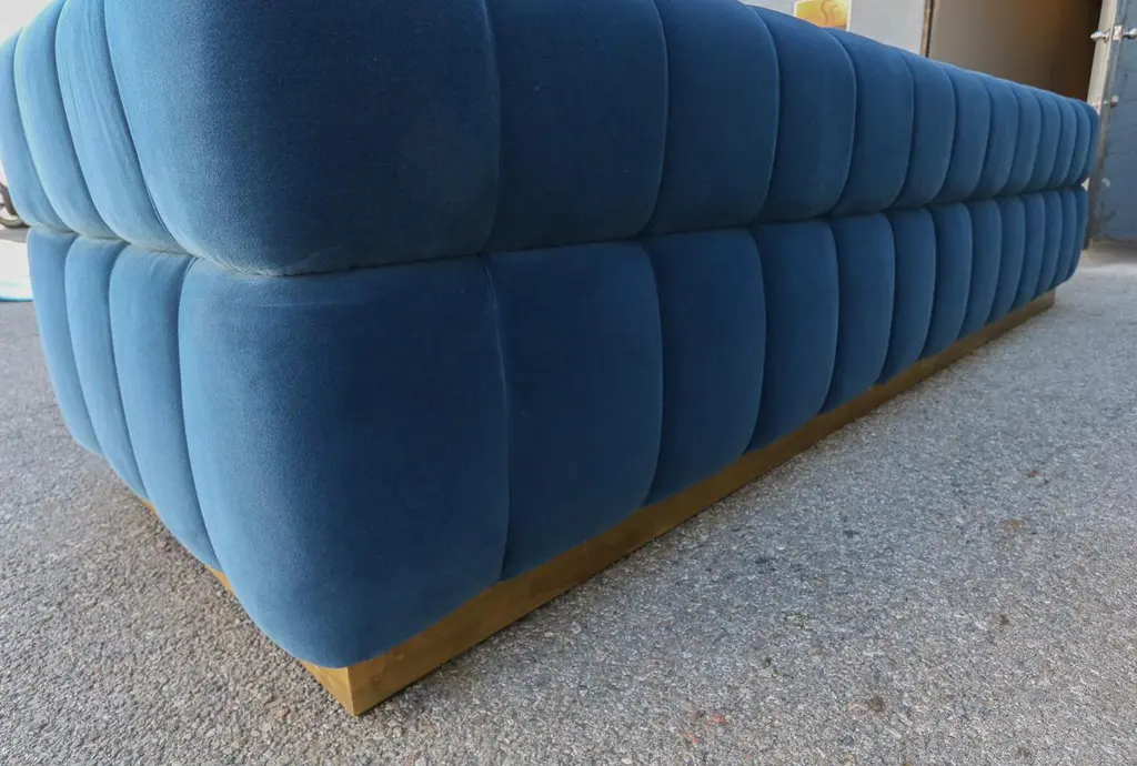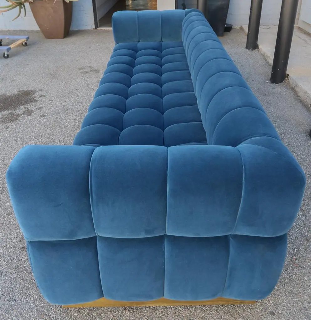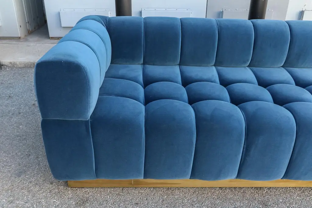 Custom Tufted Blue Velvet Sofa With Brass Base By Adesso Imports