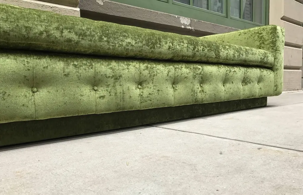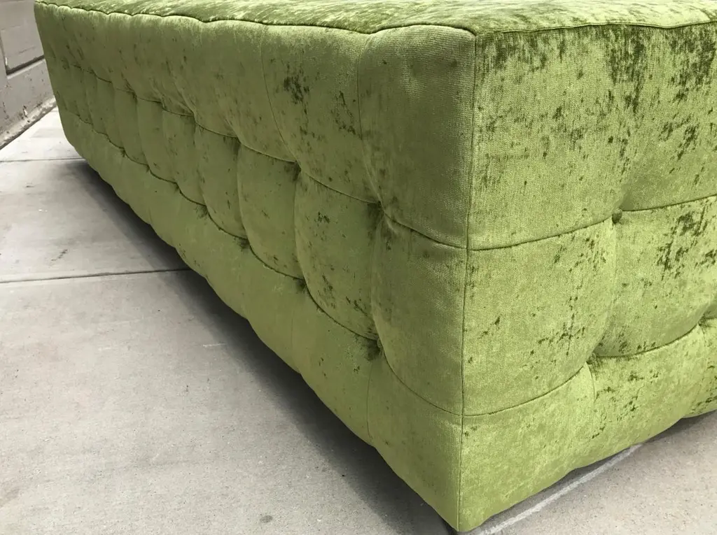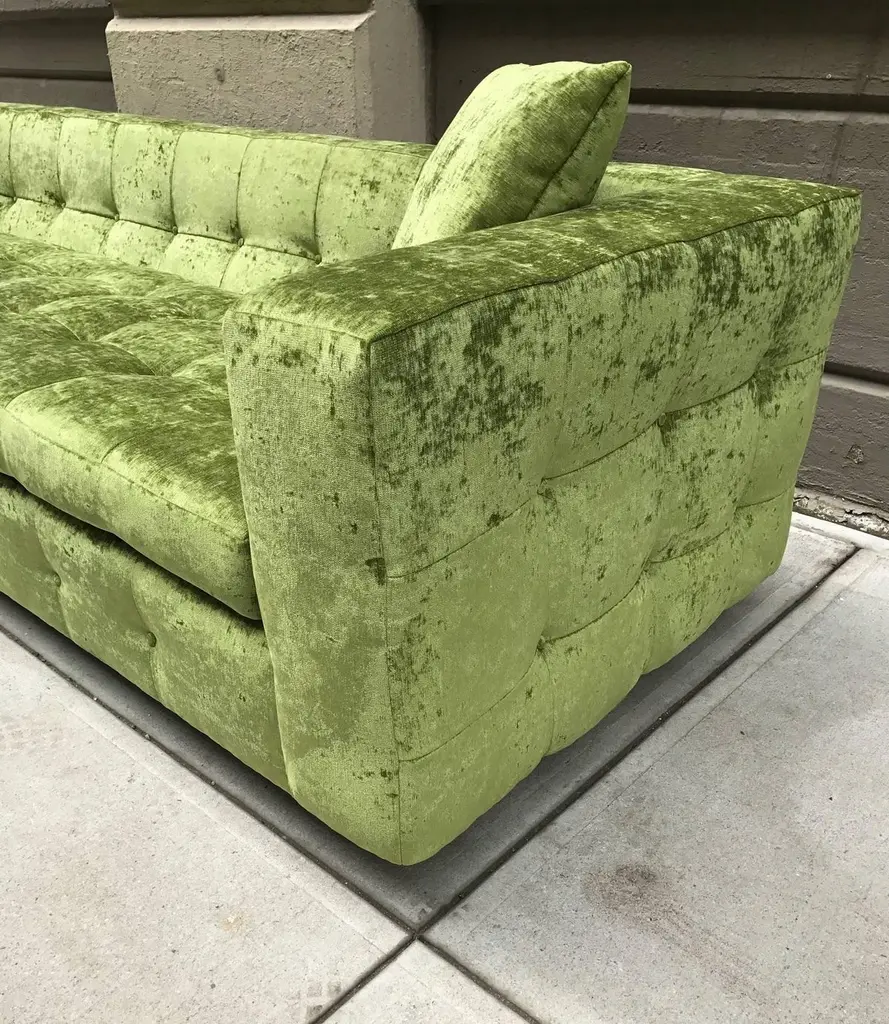 Custom tufted sofa newly upholstered in green velvet on a plinth base. Has loose seat and side cushions.The sofa shown is available now.