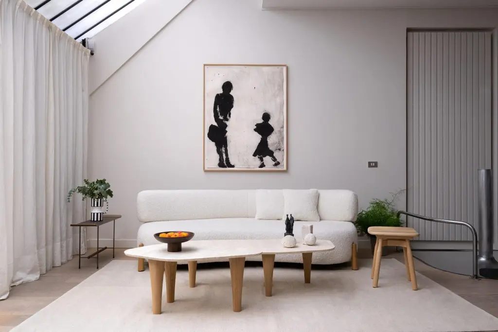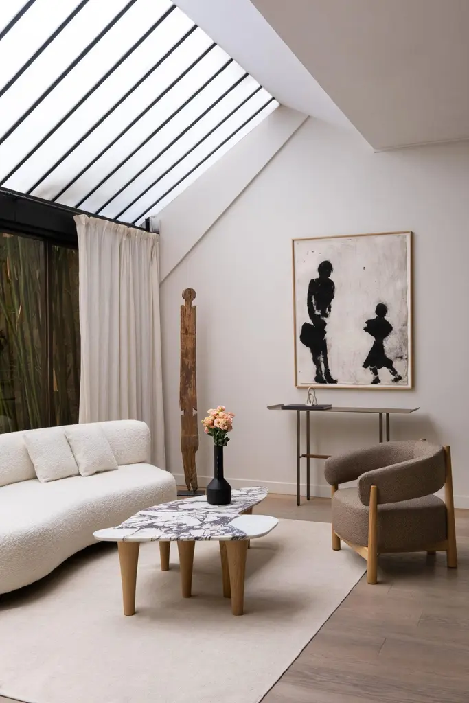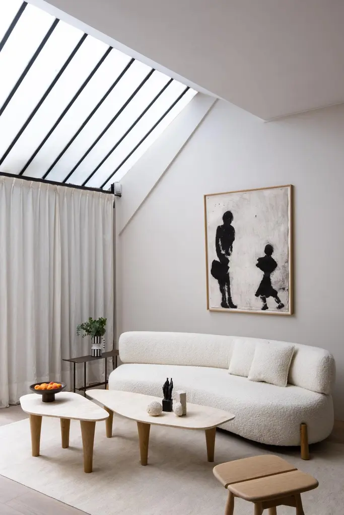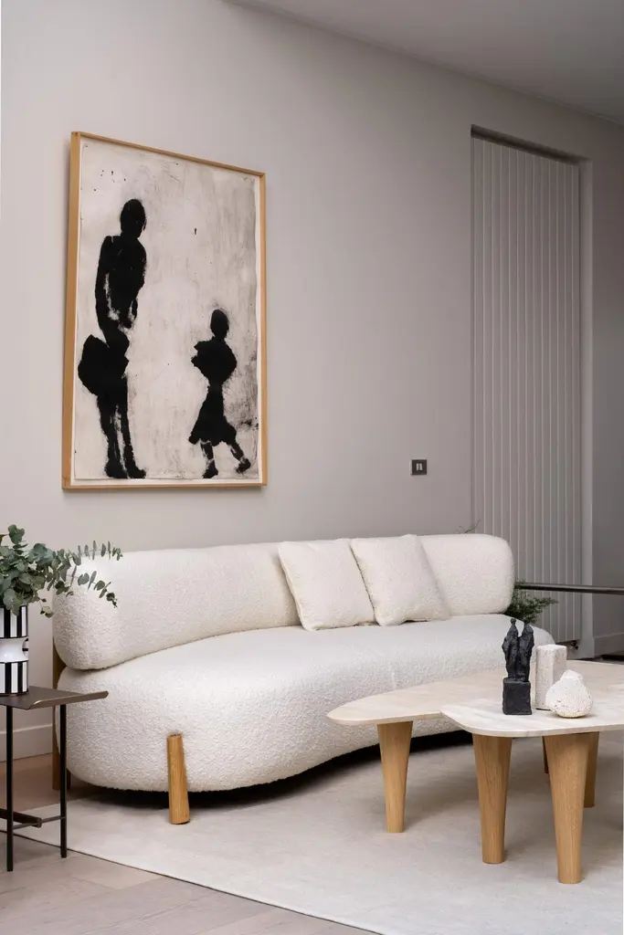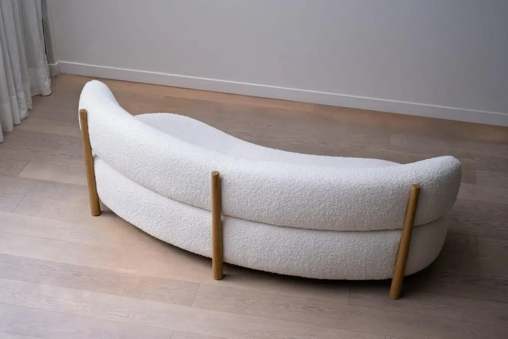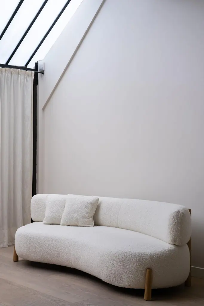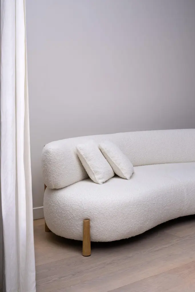 Sofa 3 seaters, structure in natural solid oak or black solid ash. Seat andback in polyurethane foam of different densities, upholstered in fabric.Dimensions: 230x107xH72cm - assise / seat 42cmprice listed for starting fabric.