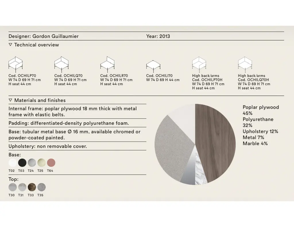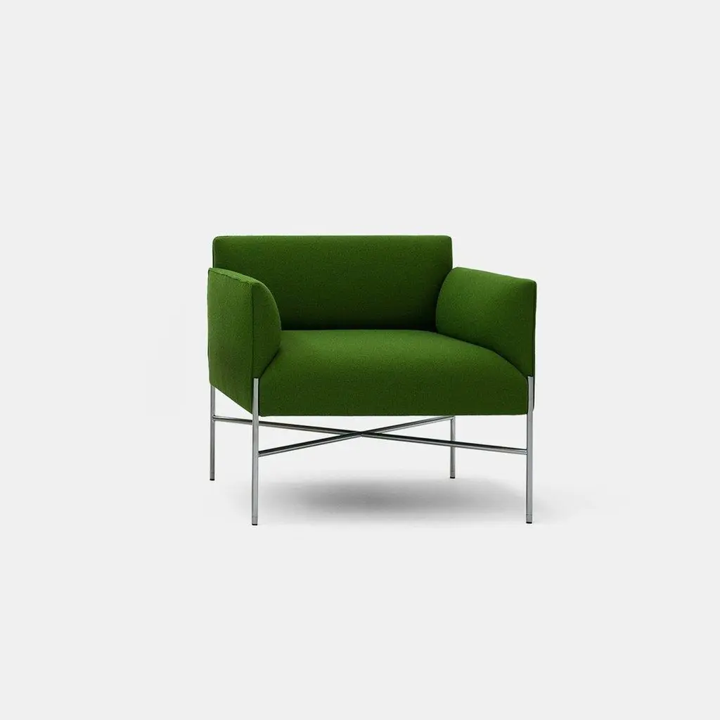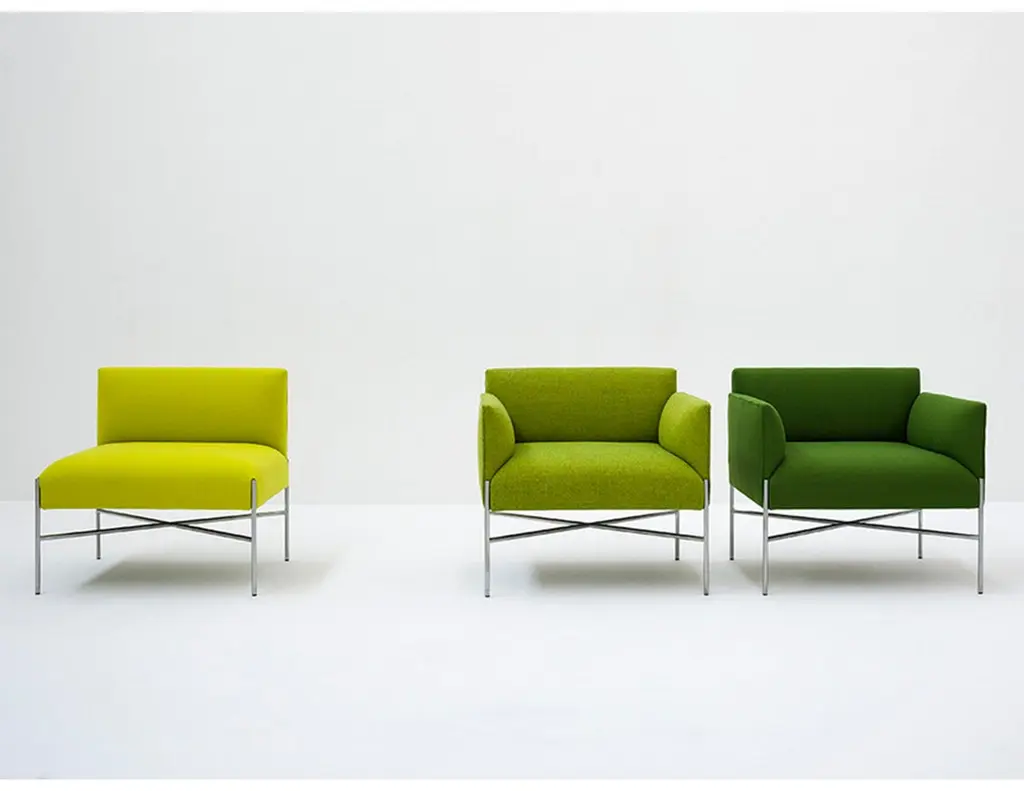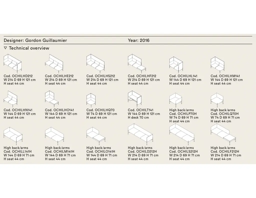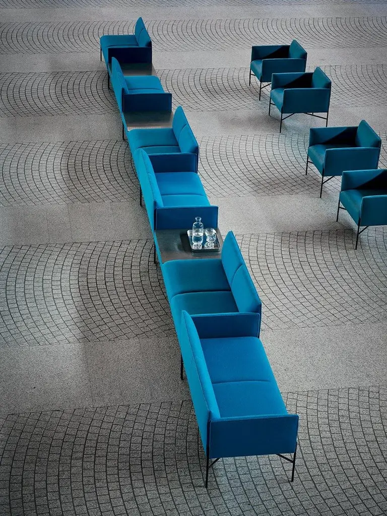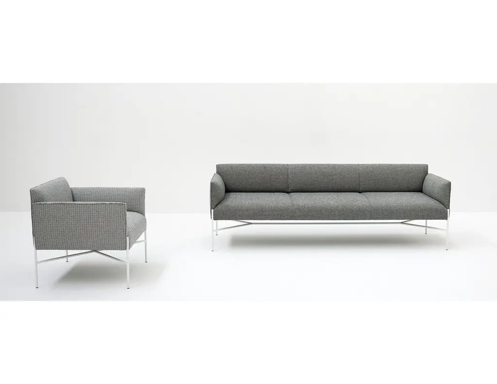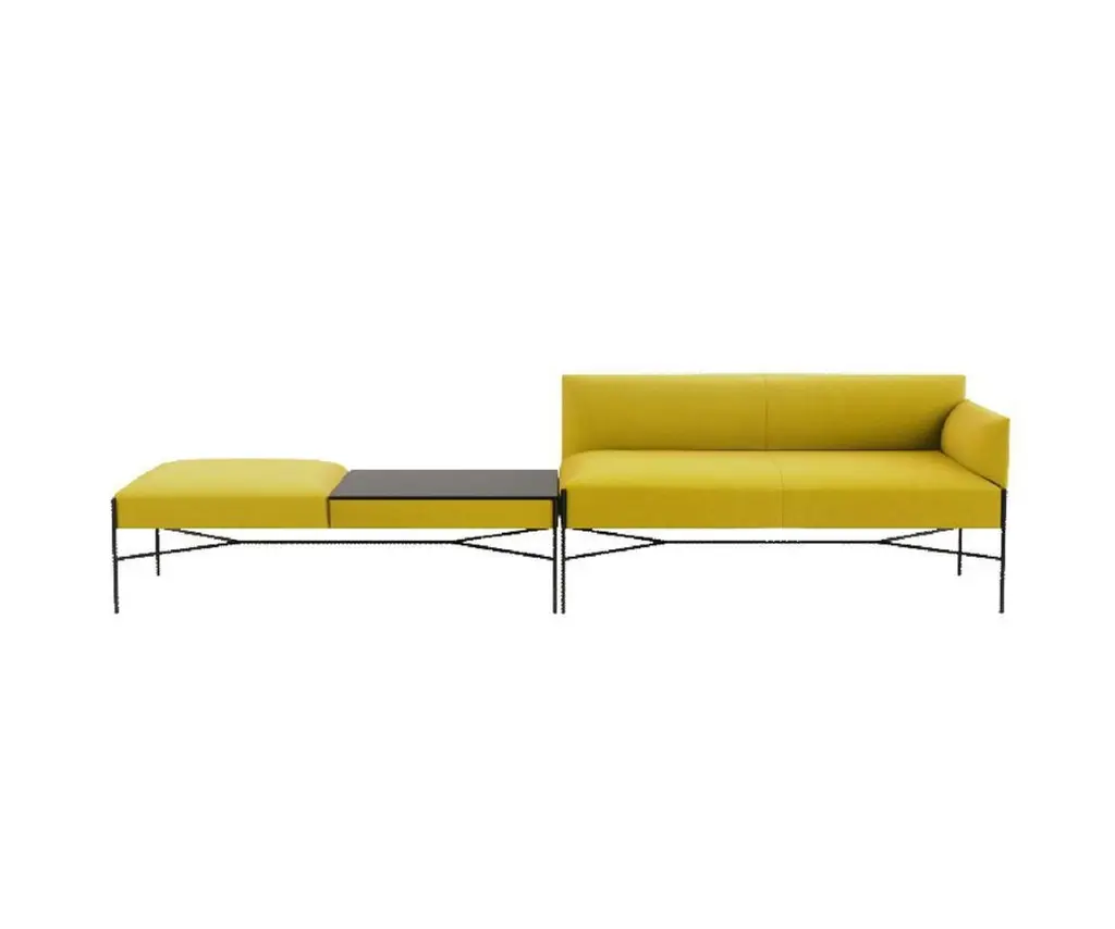 Chill-Out is a system of sofas and armchairs that can stand alone or create a vast range of different linear or corner compositions. It features a light, slim base and cosy, comfortable cushioning, to which back and armrests can be added. An ideal combination both for domestic and collective spaces, particularly in the version with a built-in coffee table.Many different upholstery materials and sizes.Sofa 214 cm with armrests.