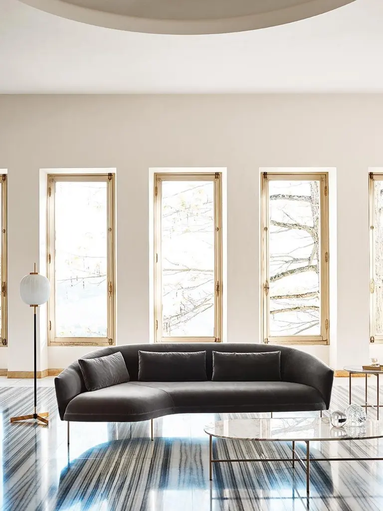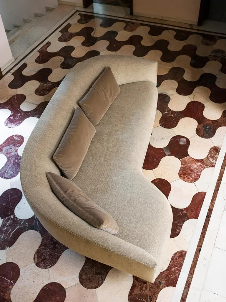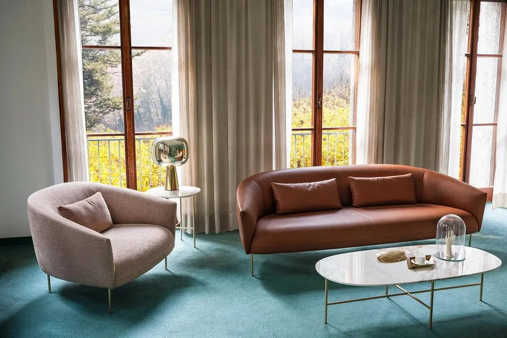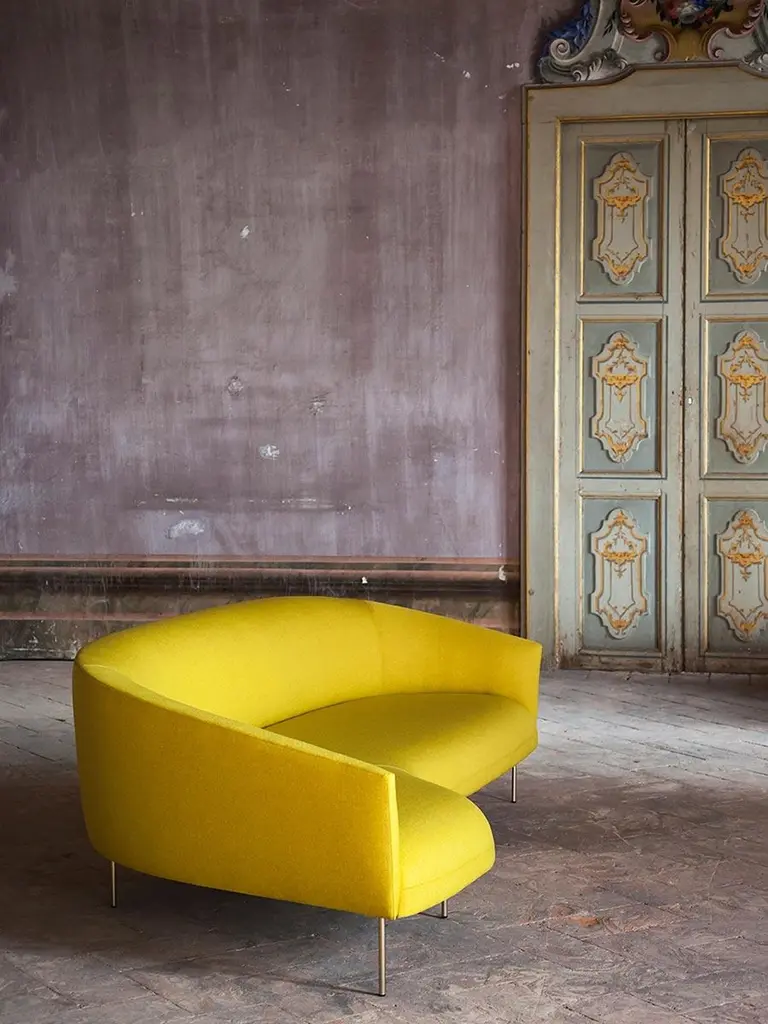 Almost suspended above the floor, with the slenderest of legs upholding a large, cosy seat. Jonas Wagell imagines a family of sofas, inspired by the soft, curving form of a semicircle: this little collection, from armchair to sofa to chaise longue, is called Roma, a strong reference to the classical sphere in which its lines are rooted. With citations from fifties design, not of affectation, but of clear inspiration, this design is “classical” by nature, and not only in name.Awards: Archiproducts Design Awards 2017price listed in COM - Painted or chromed base.