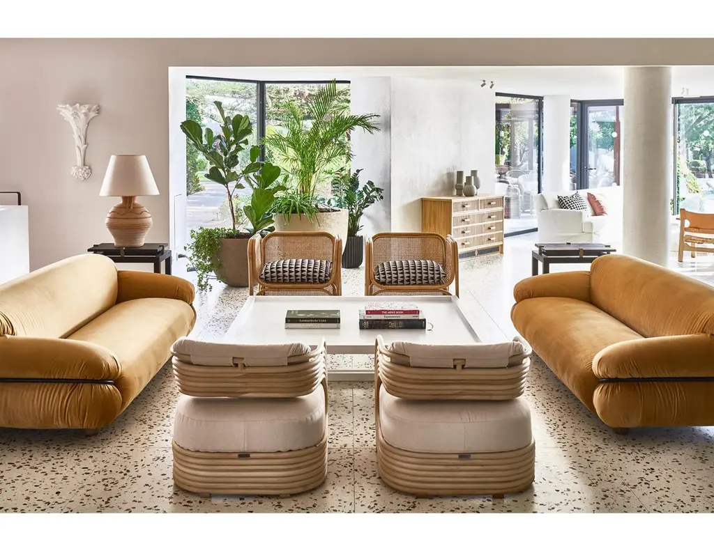 A reissue of a historic design by Gianfranco Frattini, Sesann is a collection of sofas and armchairs with soft, cozy forms that evoke feelings of warmth and sensuality, thanks to the tubular metal frame, which acts as an architectural structure, enveloping, containing and accentuating the cushioning. Sesann commands its space with its bold volumes and elegant, sophisticated design. With a choice of leather or fabric coverings to create striking combinations of colors and textures between the cushions, frame and ashwood feet.Three different sizes available. This one is 180cmInternal frame: cold foam with backrest insert and seat in polyurethane foam. Seat in 18 mm thick poplar plywood and solid fir wood with elastic belts.Base: Painted frame (also available in a chromed metal frame for $6,638)Feet: walnut or gray stained ash.Upholstery: Not removable.