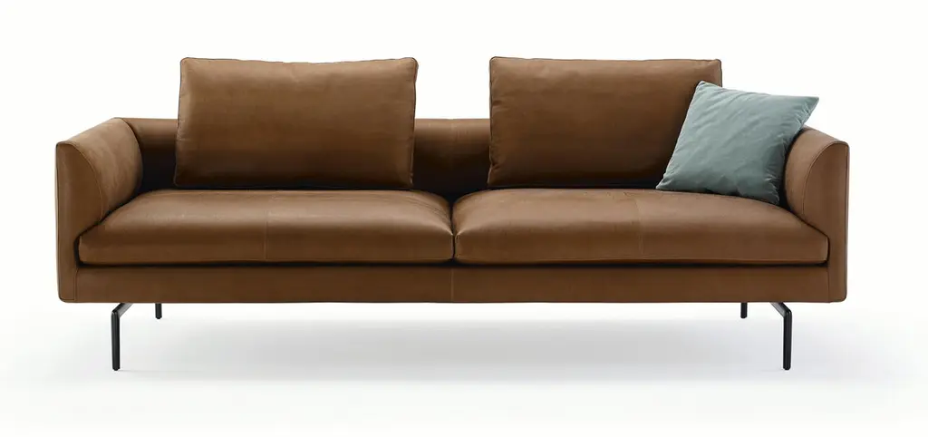Price listed for the starting leather and Nickel-satinfinished feet.Armchair, monobloc and modular sofas. Polished or black painted aluminum alloy feet, or with natural or black nickel-satin finish. Steel frame. Elastic strips suspension. Upholstery in polyurethane/heat-bound polyester fibre. Seat cushion upholstered with graduated polyurethane/heat-bound polyester fibre. Back and lumbar cushions upholstered with goose feathers. Removable fabric or leather cover.“..dependable and enduring.. a comfortable sofa with harmonious proportions that sits naturally at ease within a jovial atmosphere; this is the image I had in mind whilst developing Flamingo”.There is no need to be oversize: Flamingo is comfortable with restrained and well-balanced proportions. The designer affirms to have focused on details: then the sofa linear quality is broken up by the distinctive ‘sweeping arc’ seam to at the front of the armrest, the aluminium alloy legs are slightly inset from the sides which communicate a sense of lightness, the padded parts feature established seating places, while the backrest and armrests are formed by one single piece of the same height, interrupted by cushions in different sizes.
