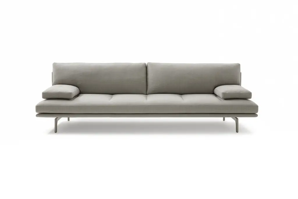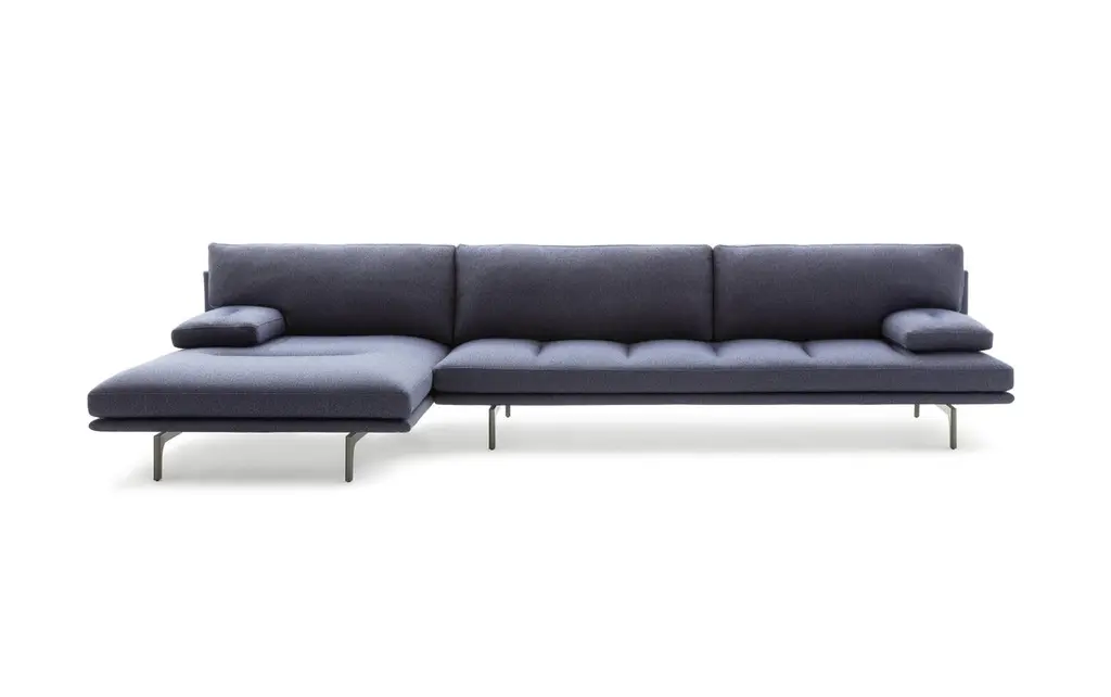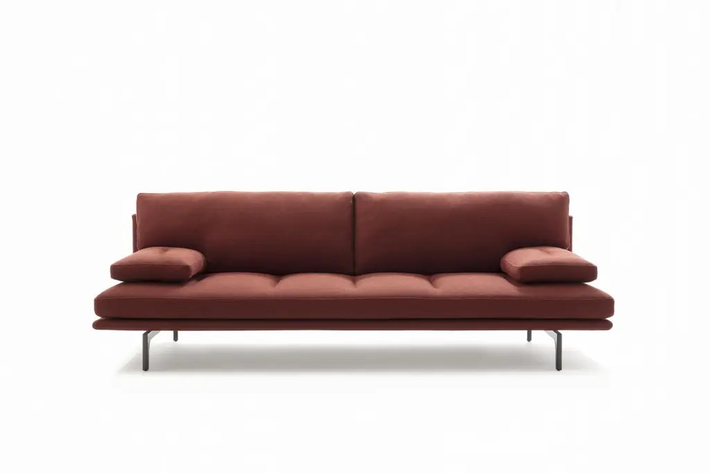 Monobloc, modular sofas and pouf. Aluminum alloy feet, with natural or black nickel-satin finish. Steel frame. Elastic strips suspension. Single seat cushion in graduated polyurethane/heat-bound polyester fibre; backrest cushions in Solotex® and armrests in Solosoft®. Removable fabric or leather cover.Milano+ is the newest design evolution of Milano, the monobloc sofa first introduced in 1982. This new series of elements, with the addition of a long armchair and rectangular pouf, can create an extended range of modular solutions, both linear and angled. This sofa stands out for its essential form and its rigorously rationalist proportions. The generous seat is divided into vertical bands with parallel stitching, and rectangular cushions serve as both backrests and armrests, in an informal approach to upholstery. Aluminium alloy feet, now more modern in form and in material, confer renewed lightness and a slim line to the overall volume. An elegant, refined sofa of timeless design.
