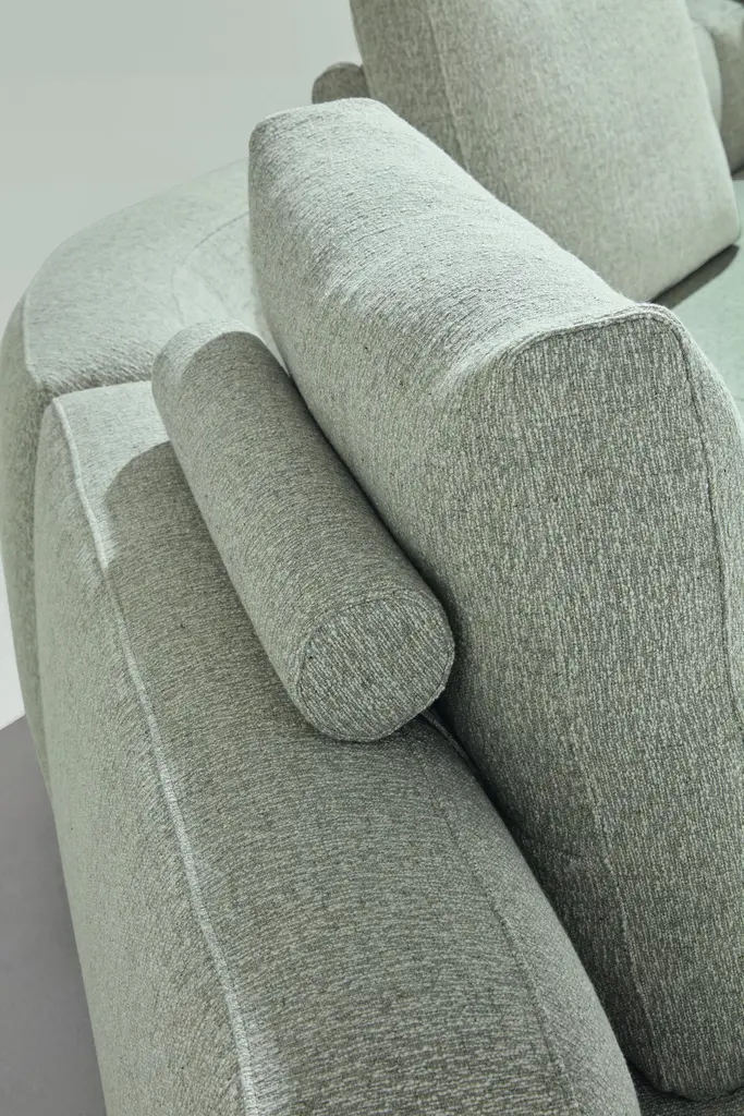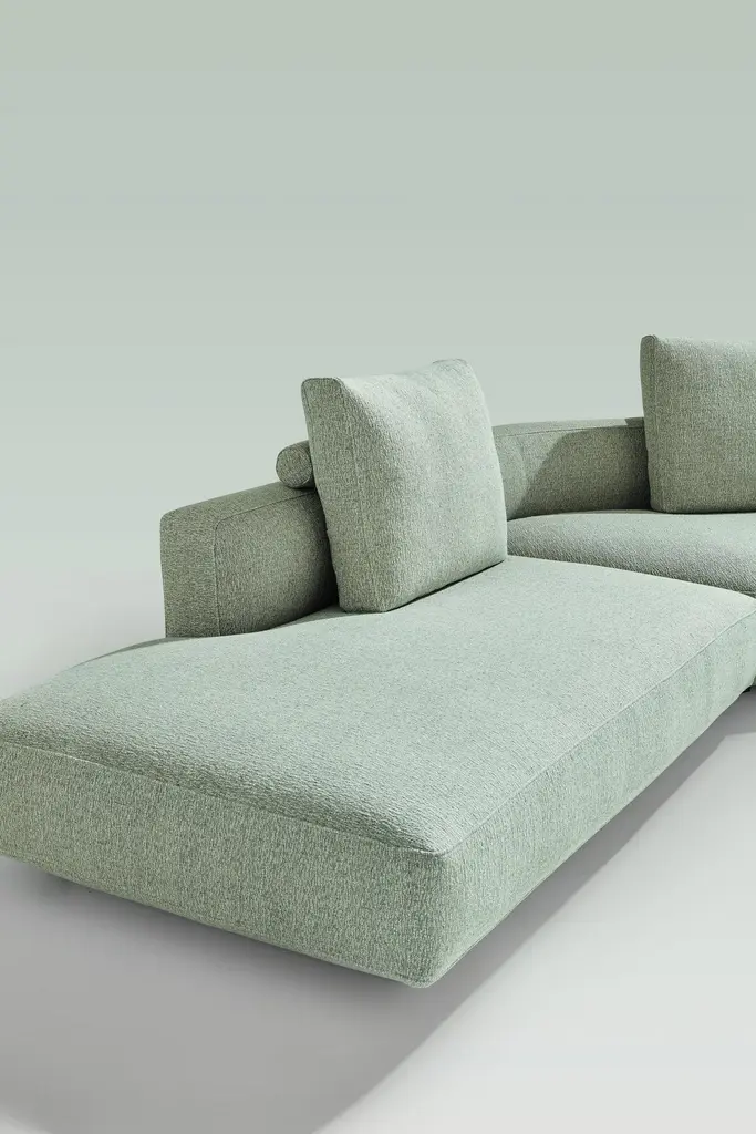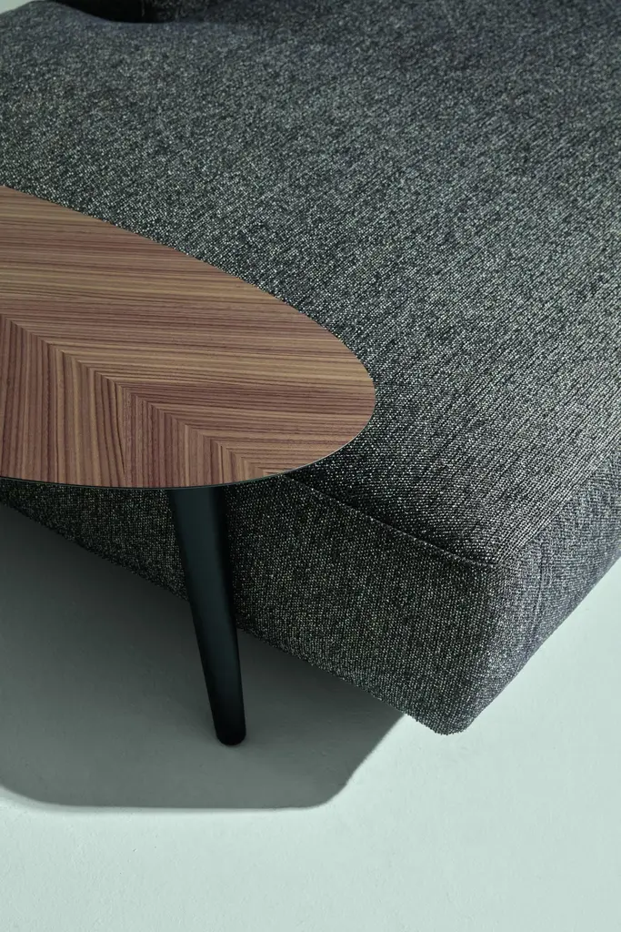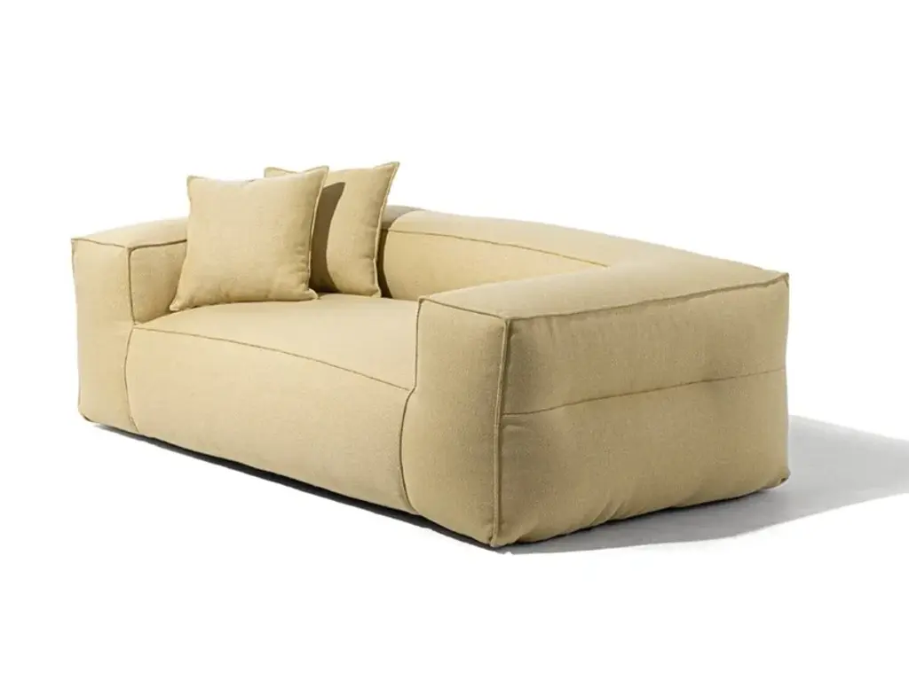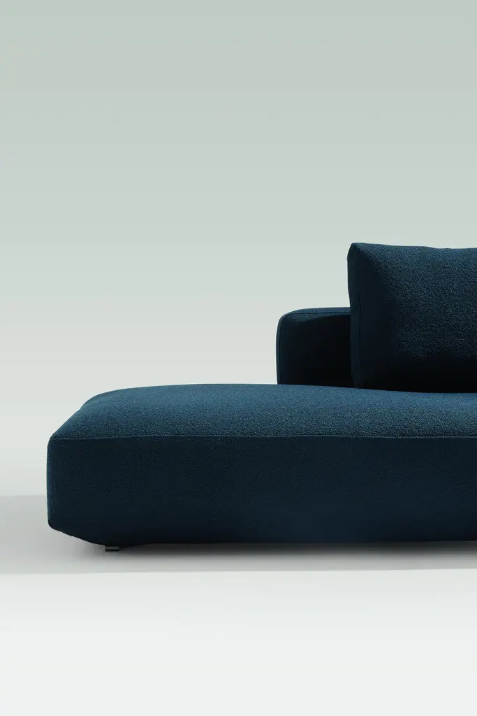 Monobloc sofa and pouf. Graphite painted steel feet. Wooden frame. Elastic strips suspension. Seat upholstered in graduated polyurethane/Dacron Du Pont with quilted insert of 100% pure goose feathers. Backrest and armrests upholstered in graduated polyurethane/Dacron DuPont with quilted insert of 100% pure goose feathers and polyester fiber flakes. Fixed internal nylon cover. Removable external cover in fabricor leather.
