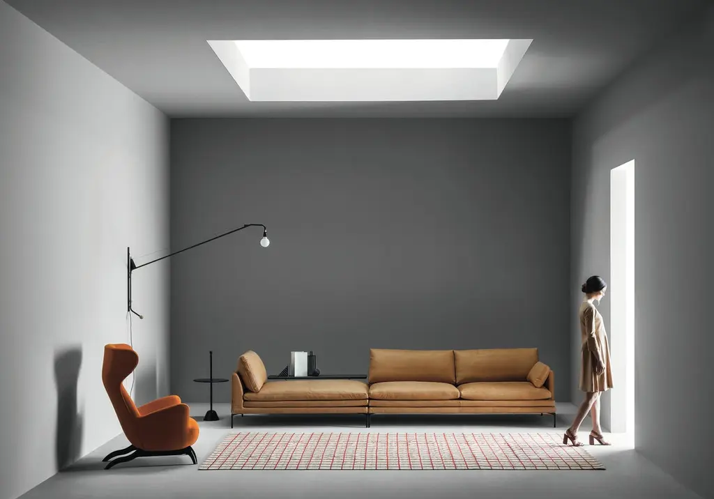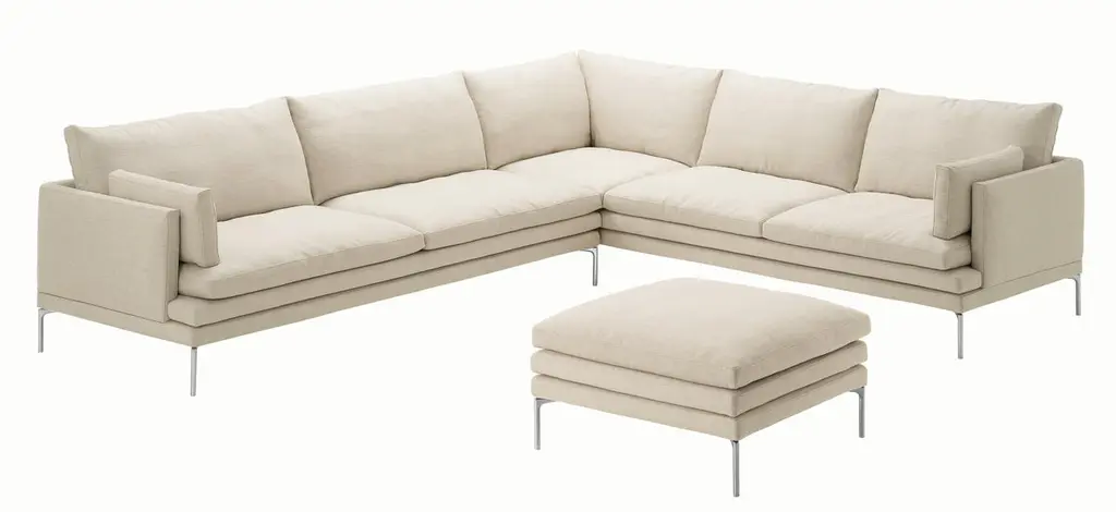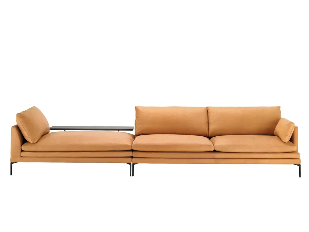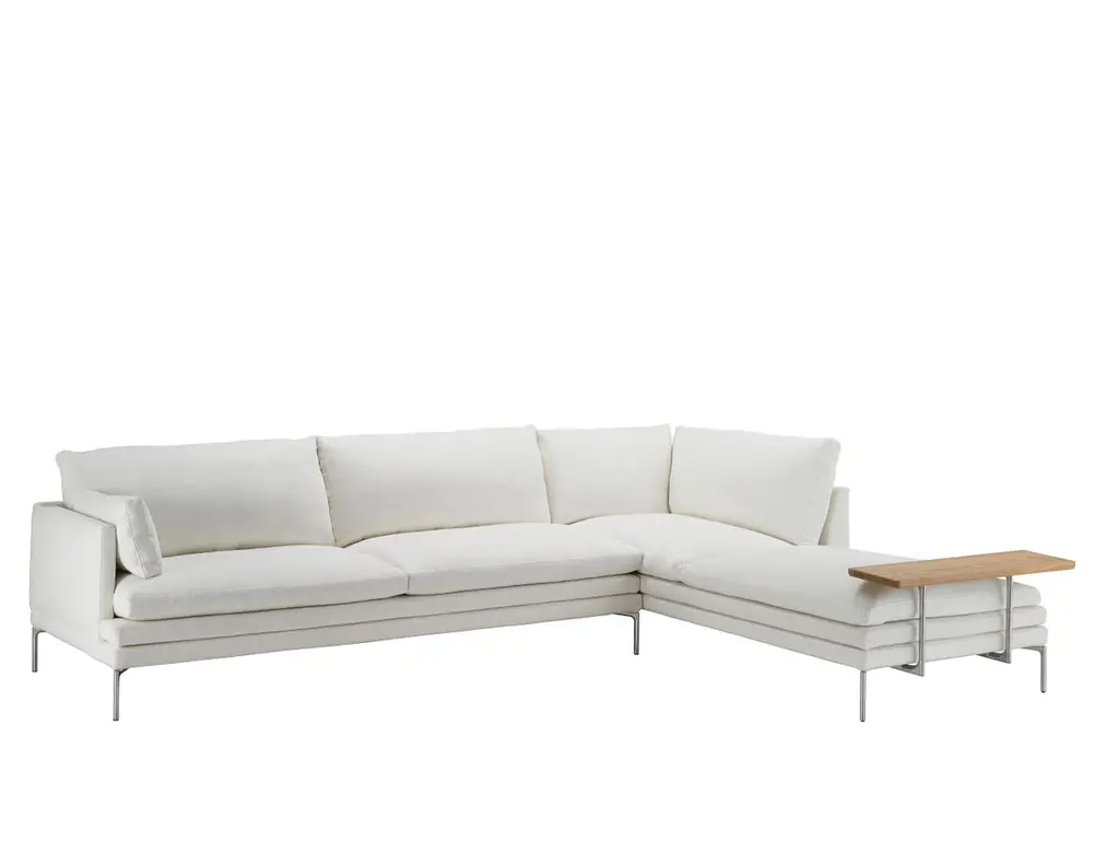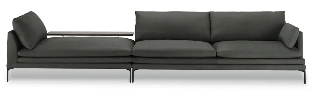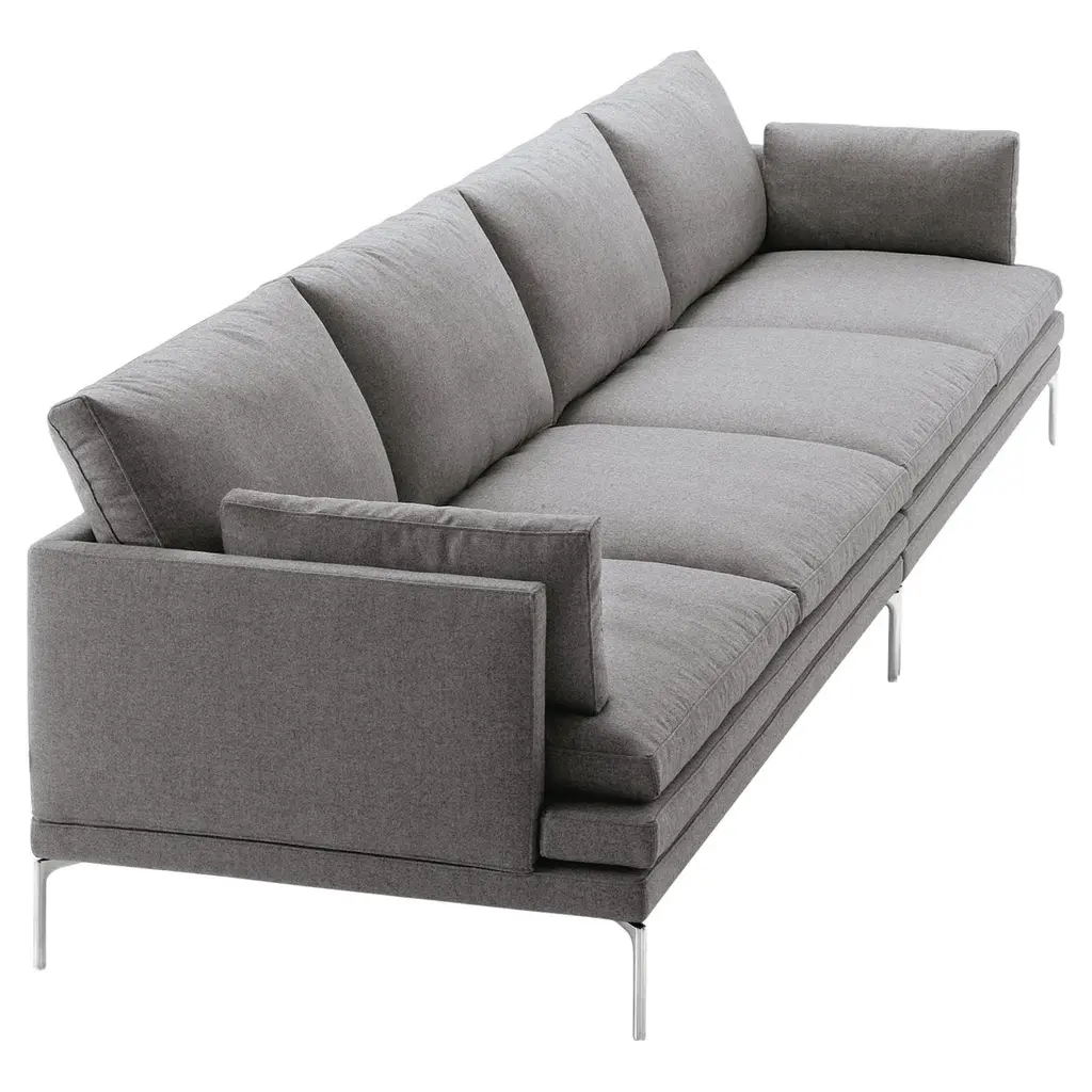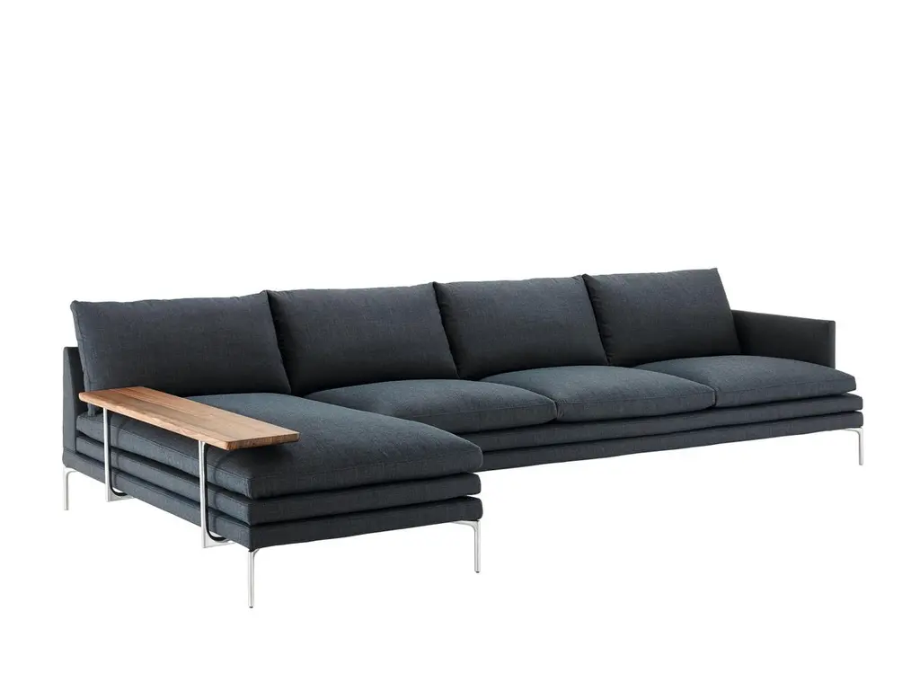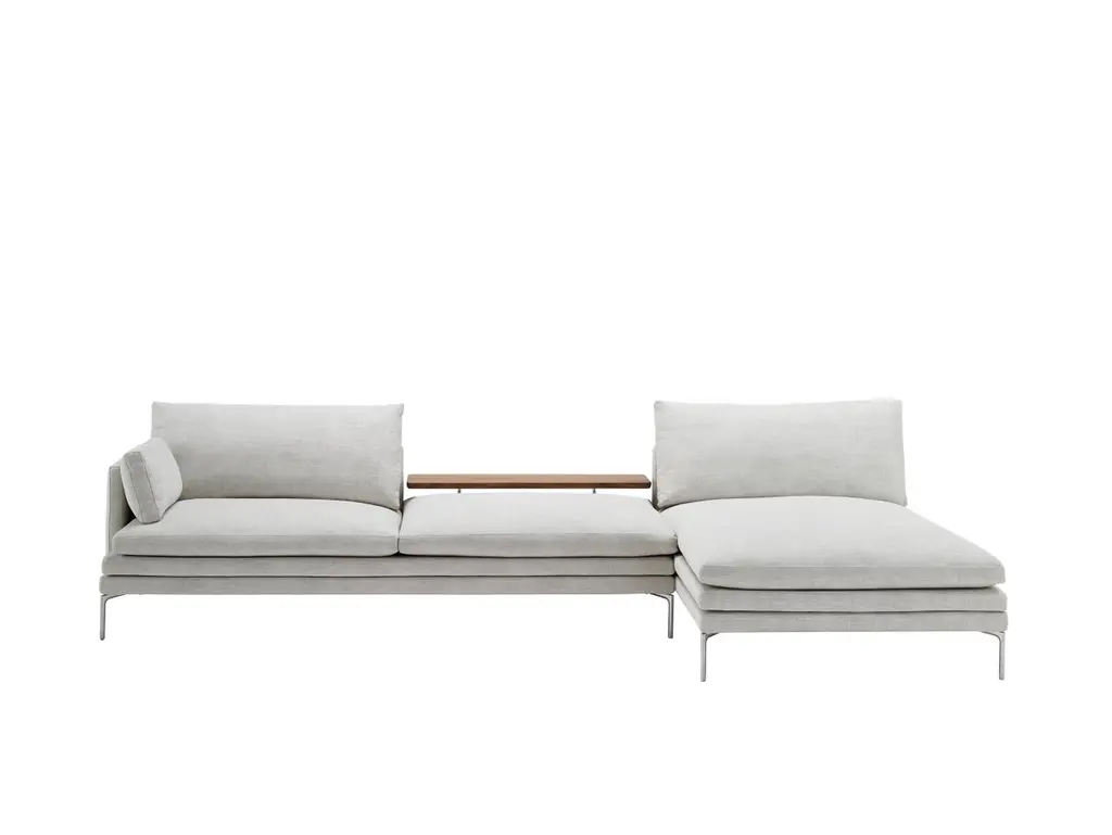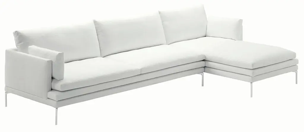Price listed is for the starting FABRIC. Armchair, monobloc, modular sofas, pouf, day bed and shelves. Aluminum alloy feet, either polished or with natural or black nickel-satin finish, or black painted. Steel frame. Elastic strips suspension. Upholstery in polyurethane/ heat-bound polyester fibre. Seat, back and armrest cushions upholstered with goose down. Removable fabric or leather cover. The lounge chairs without armrest and the end-sofas are fit to arrange a solid wood shelf, in natural or grey painted oak or in natural painted Canaletto walnut. Shelf supports in polished, with natural or black nickel- satin finish, or black painted aluminum.The new range of William monobloc, modular sofas and lounge chairs, designed by the British Damian Williamson enters the Zanotta 2015 catalogue to complete the upholstered range that has been a best seller for the living area since 2010.The William range, featuring its recognizable upholstered thin layers for the basic frame and the aluminum feet, comes to its completion thanks to the lounge chair modules and the solid oak or Canaletto walnut shelves.